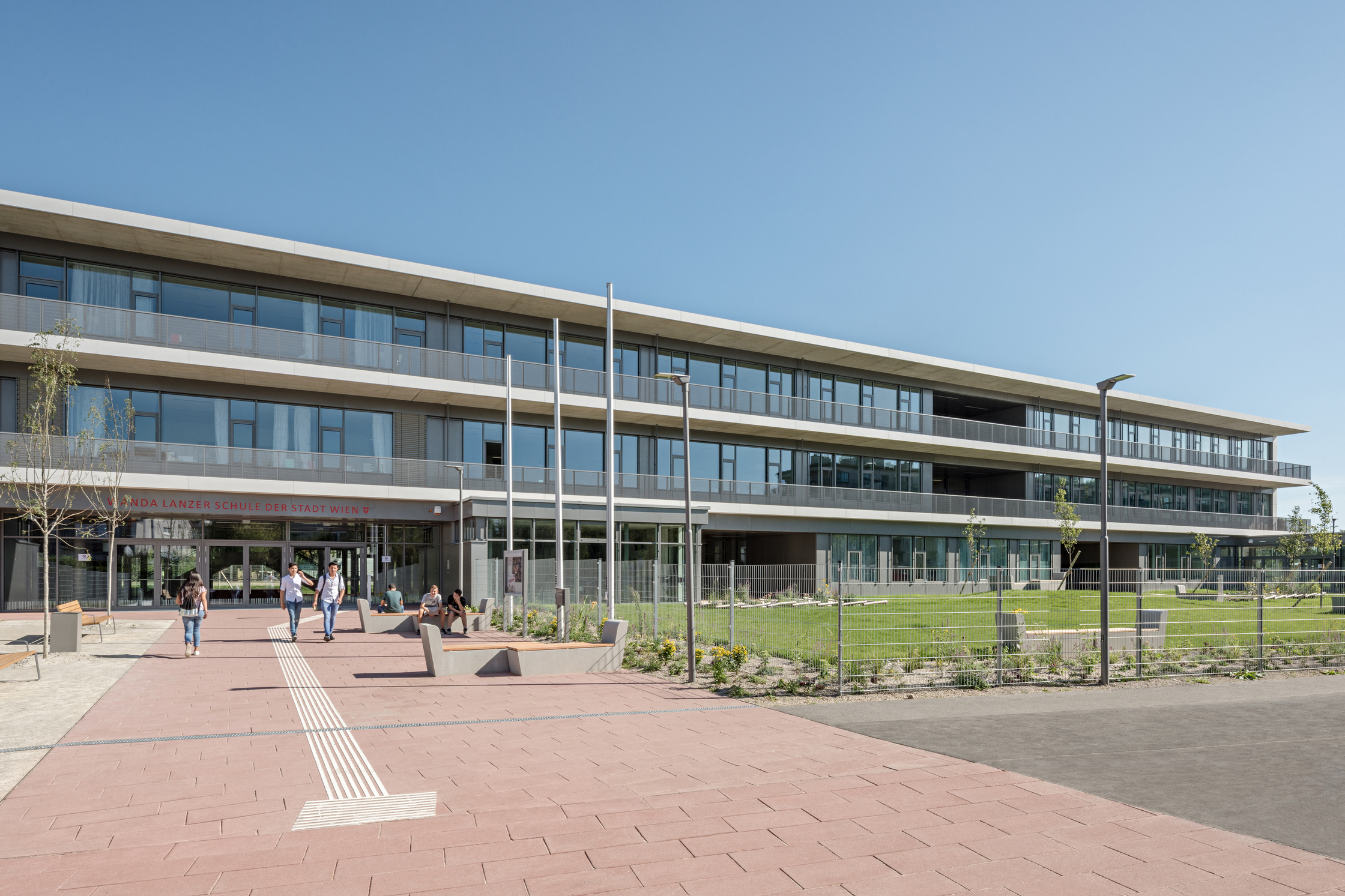 Ihr Anliegen, hier ein angenehmes Entree samt Schwellenraum zum Gehweg mit Verweilqualität zu schaffen, löste die Architektin einerseits mit dem Abrücken von der Baulinie und einer „Faltung“ der zweigeschoßigen Schulfassade. Es rhythmisiert die Länge und bringt durch schräg gestellte zweigeschoßige Verglasungen Licht und Außenbezug in die dahinter liegende interne Spiel- und Erschließungsstraße des kammförmigen Gebäudes, setzt sie aber nicht frontal der Straße aus. Ein Text der Künstlerin Ingeborg Kumpfmüller, der das Gemeinsame in den Vordergrund stellt (auf dem Foto noch nicht zu sehen) wertet zudem die Ansicht auf.