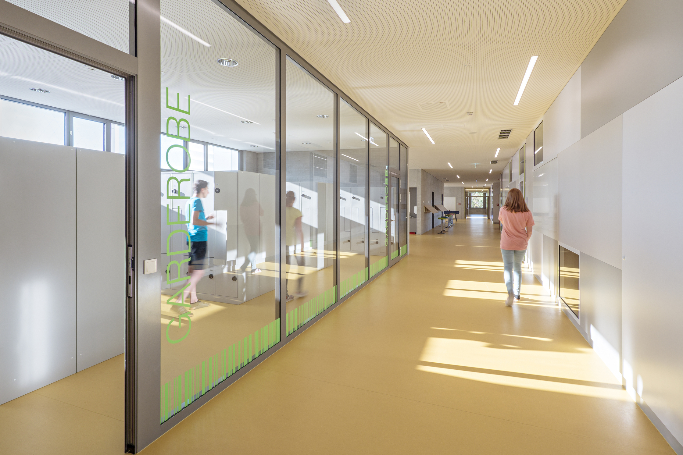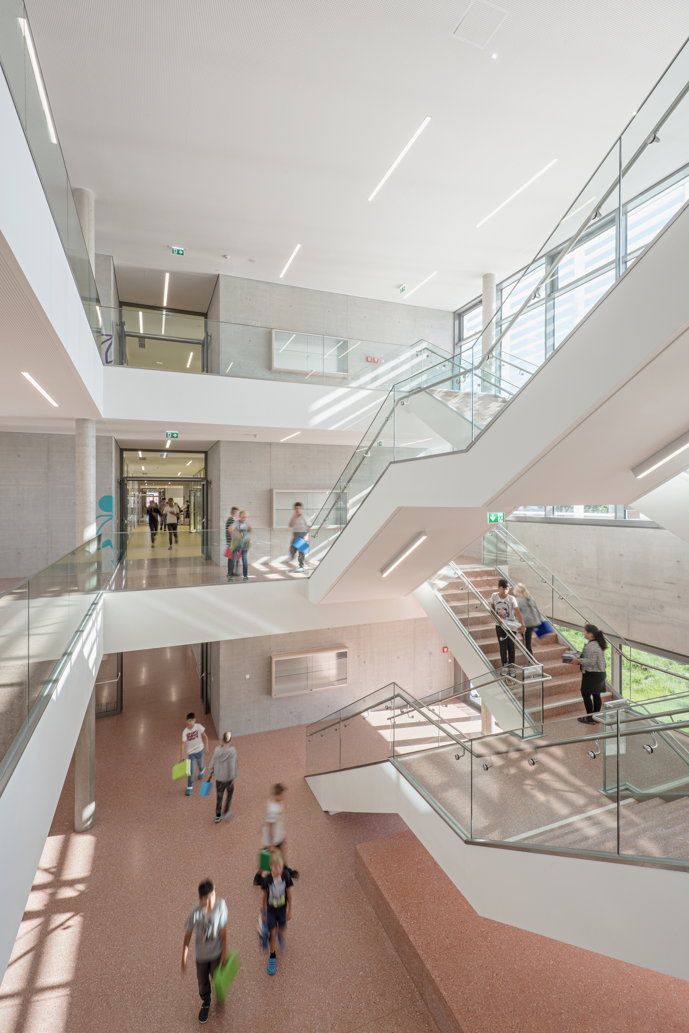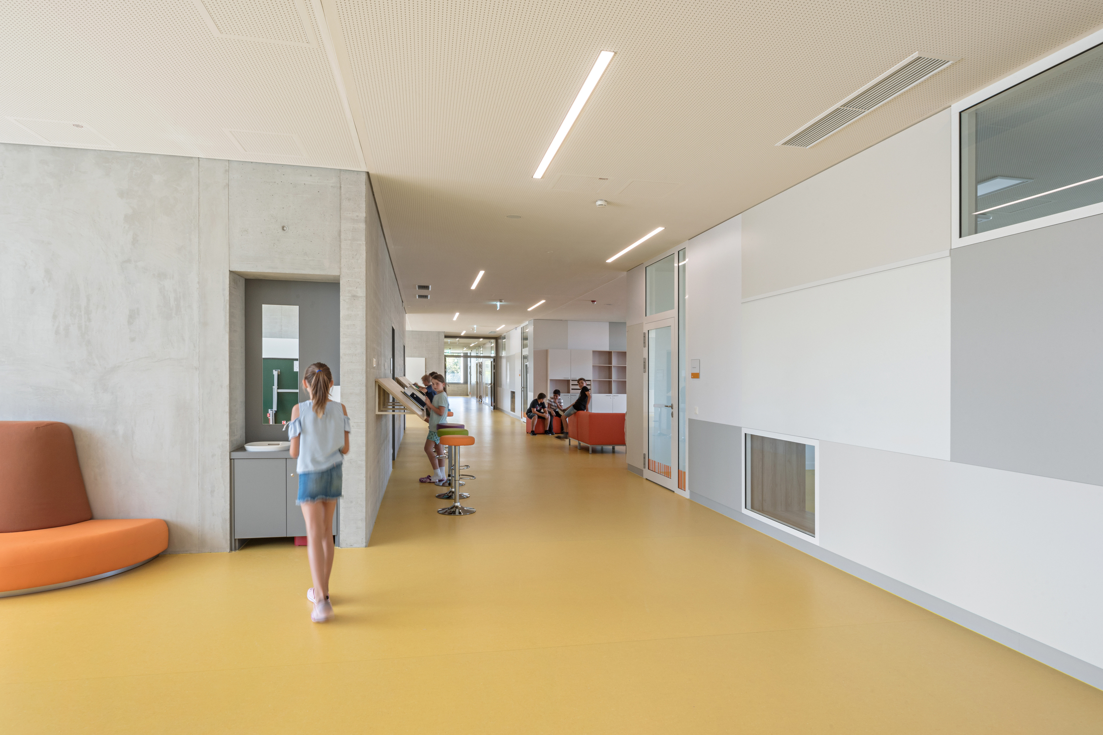 Schule und Wohnheim haben separate Zugänge, zwecks Raum- und Budgetökonomie hat Veselinović sie so ineinander verschränkt, dass ein Lift beide Einheiten erschließen kann. Die Bildungsräume organisierte sie als Cluster in den gartenseitigen „Fingern“, zwischen denen die kleinen, aber feinen Freiräume (gestaltet von DnD Landschaftsplanung) liegen. Der Luftraum der Aula und das Lichtatrium zwischen den Turnräumen im Untergeschoß verweben die Geschoße.