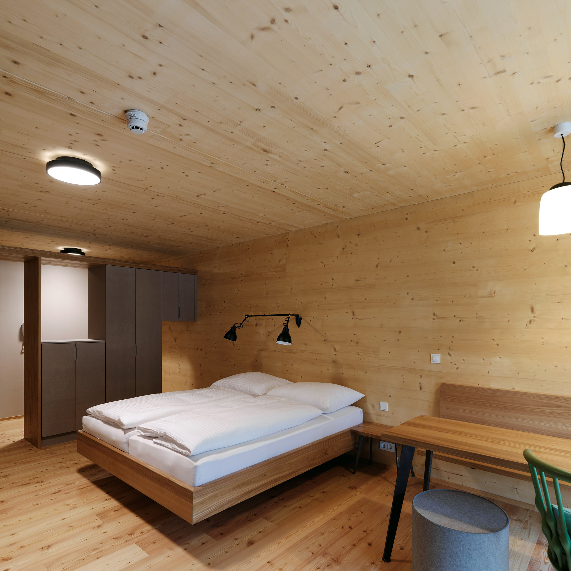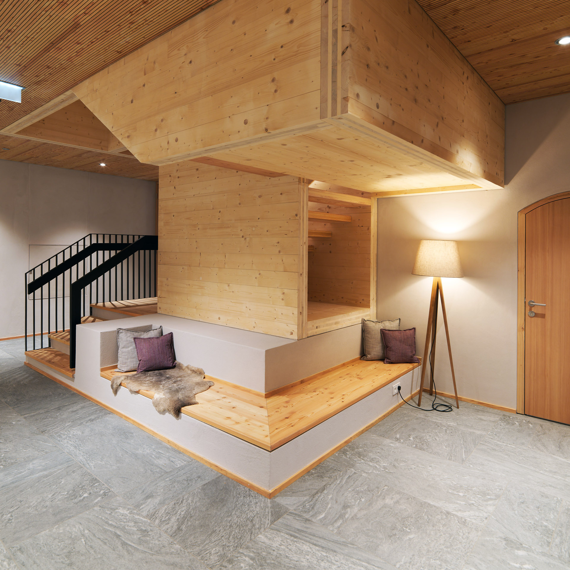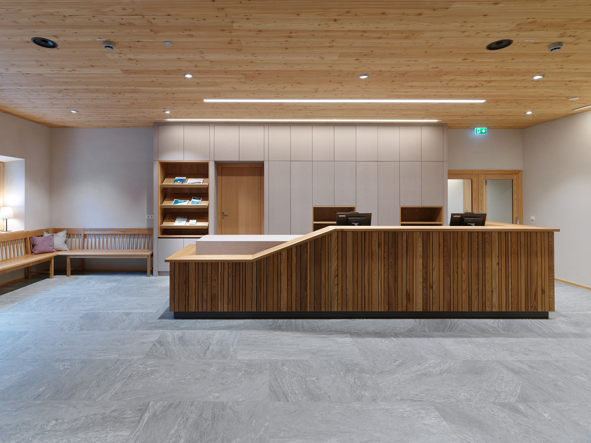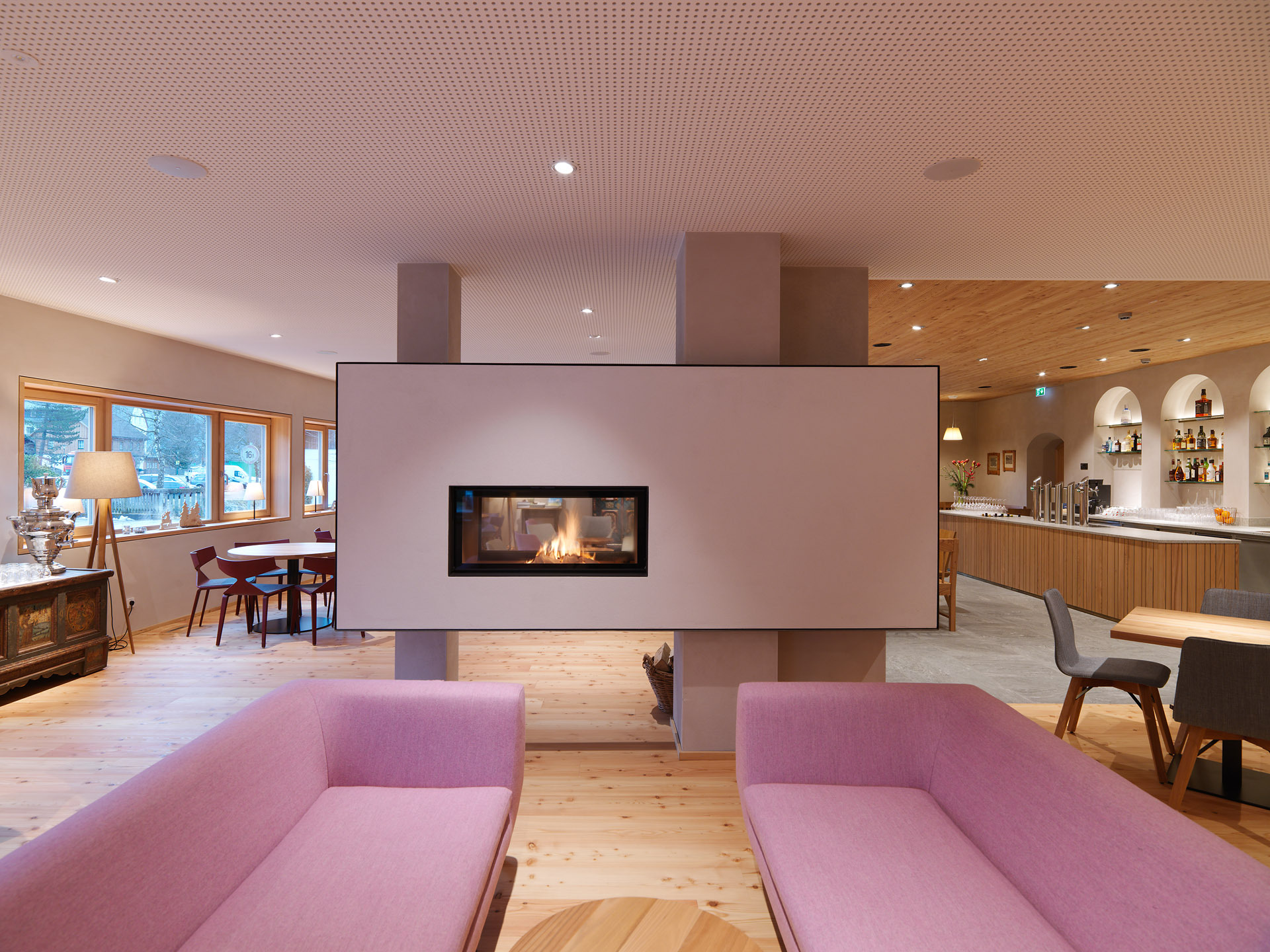 Im Innenbereich dominieren massives Holz (großteils naturbelassen bzw. geölt), durchgefärbte MDF-Platten, Stein bzw. Feinsteinzeug, Kalk-Zement Putze und Kalk- und Silikatfarben.
