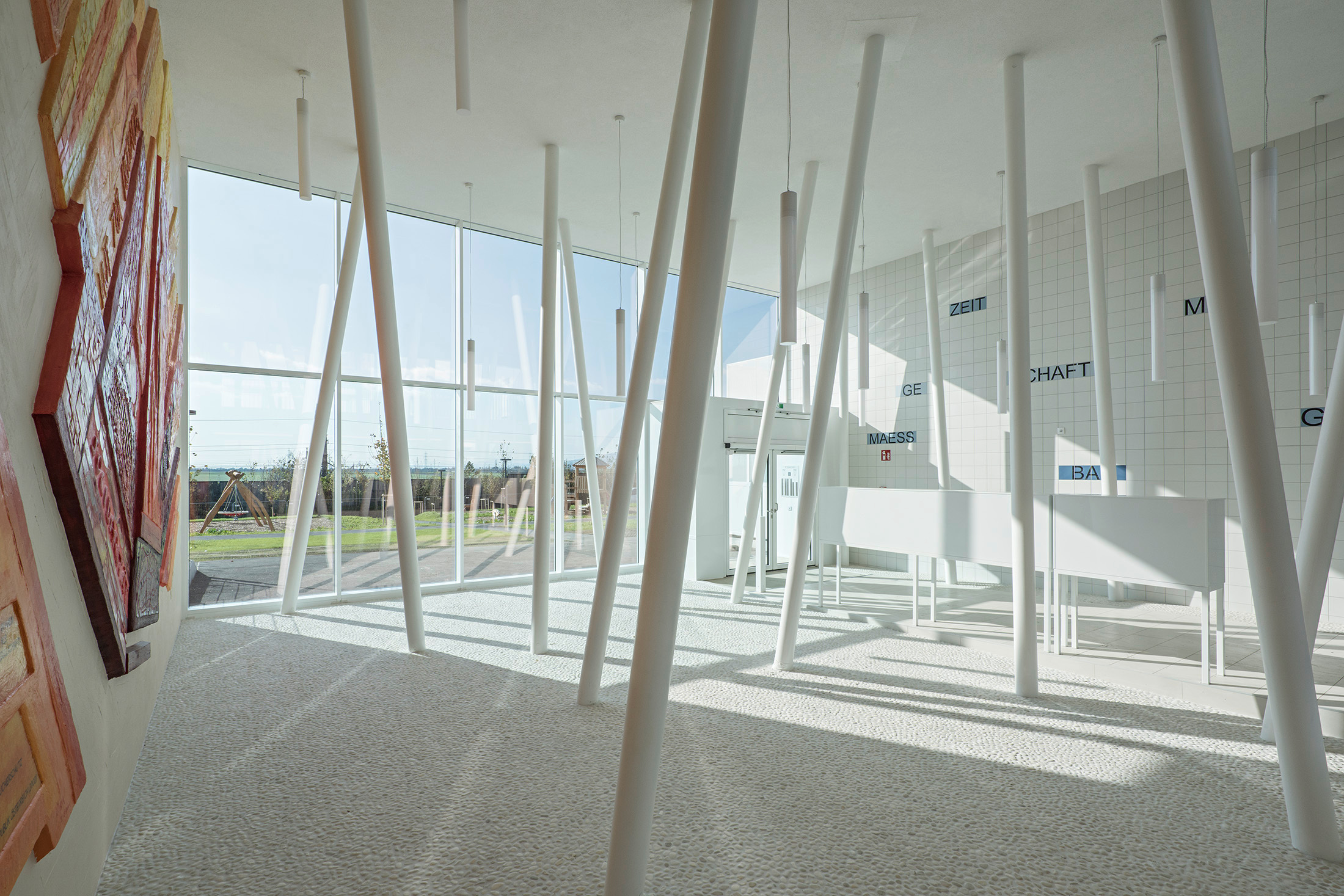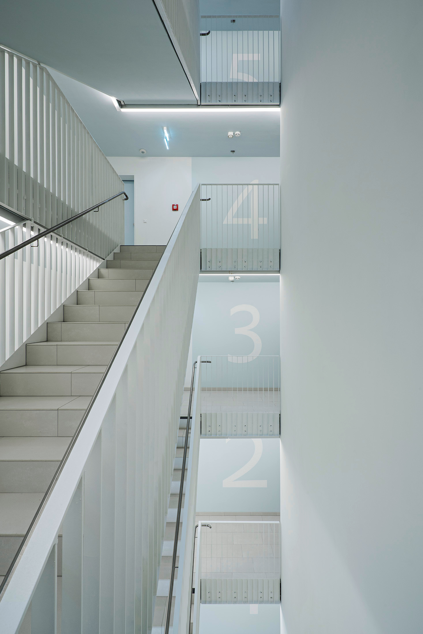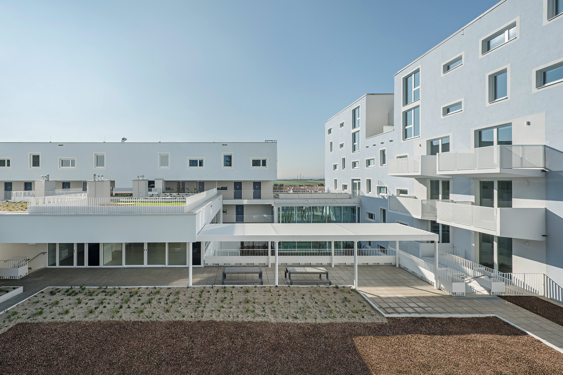Die in einem dialogischen Verfahren ermittelte städtebauliche Vorgabe bestand darin, drei unterschiedlich hohe Baukörper auf einem Sockel zu platzieren. Der Entwurf aus dem Büro NMPB, verantwortet vom „B“ dieses Akronyms, Sascha Bradic, deutet diese Vorgabe um. Er stellt einen massiven Block auf seinen Bauplatz und nimmt dann wie ein Bildhauer Masse weg. Durch dieses umgekehrte Verfahren – Subtraktion statt Addition – entstehen drei unterschiedliche, schön proportionierte Innenhöfe und Terrassen, die gemeinsam das Herz der Anlage bilden. Die Wohnungen sind kompakt und gut nutzbar, verfügen über Balkon oder Loggia und bieten eine Vielfalt von Typen, fünf Maisonetten eingeschlossen. Das Haus hat eine repräsentative Eingangshalle mit tanzenden Säulen, die nicht nur den Kindern gefallen. Die Zugänge zu den Wohnungen sind großzügig, Lufträume verbinden die Geschoße und bringen Licht von oben. (Unter dem aktuellen Regime des Brandschutzes in Wien braucht es dafür einen besonderen Kampfgeist; an der Vorgabe, die Lufträume im Brandfall alle zwei Geschoße horizontal abzuschotten, hätten die meisten Planer resigniert.)