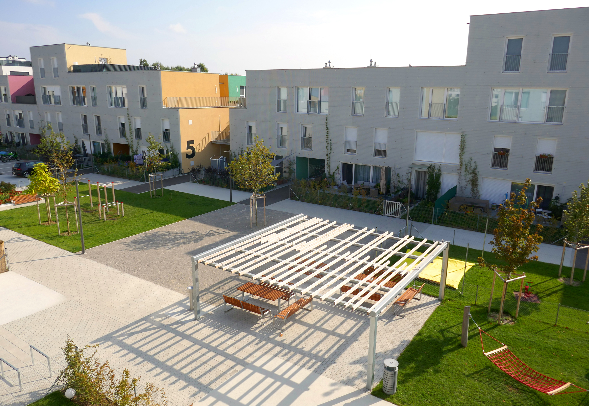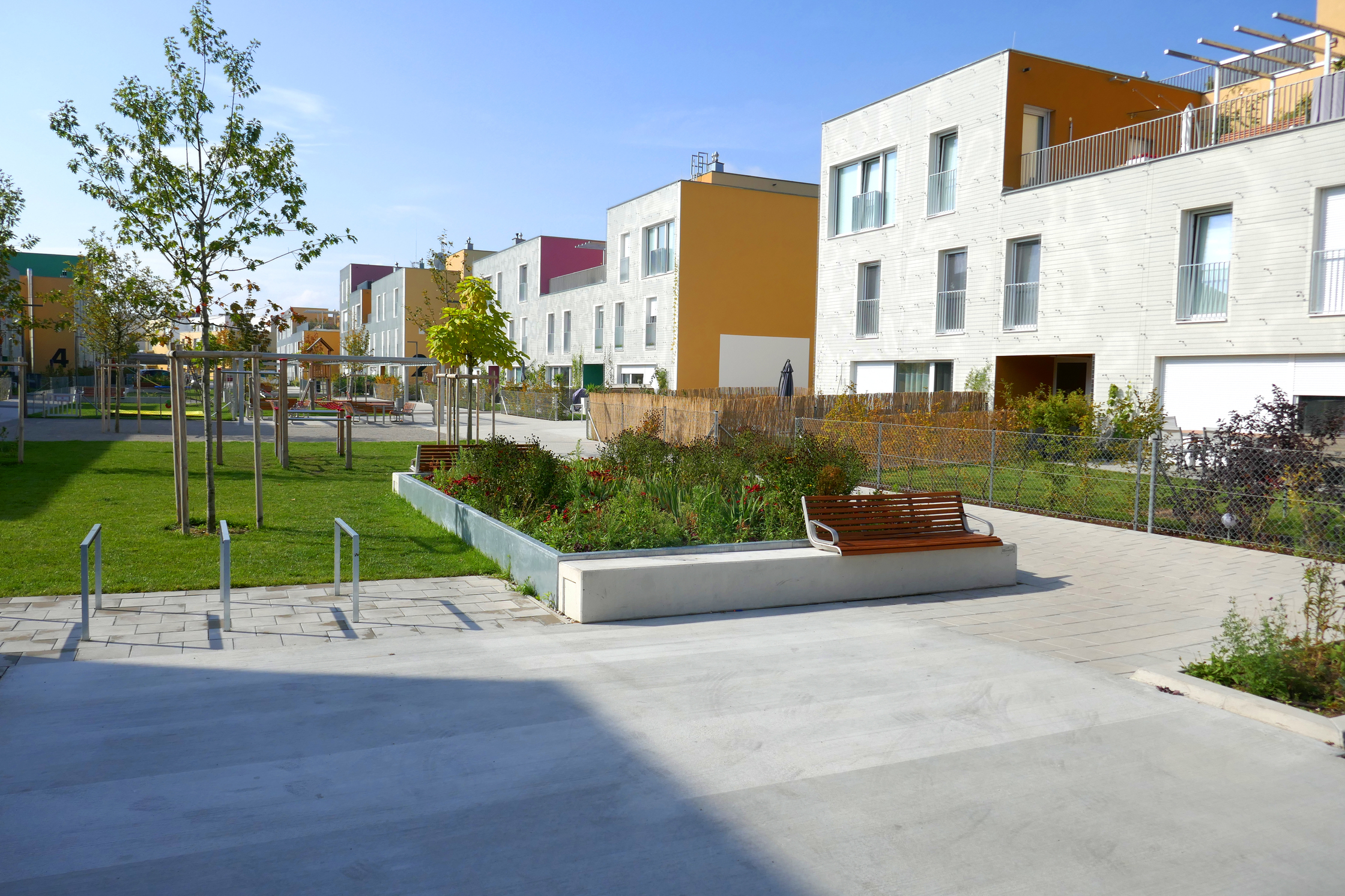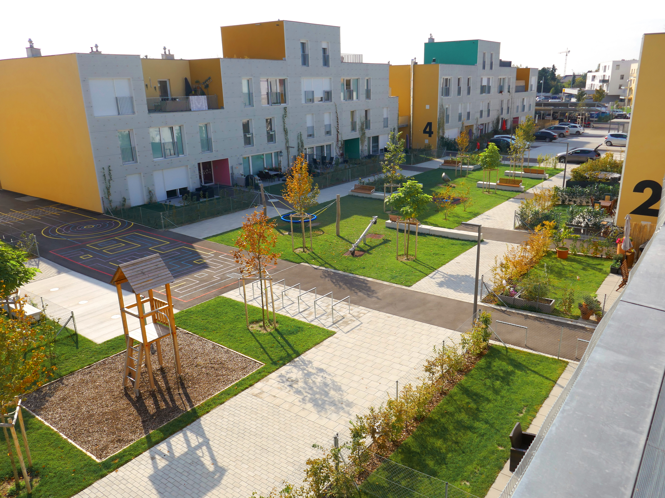 Wer unbedingt ein eigenes Fahrzeug benötigt, so der Plan von Querkraft Architekten und Architekt Thomas Moosmann, der soll am Rande des Angers parken und die Mitte zum Spielen und Spazierengehen frei lassen. Je weniger Menschen parken, desto größer der unverparkte Dorfplatz im Zentrum der Anlage. Um den Umstieg auf Sharing Economy zu versüßen, wurde ein Mobility-Point mit E-Bikes, E-Scootern und Elektroautos samt Steckdose errichtet. 2018 wurden die Wohnungen übergeben.