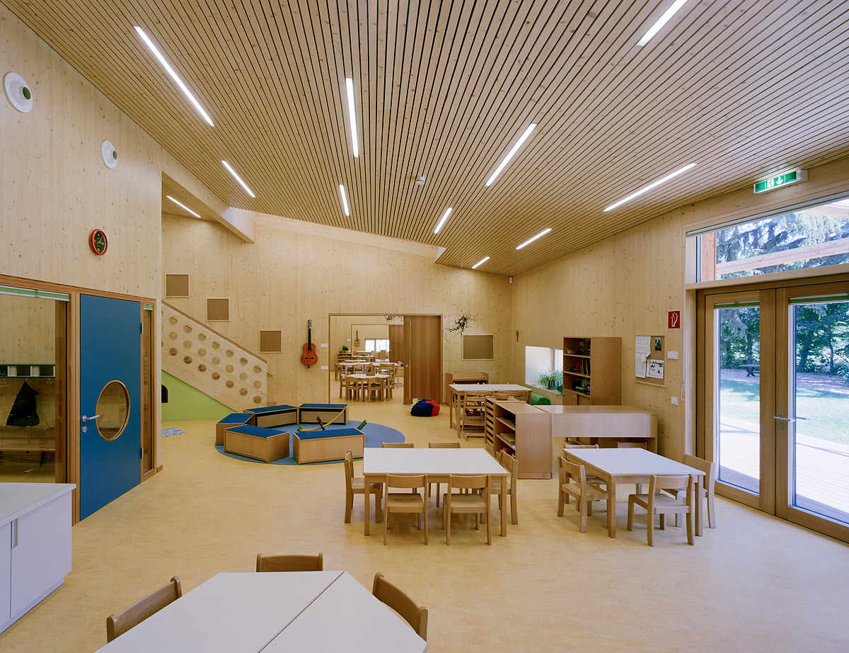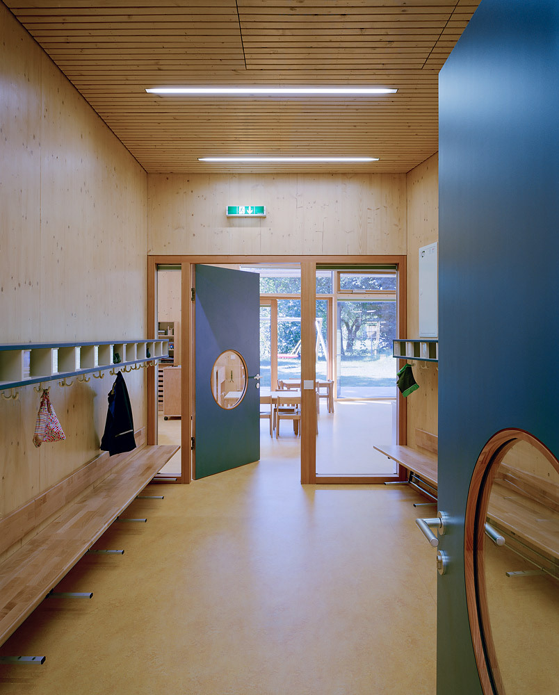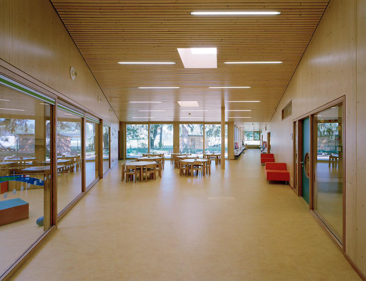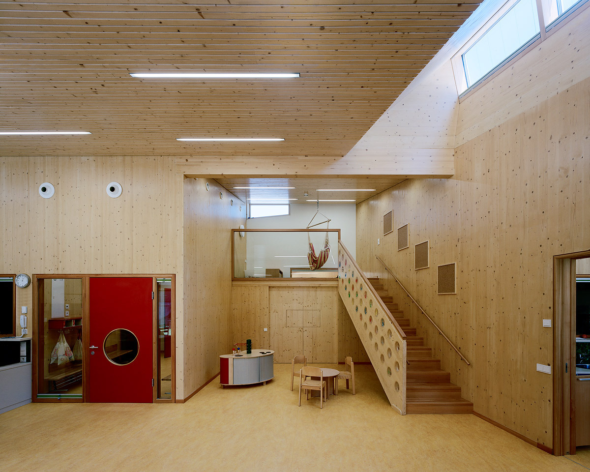Im Hinblick auf die kurze Bauzeit wurde eine trockene Bauweise mit vorgefertigten Kreuzlagenholz-Elementen gewählt.