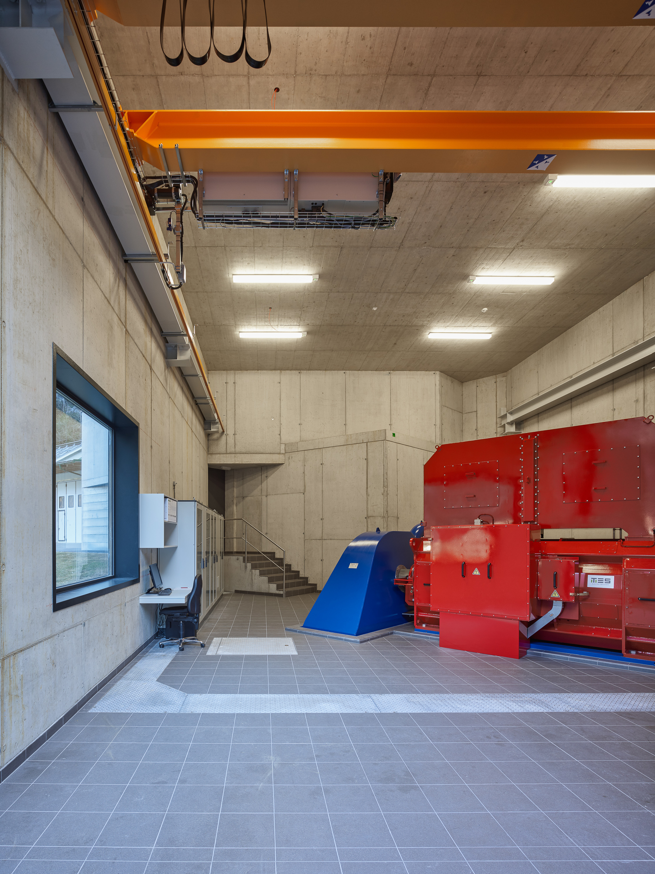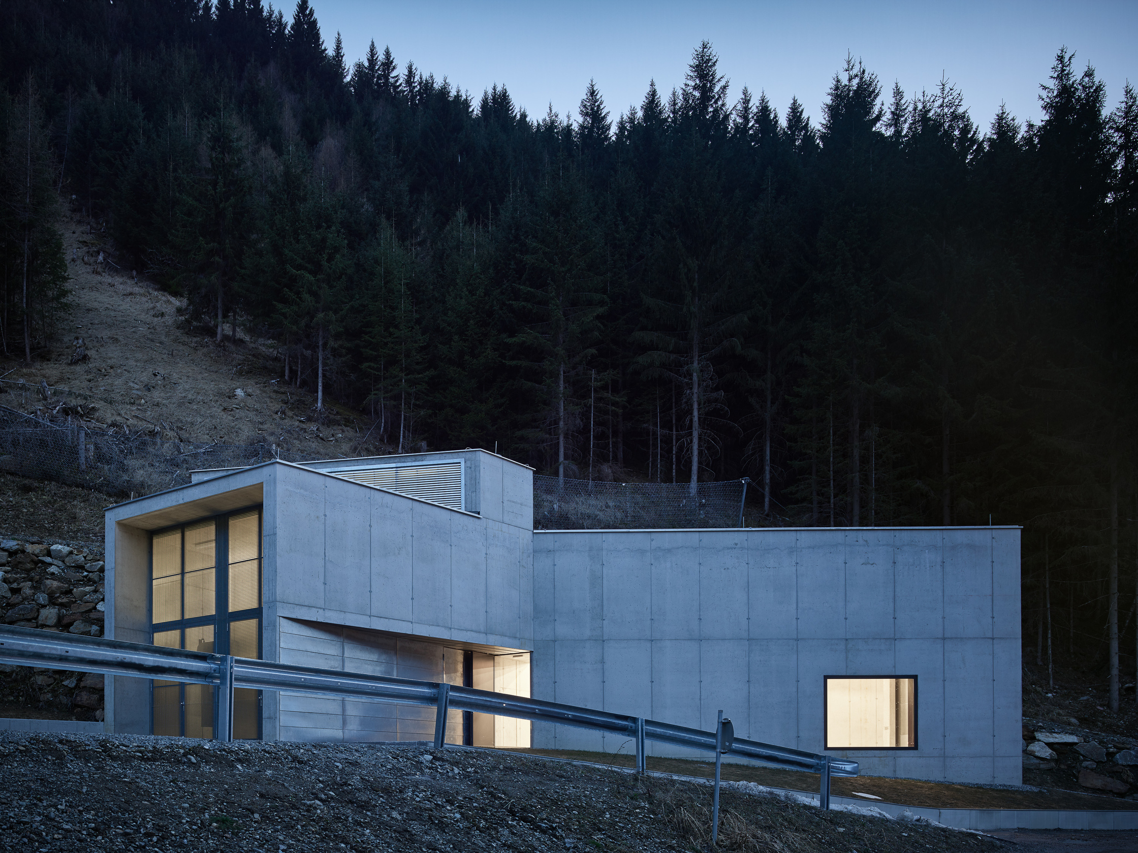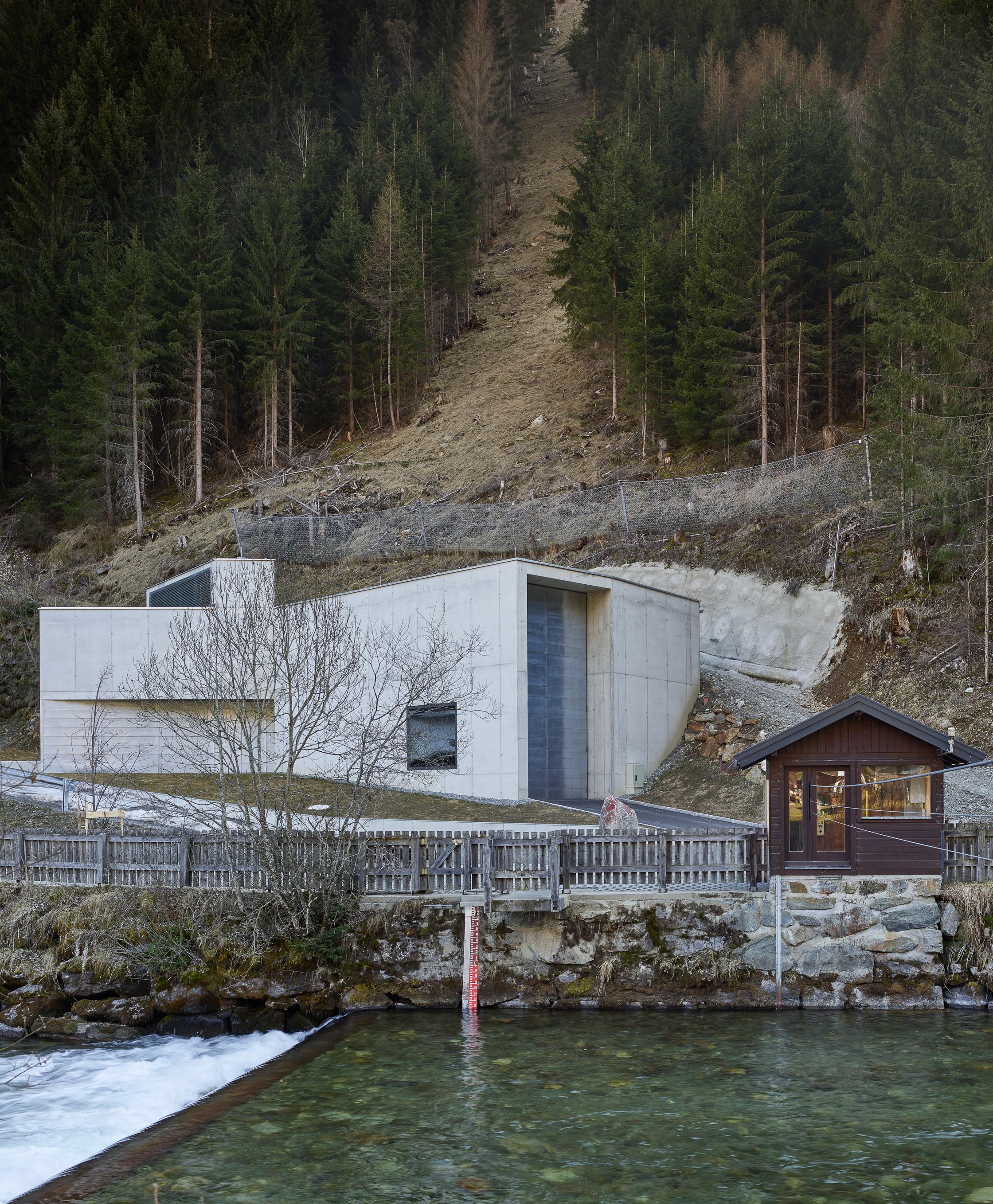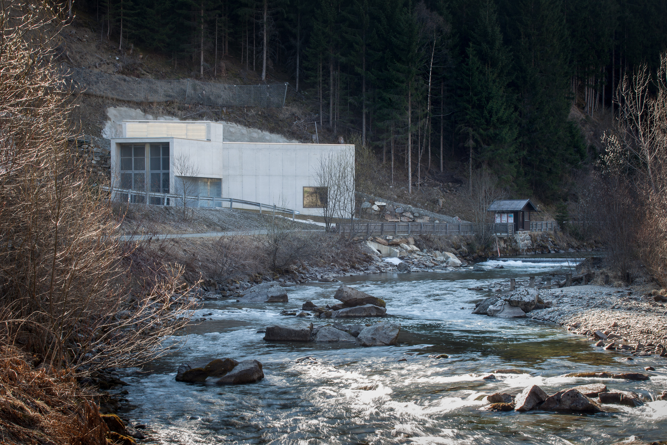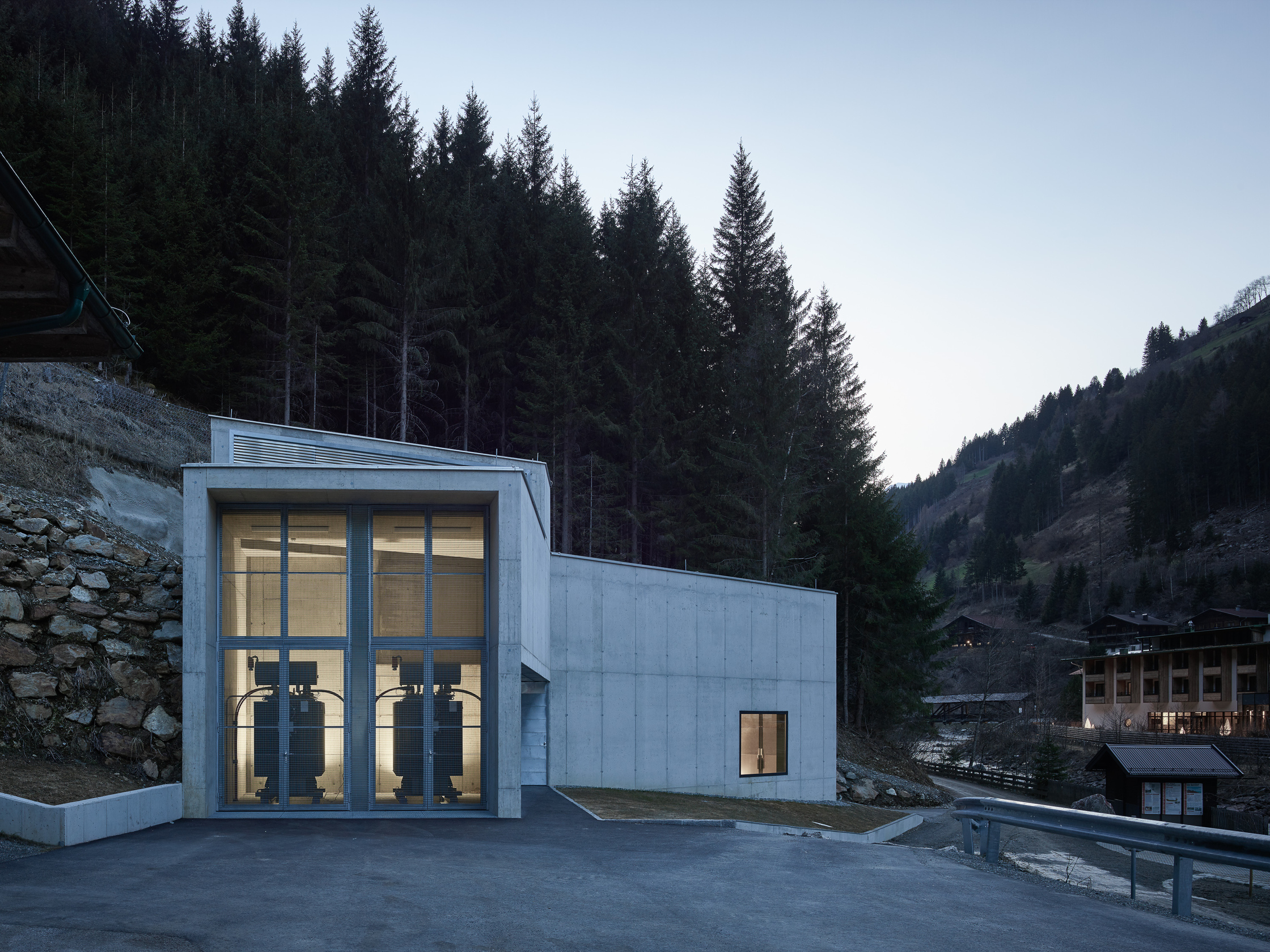 Das Kraftwerk erhebt sich in einer kleinen Aufweitung des Tales am Ufer des Zwenewaldbaches. Wie ein passgenau gearbeitetes Werkstück haben Schneider & Lengauer das Haus in den knapp bemessenen Bauplatz gefügt. Es reagiert mit seinem abgewinkelten Körper auf die gegebenen Zufahrten und wahrt so die Möglichkeit zur Anlieferung von Turbinen und Transistoren. Auch der schräge, mit Metall belegte Einzug der Fassade, der auf den in der Innenecke geschützten Mitarbeiterzugang zuläuft, die Überhöhung des Daches über dem Knick zur Aufnahme von Lüftungsöffnungen, das eine große Fenster, mit dem die Turbinenhalle den Fluss überblickt, und auch die gebäudehohen Portale an den Stirnseiten des Baukörpers sind allesamt dem reibungslosen Arbeitsablauf geschuldet. Gleichzeitig ergeben sie in ihrer Gesamtheit ein plastisch durchgeformtes Bauwerk, das sich mit größerer Selbstverständlichkeit in die Landschaft fügt als manches mit vermeintlich alpin-ländlichen Applikationen versehene Objekt. Das feine Schalungsbild des Sichtbetons, der Umsicht des Poliers zu verdanken, hält Schritt mit der sorgfältigen Planung der Gesamtanlage. Im Selbstbewusstsein seiner Funktionstüchtigkeit und der Qualität seiner Komposition stellt sich das Kraftwerk dem Dialog mit der Natur, dem rauschenden Wasser, den steil aufragenden Felswänden, dem dunklen Nadelwald.