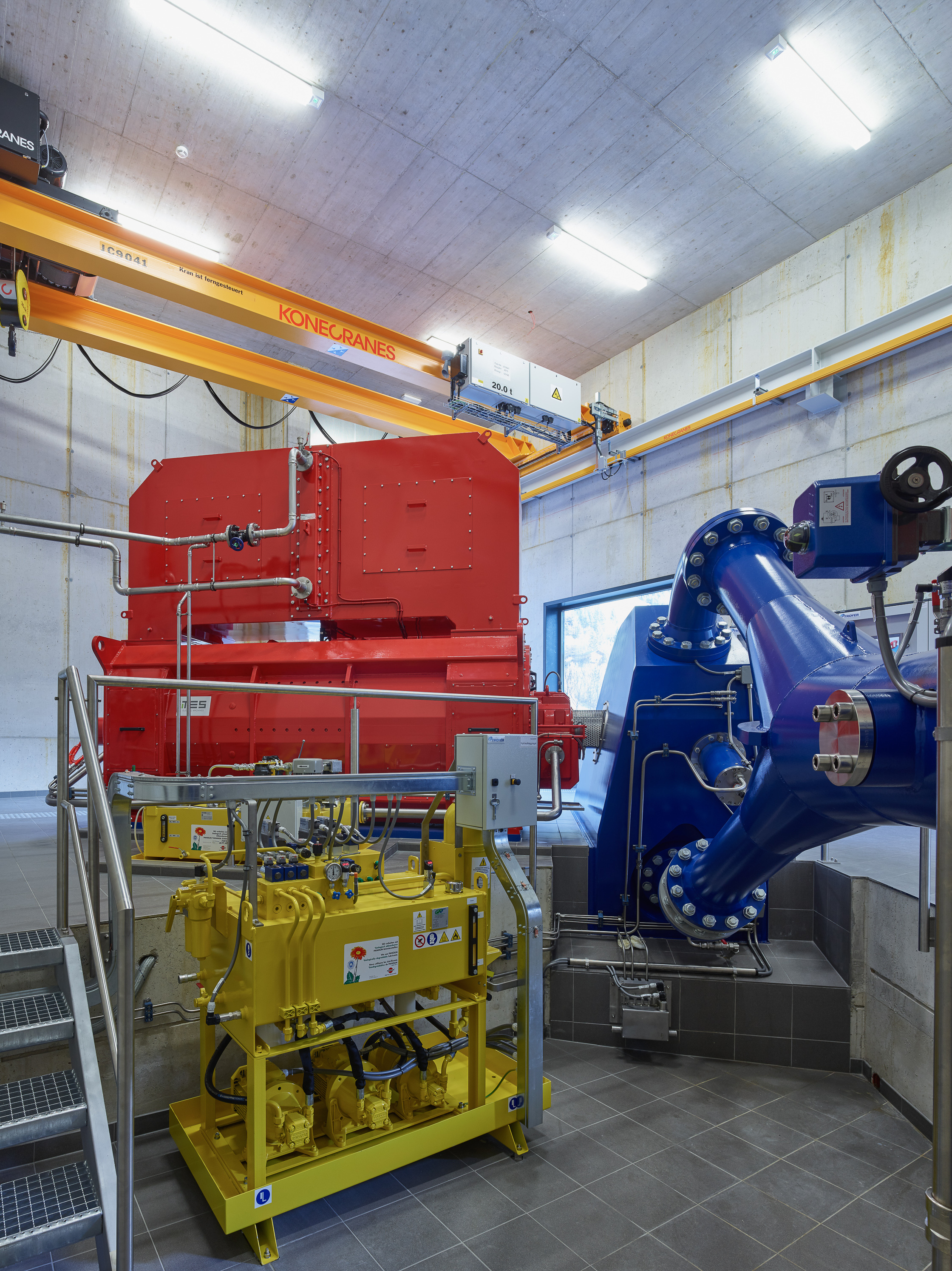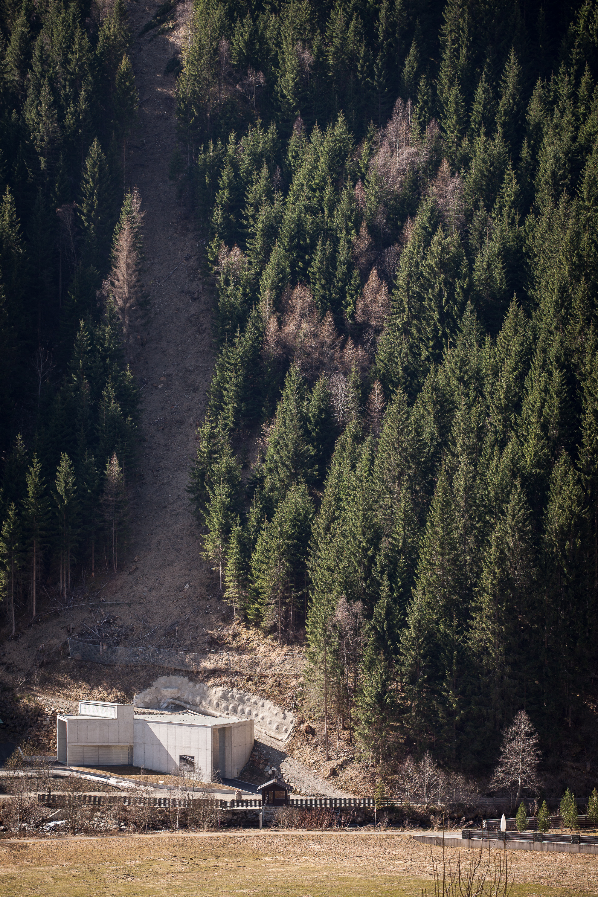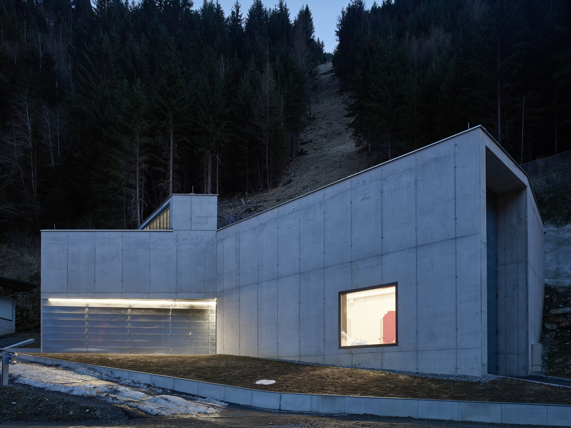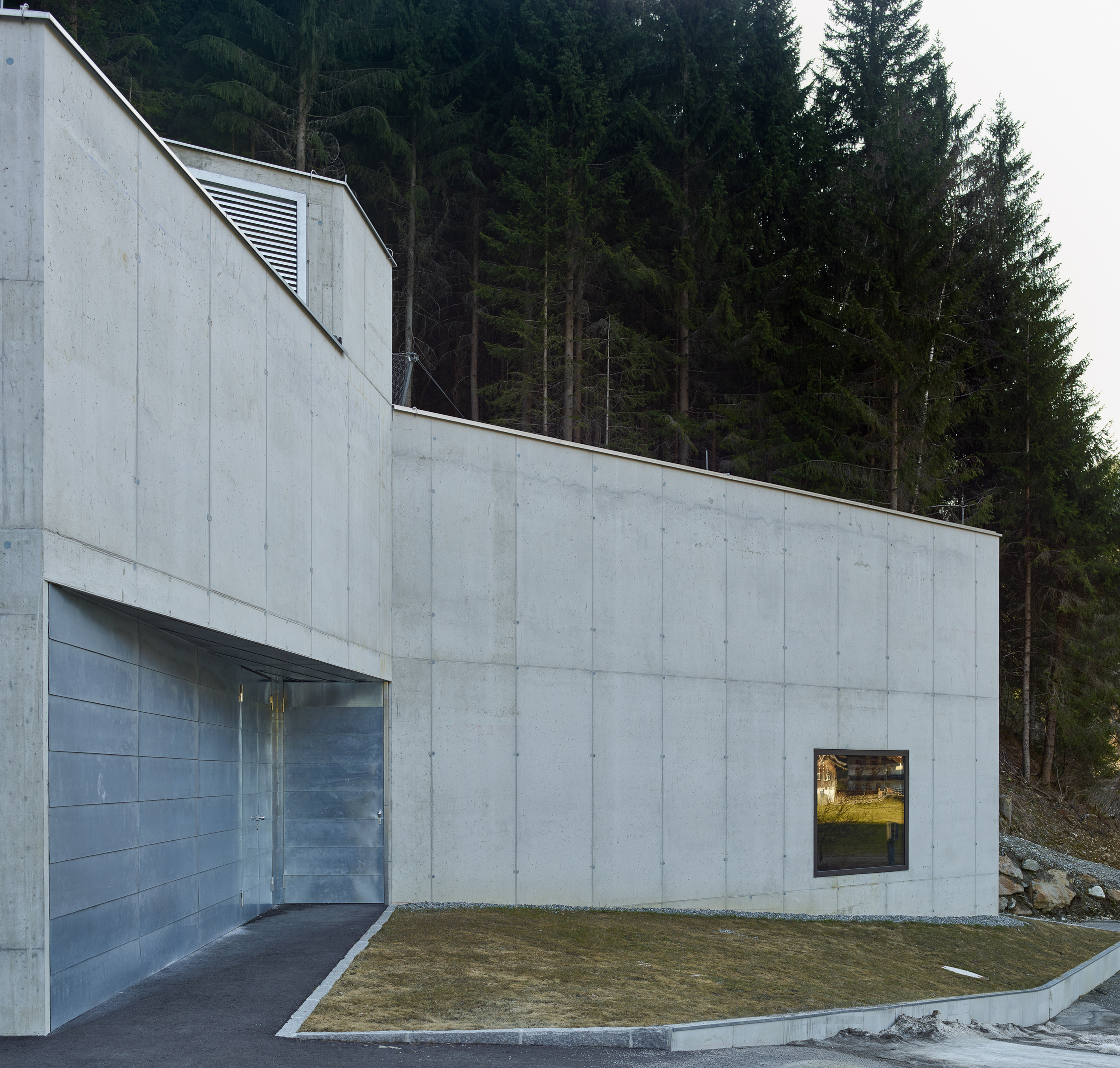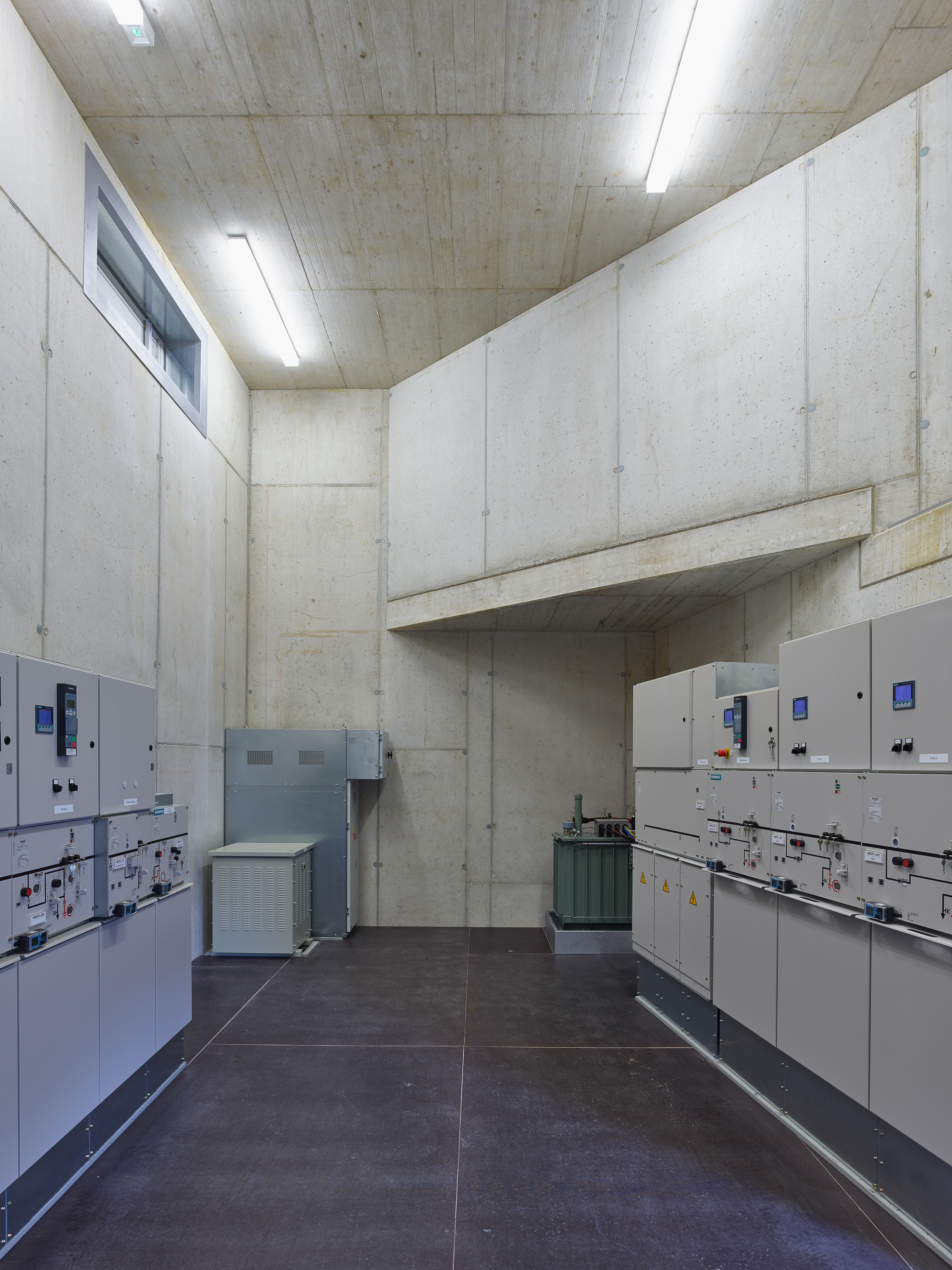 Das Kraftwerk erhebt sich in einer kleinen Aufweitung des Tales am Ufer des Zwenewaldbaches. Wie ein passgenau gearbeitetes Werkstück haben Schneider & Lengauer das Haus in den knapp bemessenen Bauplatz gefügt. Es reagiert mit seinem abgewinkelten Körper auf die gegebenen Zufahrten und wahrt so die Möglichkeit zur Anlieferung von Turbinen und Transistoren. Auch der schräge, mit Metall belegte Einzug der Fassade, der auf den in der Innenecke geschützten Mitarbeiterzugang zuläuft, die Überhöhung des Daches über dem Knick zur Aufnahme von Lüftungsöffnungen, das eine große Fenster, mit dem die Turbinenhalle den Fluss überblickt, und auch die gebäudehohen Portale an den Stirnseiten des Baukörpers sind allesamt dem reibungslosen Arbeitsablauf geschuldet. Gleichzeitig ergeben sie in ihrer Gesamtheit ein plastisch durchgeformtes Bauwerk, das sich mit größerer Selbstverständlichkeit in die Landschaft fügt als manches mit vermeintlich alpin-ländlichen Applikationen versehene Objekt. Das feine Schalungsbild des Sichtbetons, der Umsicht des Poliers zu verdanken, hält Schritt mit der sorgfältigen Planung der Gesamtanlage. Im Selbstbewusstsein seiner Funktionstüchtigkeit und der Qualität seiner Komposition stellt sich das Kraftwerk dem Dialog mit der Natur, dem rauschenden Wasser, den steil aufragenden Felswänden, dem dunklen Nadelwald.