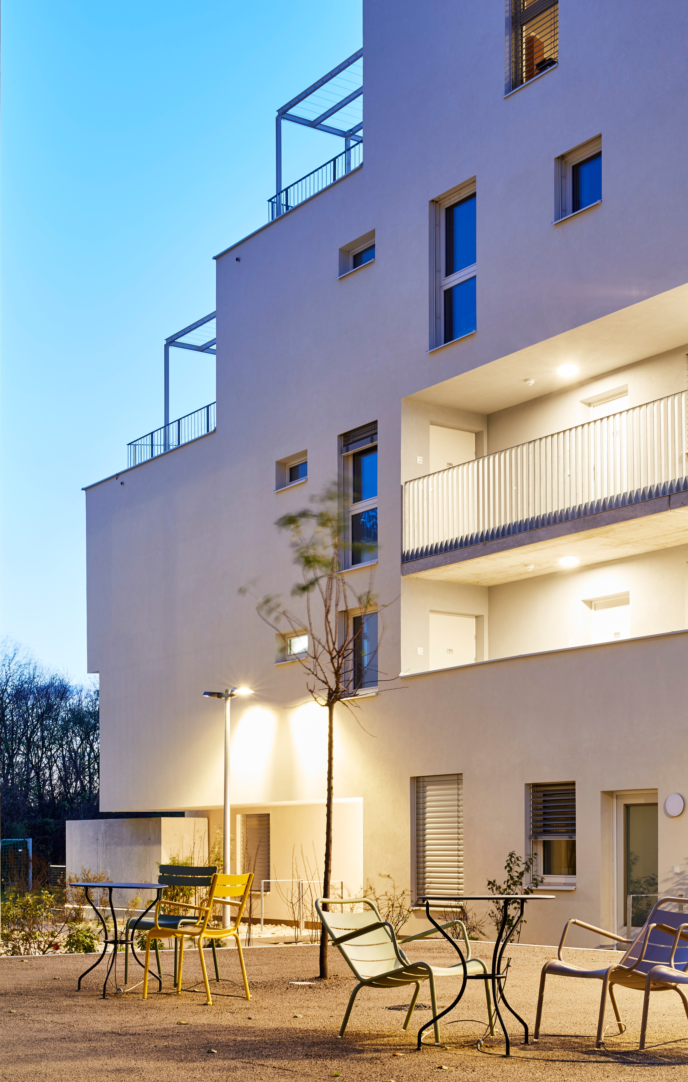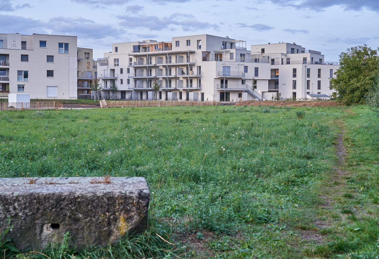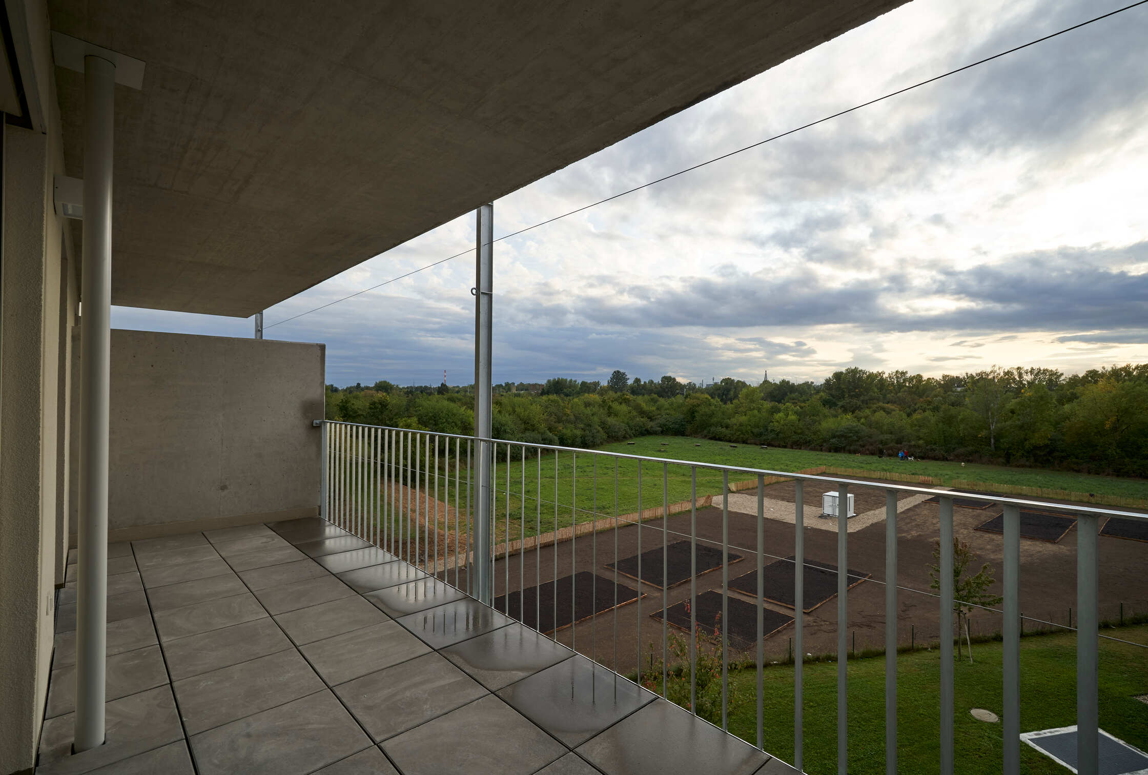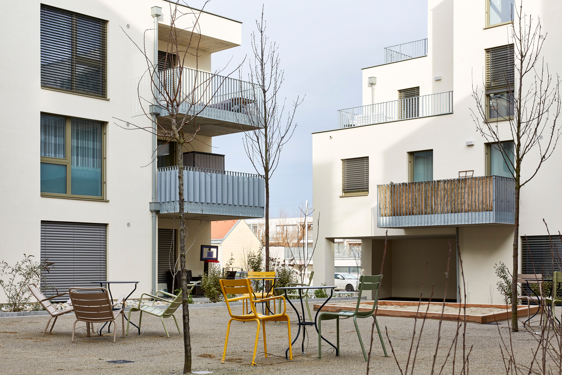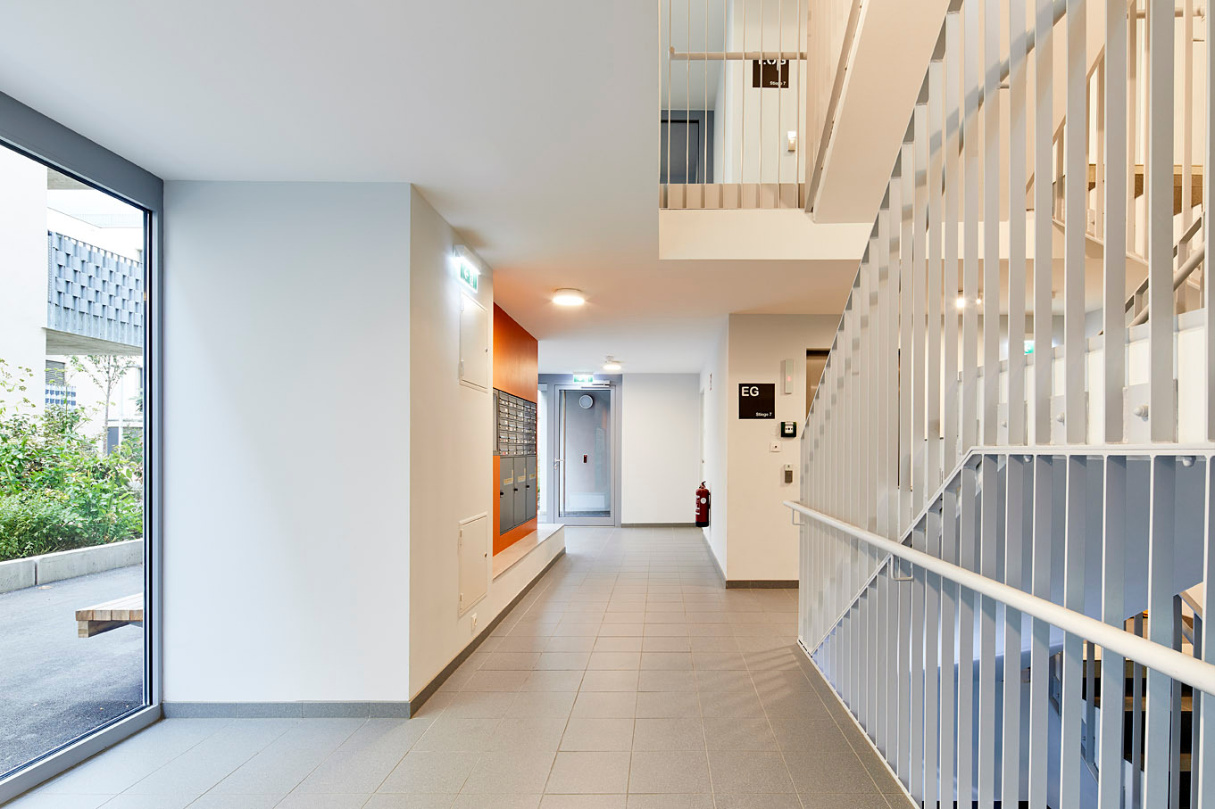 Die von Obstbäumen (bald) beschatteten Plätze mit ihren sandigen Oberflächen sind wie Podien von den Wegen abgesetzt und mit locker arrangierten Stühlen und Tischen möbliert, was sie wie private Gärten wirken lässt. Im Süden schließt der mit der Wohnanlage mitfinanzierte Gemeinschaftsgarten „Stadtgemüse 22“ an, der auch benachbarten Stadlauern offensteht. Auf marketingtechnisch gut verwertbare Extravaganzen wie Schwimmbäder oder Wellnessräume wurde verzichtet, dafür aber vergleichsweise bodenständig sinnvollen Lowtech-Angeboten liebevolle Aufmerksamkeit zuteil – im großen Stil beim Energiekonzept und der Gartengestaltung, im kleinen mit Annehmlichkeiten wie schlichten Betonbänken oder Stühlen in den Eingangsbereichen. Man wünscht sich mehr von dieser spektakulären Normalität anstatt der normal gewordenen Effekthaschereien.