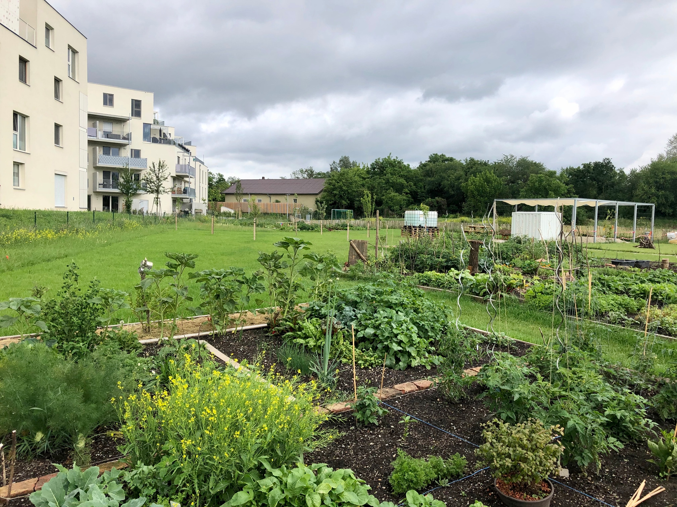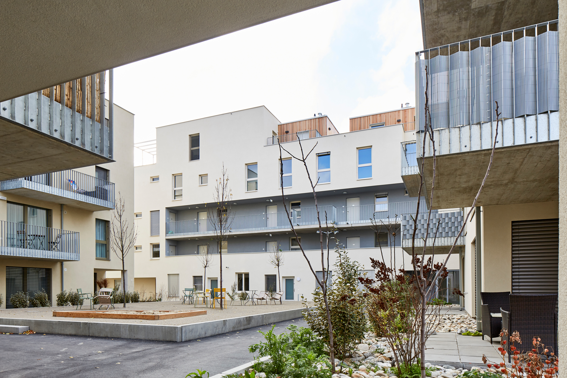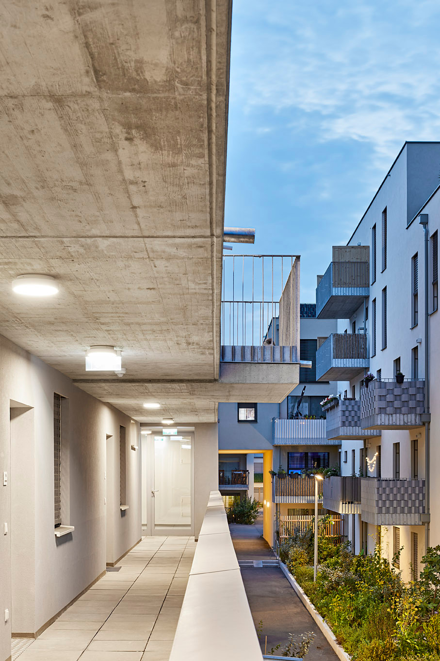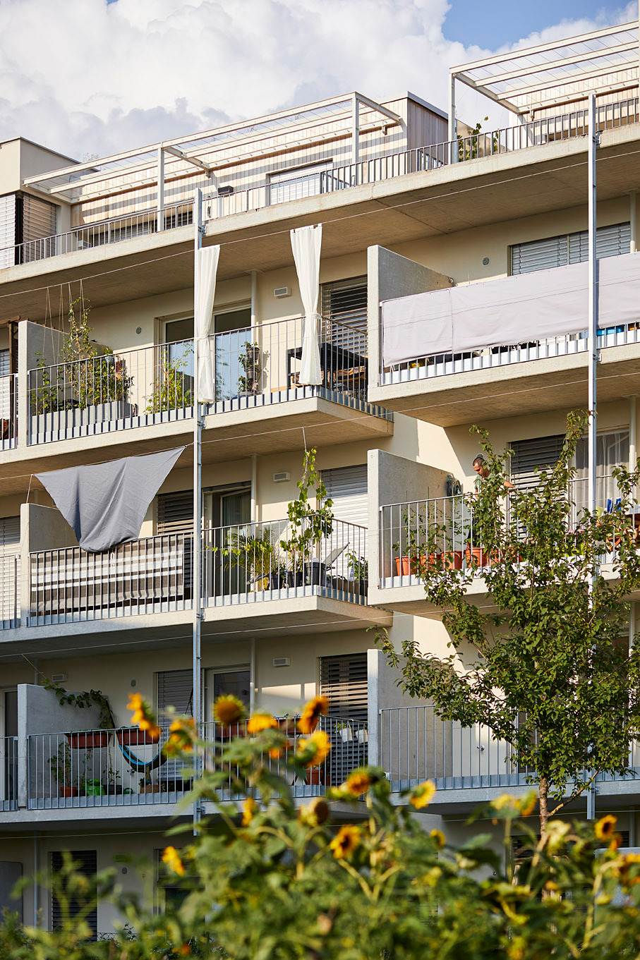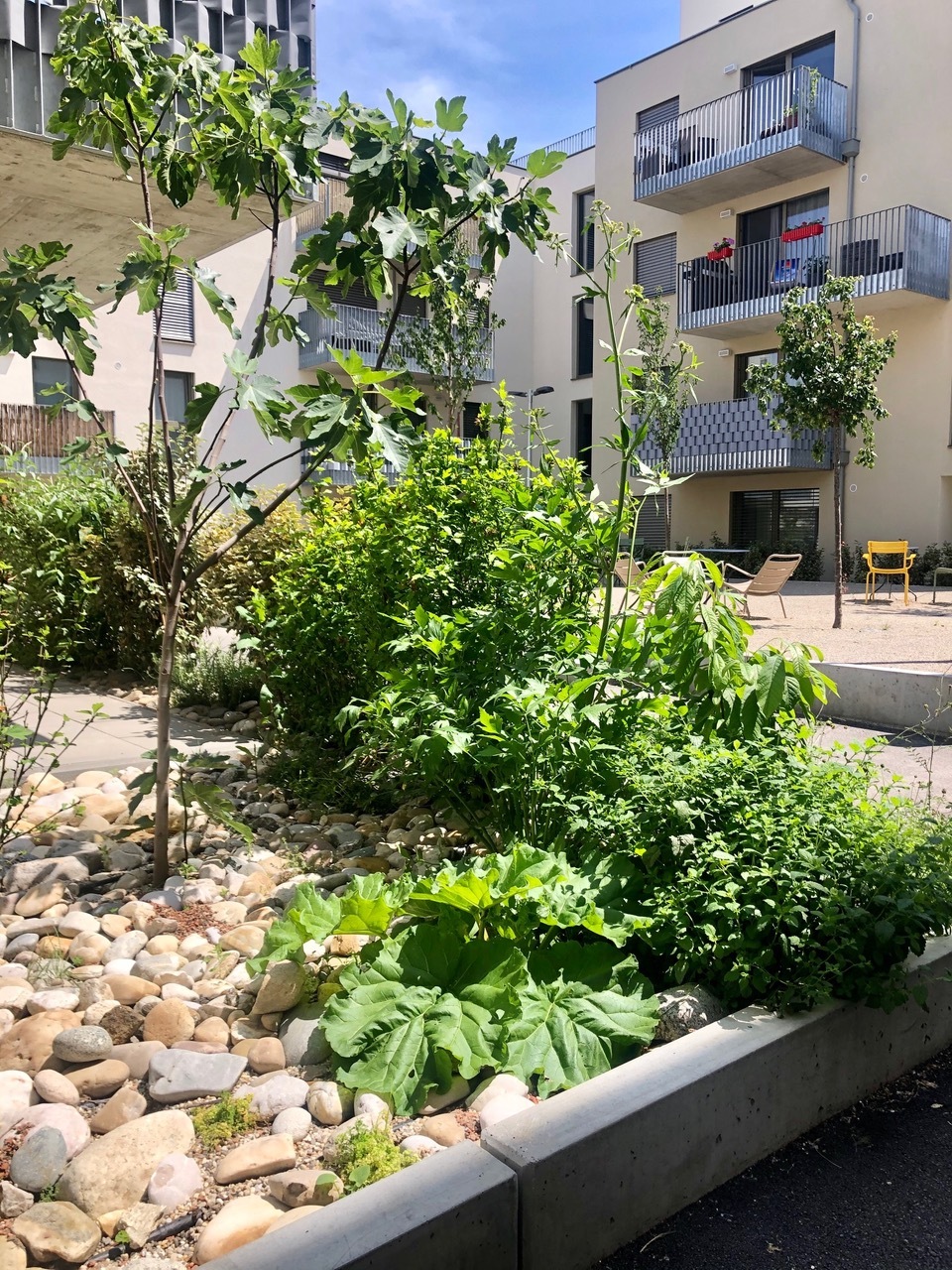 Dass man trotz zahlreicher Erdgeschoßwohnungen beim Durchschlendern nicht zur Voyeurin wird, ist der Freiraumgestaltung von Rajek Barosch Landschaftsarchitektur (Isolde Rajek, Oliver Barosch) zu danken, die mit von einer bemerkenswerten Vielfalt an Stauden und Sträuchern bewachsenen Rabatten zaunlos ausreichend Distanz zu den privaten Terrassen herstellt. Beraten vom Permakulturspezialisten Siegfried Tatschl, wurden sie nach dem Motto „Essbare Stadt“ bepflanzt. Neben Kräutern und Beeren wachsen Feigen, Felsenbirnen oder Exoten wie Indianerbananen und Szechuan-Pfeffer. Rankhilfen und eine moderierte Mieterbetreuung erleichtern es, das Konzept auf den Privatterrassen nach eigenem Gutdünken fortzusetzen.