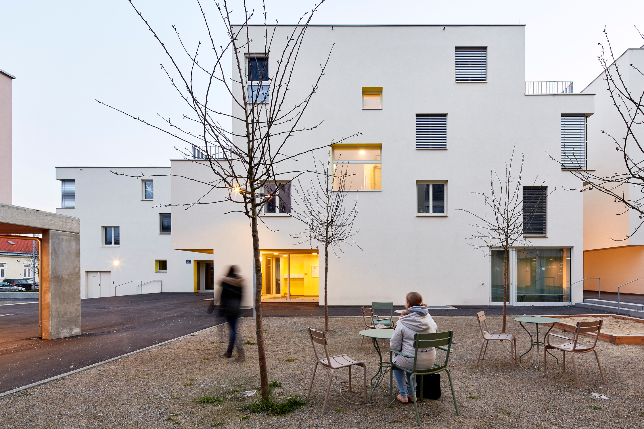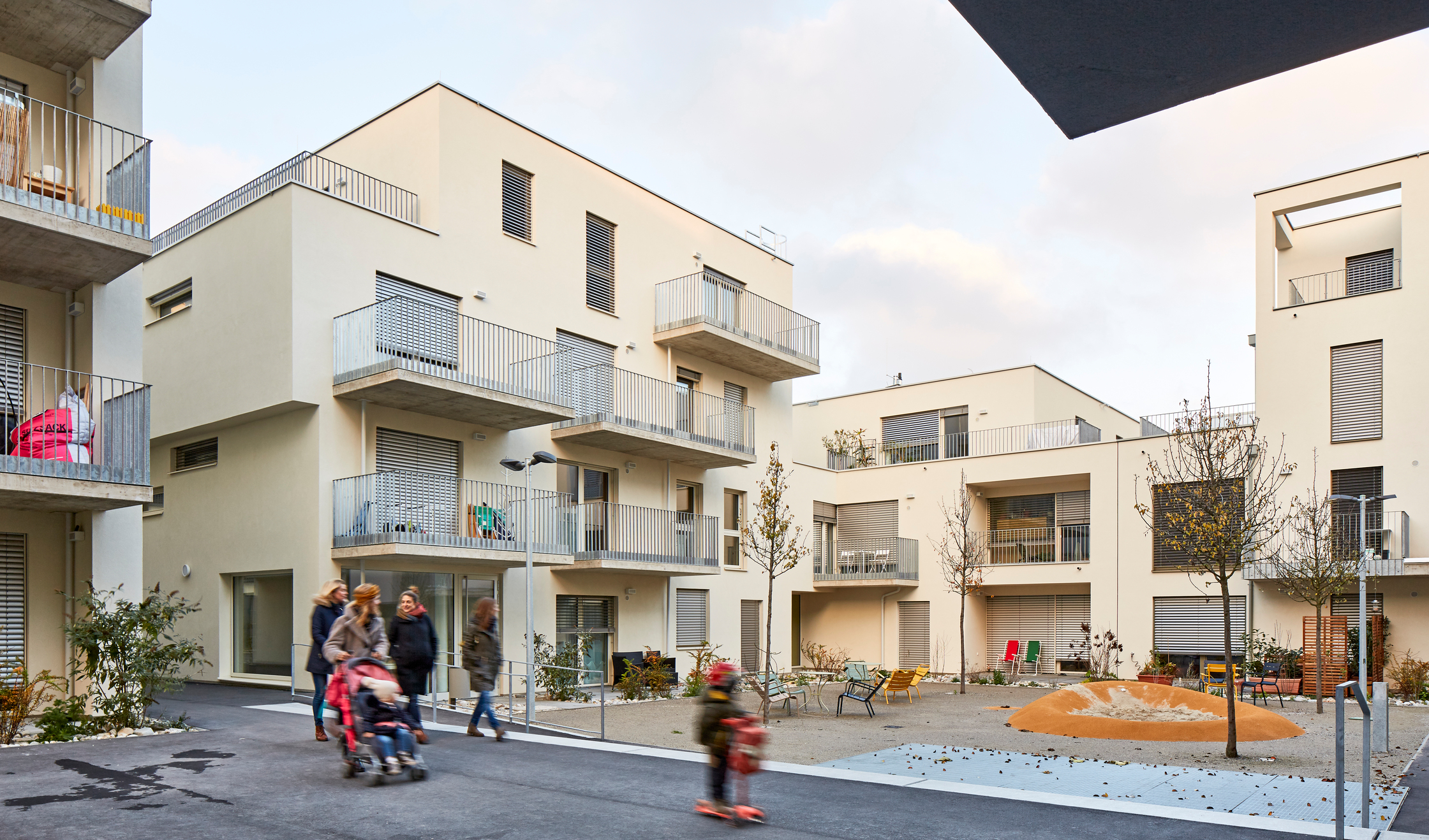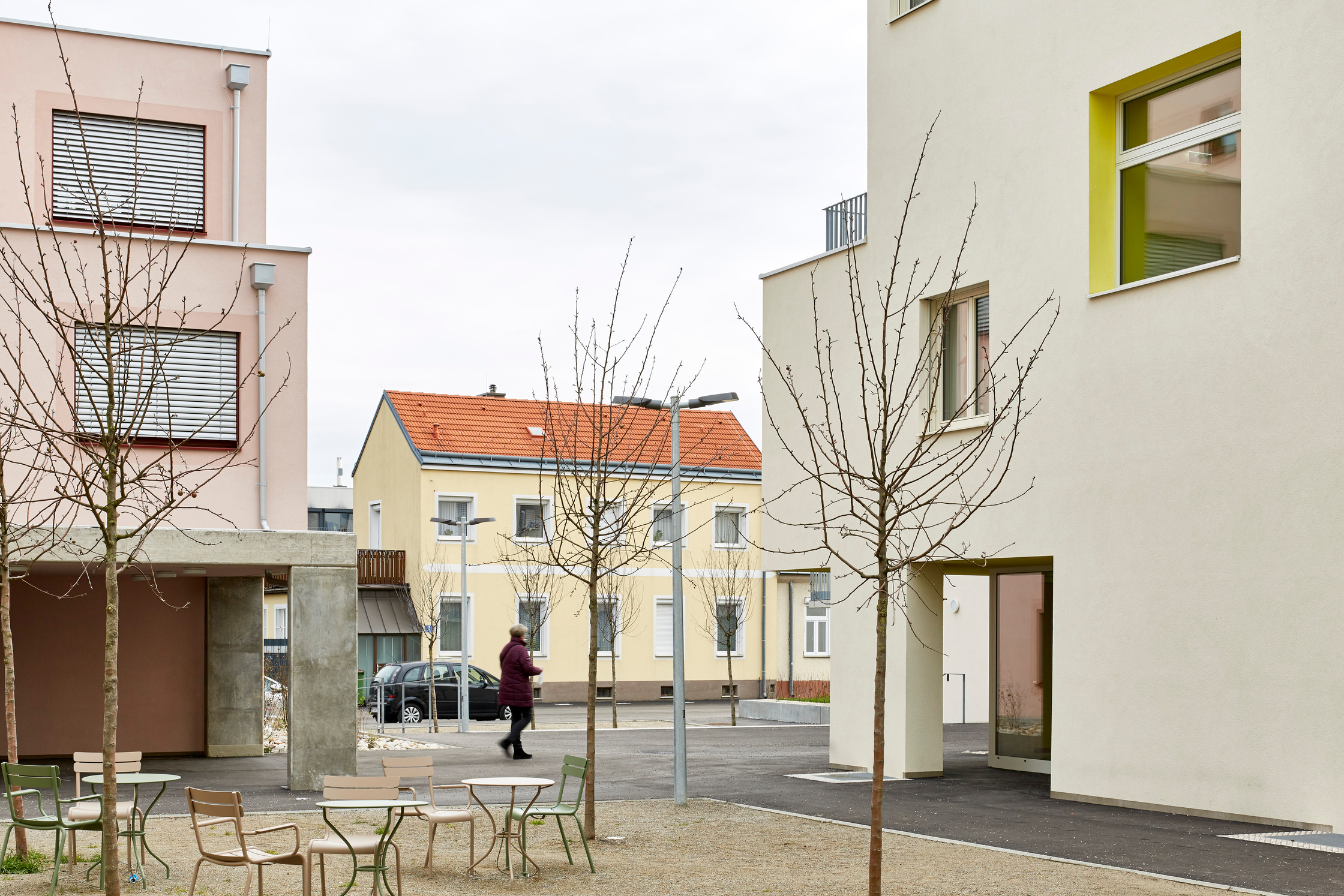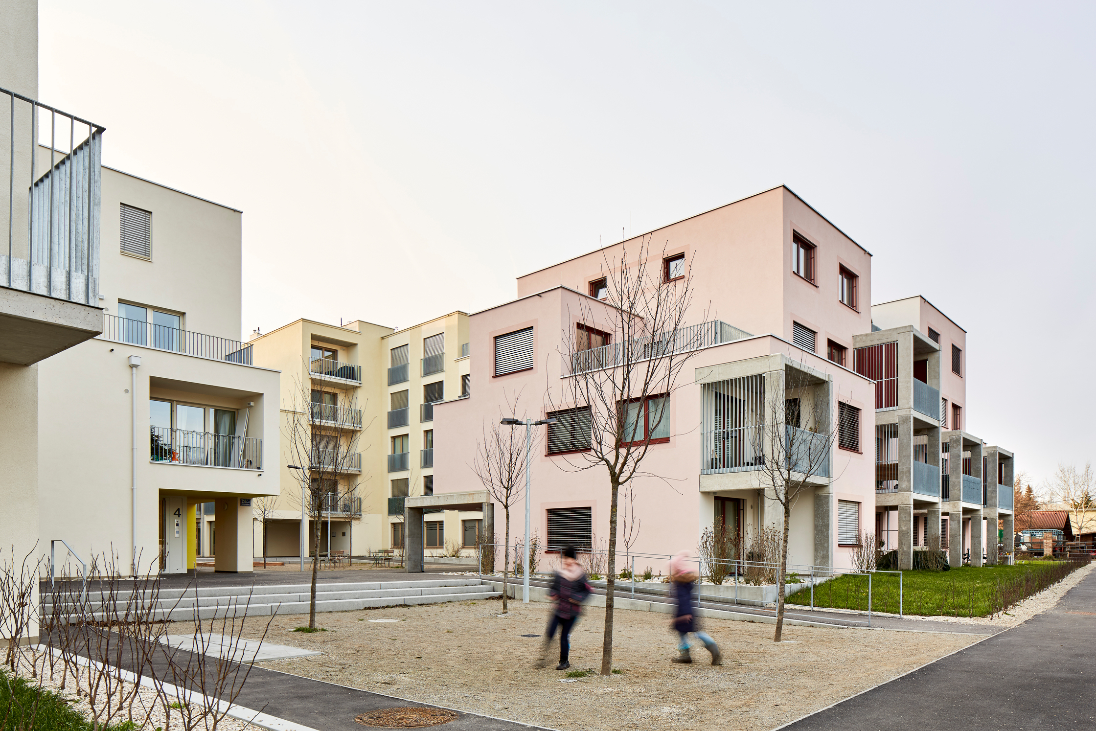 Die drei Architekturbüros – Sophie und Peter Thalbauer, Norbert Thaler & Ursina Thaler-Brunner und Alfred Charamza – verständigten sich auf eine möglichst einheitliche Architektursprache. Nur Thaler Thaler erlaubten sich mit einer zartrosa Fassade und roten Fensterrahmen beim Haus am Quartierseingang kleine Extravaganzen. Man setzte auf schlichte Baukörper, die sich einfachen Kategorisierungen wie Zeile oder Punkthaus entziehen und so angelegt sind, dass sie Platzbildungen ermöglichen. Drei quadratische Plätze liegen von winkelförmigen Gebäuden, Wegen und Durchgängen umspült in der Mittelachse. Im Zusammenspiel mit den beiden zur Mühlgrundgasse hin offenen Plätzen entstanden wohlproportionierte Freiraumsequenzen.