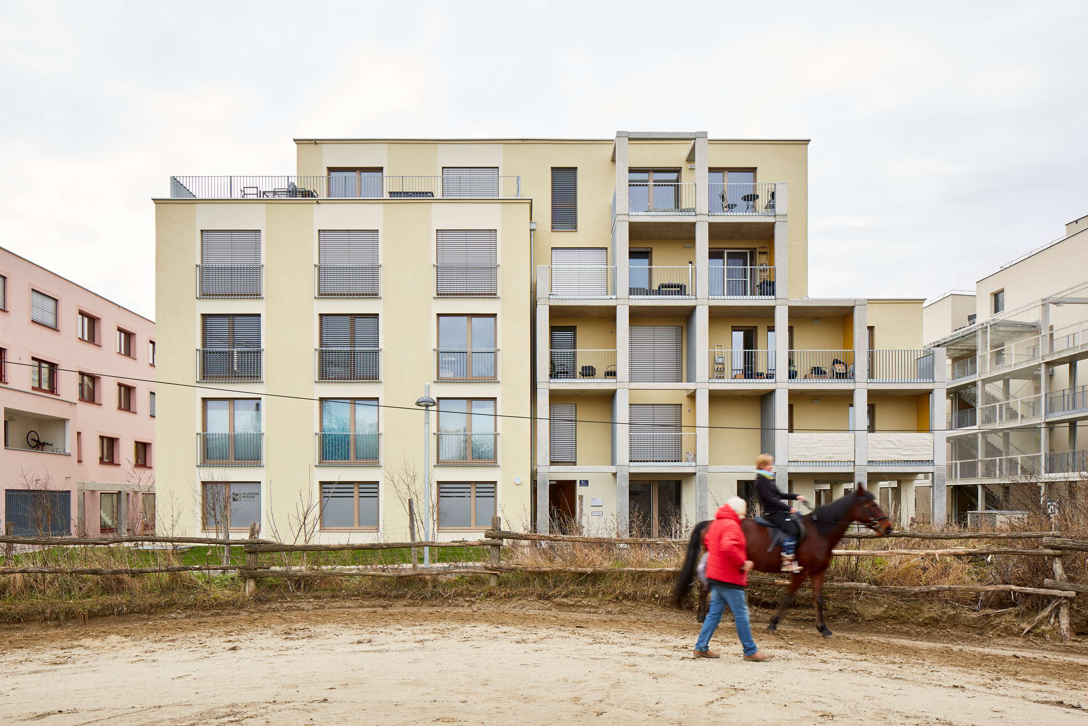 Sieben Häuser und drei Plätze, gebaut auf drei Grundstücken in unterschiedlichem Besitz, geplant von drei Architekturbüros: Es ist nicht ganz einfach, die Gebäude den einzelnen Auftraggebern und Planern zuzuordnen. Es gibt weder Zäune zwischen den Grundstücken noch ein Wetteifern um die effektvollste Fassade. Das Auffallende ist die Einheitlichkeit. So ging es nicht um ein Nebeneinander möglichst auffälliger Solitäre, sondern um das Gestalten eines Siedlungskörpers um einen Siedlungsinnenraum. Initiator ist Norbert Mayr, Architekturhistoriker und Publizist, also üblicherweise einer, der Gebautes beurteilt. Mit einem 1000 Quadratmeter großen Grundstück aus Familienbesitz wurde ihm vor zehn Jahren die Verantwortung übertragen, mit dem Baugrund etwas Nützliches anzufangen, und so wechselte er aus der Perspektive des kritischen Beobachters in jene des Bauherrn. Früh war die Idee eines Gemeinschaftsgartens geboren, und Bebauungsszenarien für den eigenen als auch für die beiden benachbarten langen Flurstreifen wurden gewälzt. Separat wären sie kaum bebaubar gewesen, weil sich die Zufahrt schwierig gestaltet hätte. Also bildete man eine Grundbesitzergruppe und verständigte sich darauf, gemeinsam zu bauen und die Flächen zu einer sinnvollen Siedlungsstruktur aufzuteilen. Der gemeinnützige Bauträger Neues Leben erwarb das Stadtgrundstück, für einen Teil der Privatgründe wurde ihm das Baurecht erteilt. Mayr agierte bei zwei Häusern als Bauherr. Alle 160 Einheiten sind Mietwohnungen, fast ein Drittel davon gefördert, 20 nach den günstigen Konditionen des Smart-Wohnbauprogramms, 20 mit Eigentumsoption. Den über das ganze Areal verteilten günstigeren Wohnungen merkt man den geringeren Preis nicht an. Vielfältig auch die Wohnungstypen: In zwei gelangt man direkt aus dem Lift, andere haben zwei Eingänge, um bei Bedarf einen Arbeitsplatz extra zu erschließen, andere sind im Geschoß so organisiert, dass man sie zu einer Wohngemeinschaft verbinden könnte.