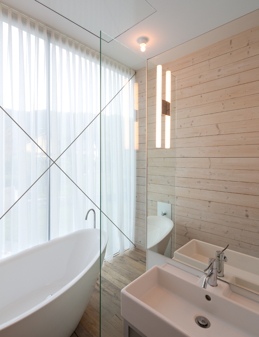 Als Heizungsart wurden in die Decken integrierte Infrarotpaneele verwendet. Damit ist jedes Zimmer einzeln steuer- und regelbar. Die umlaufende Raffstore-Anlage ist durch Wind- und Sonnenwächter gesteuert.