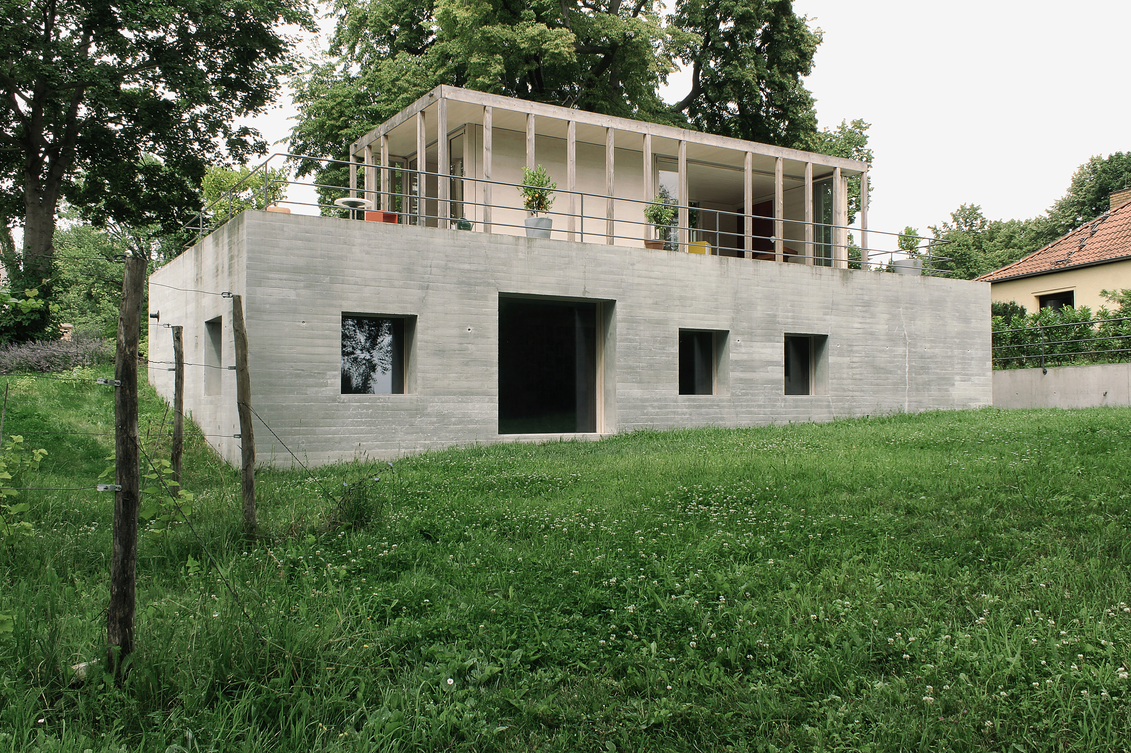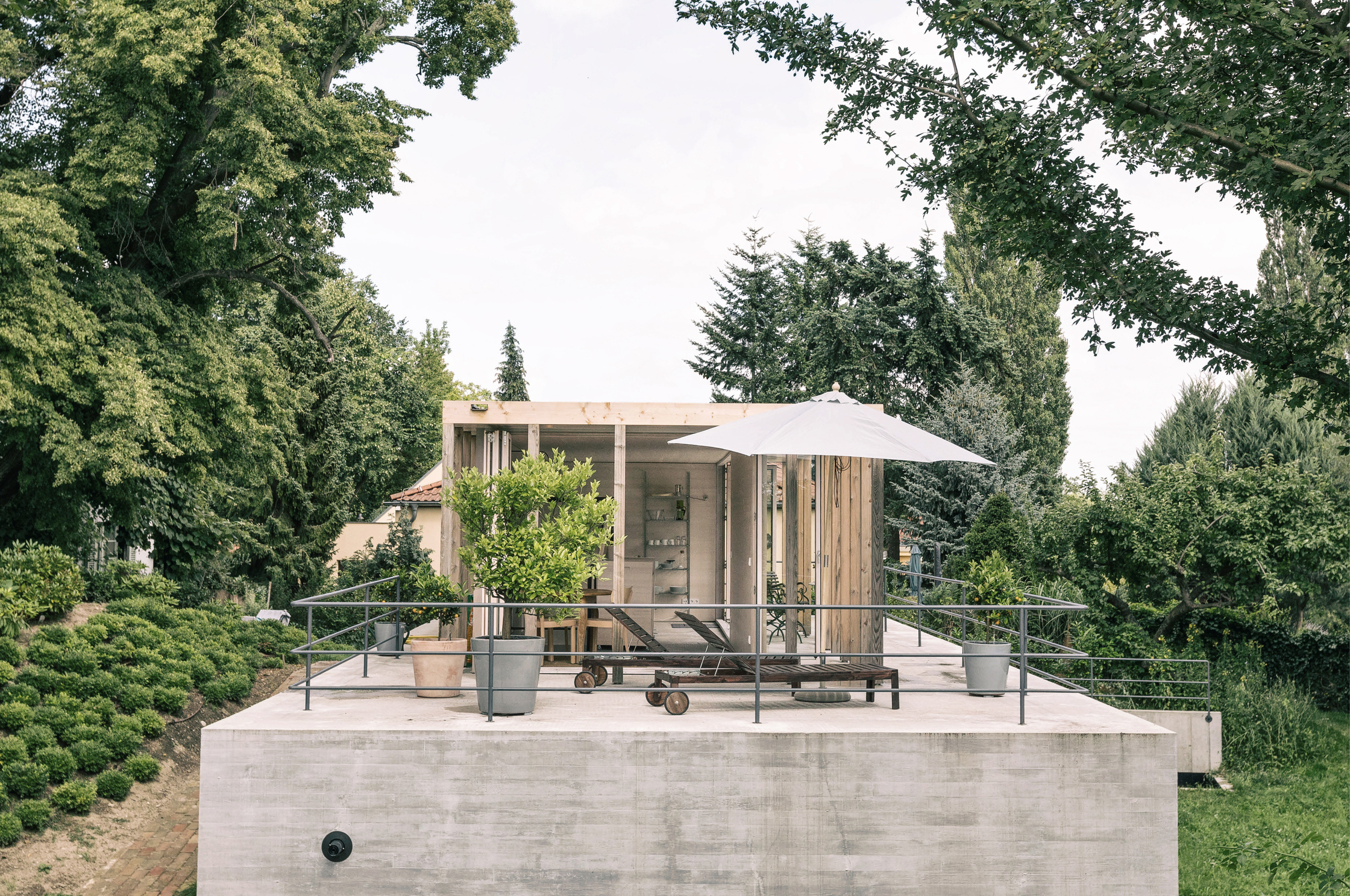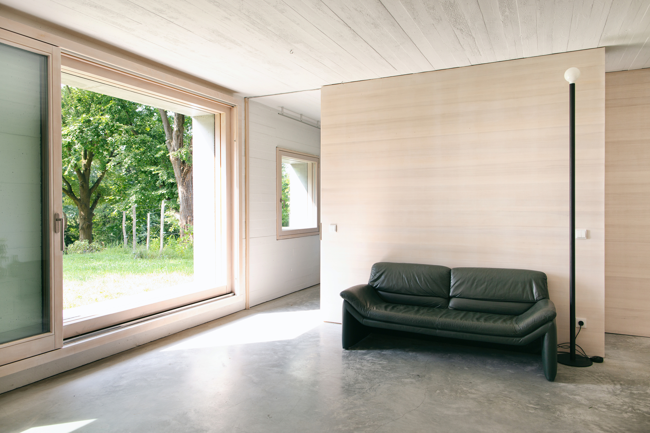 Die Wohnfläche verändert sich mit den Jahreszeiten. Nur der untere Teil des Gebäudes ist beheizt und entsprechend gedämmt. Im Winter ziehen sich die Bewohner in das Gartengeschoss zurück. Im Sommer kommen Pavillon und Terrasse hinzu - die Wohnfläche verdoppelt sich. Die mobile Küche wandert mit den Bewohnern. Durch Falttüren wird der Pavillon im Sommer geöffnet. Ein horizontales Schiebefenster trennt den Pavillon im Winter vom Gartengeschoss.