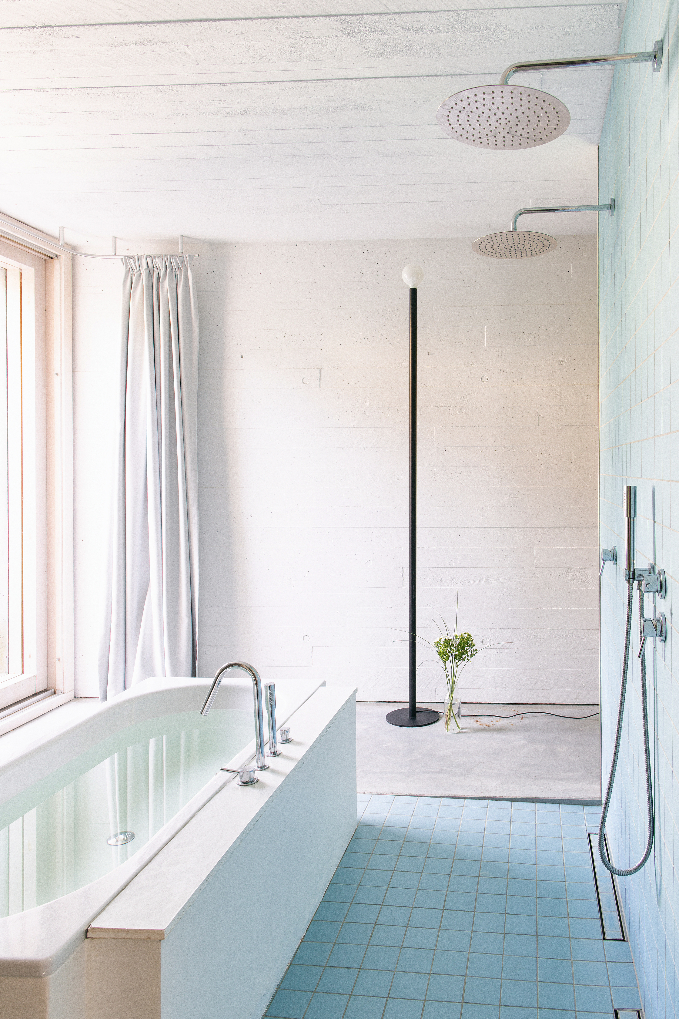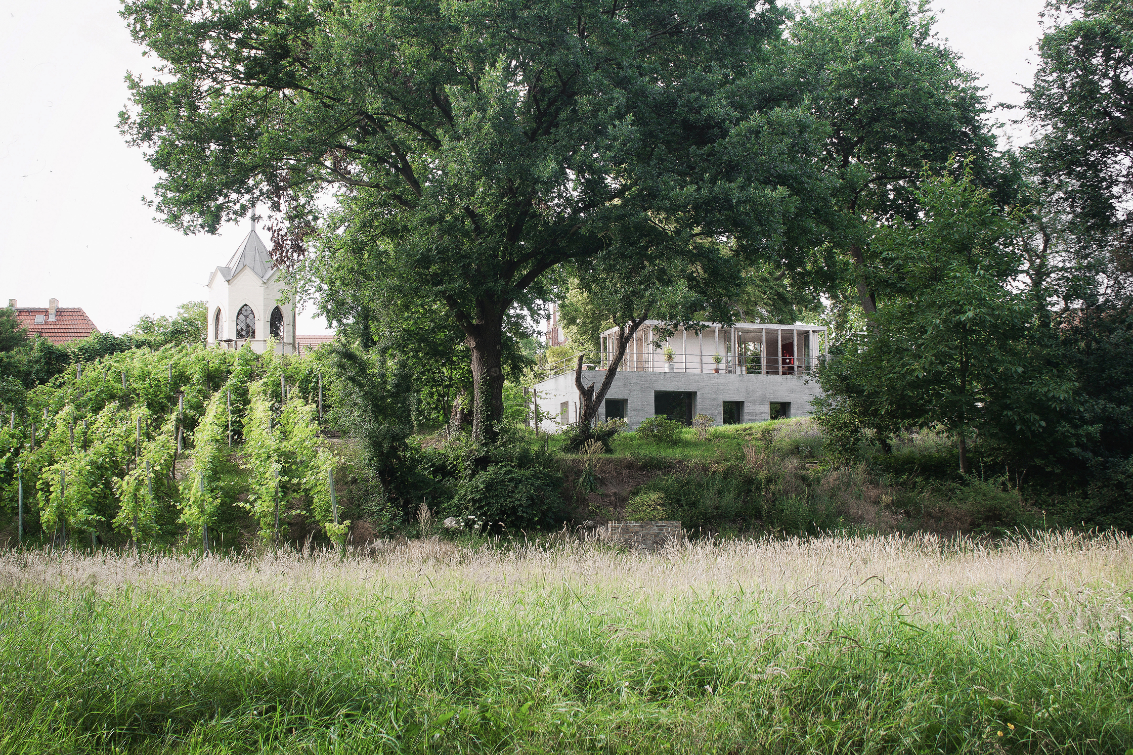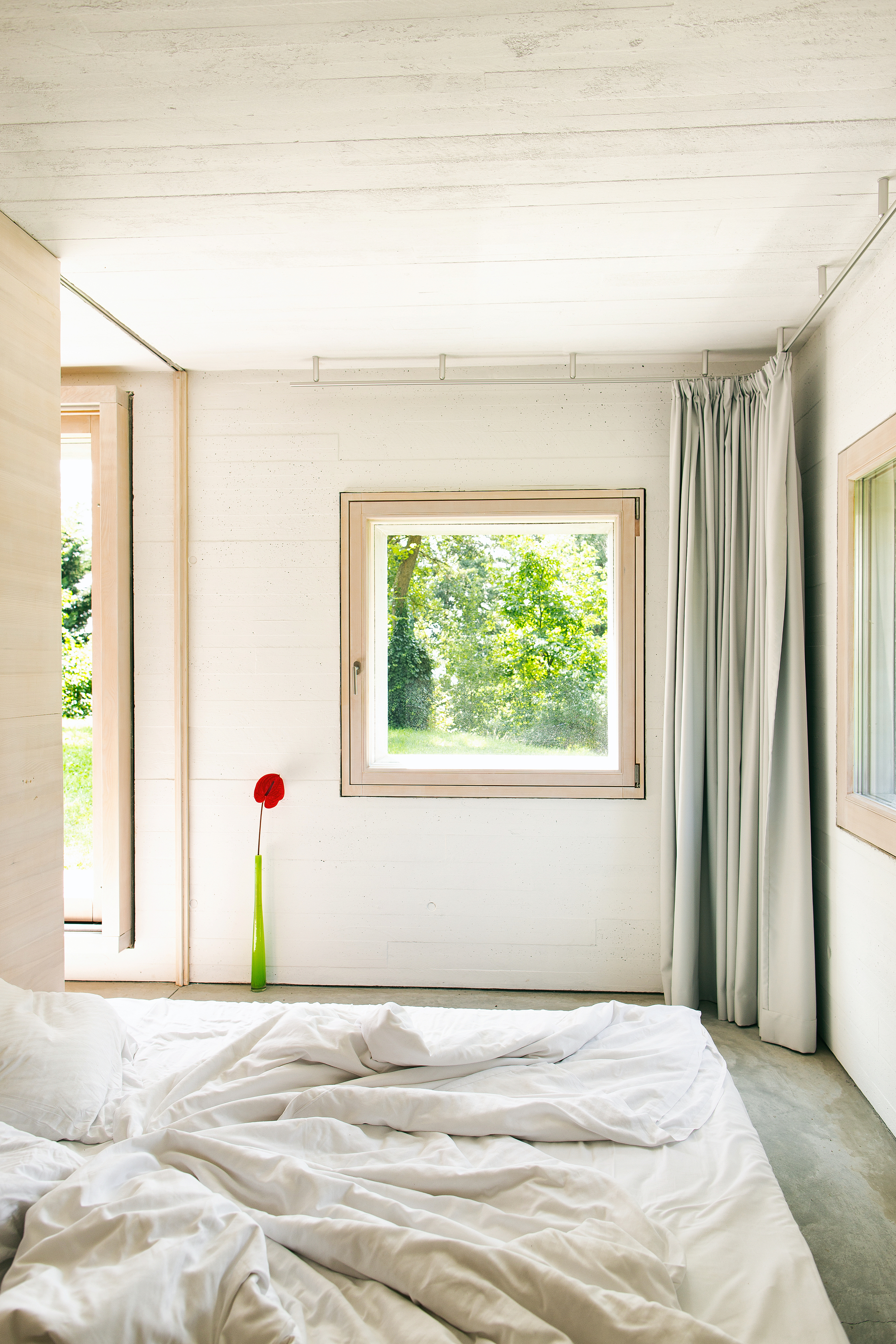 Die Wohnfläche verändert sich mit den Jahreszeiten. Nur der untere Teil des Gebäudes ist beheizt und entsprechend gedämmt. Im Winter ziehen sich die Bewohner in das Gartengeschoss zurück. Im Sommer kommen Pavillon und Terrasse hinzu - die Wohnfläche verdoppelt sich. Die mobile Küche wandert mit den Bewohnern. Durch Falttüren wird der Pavillon im Sommer geöffnet. Ein horizontales Schiebefenster trennt den Pavillon im Winter vom Gartengeschoss.