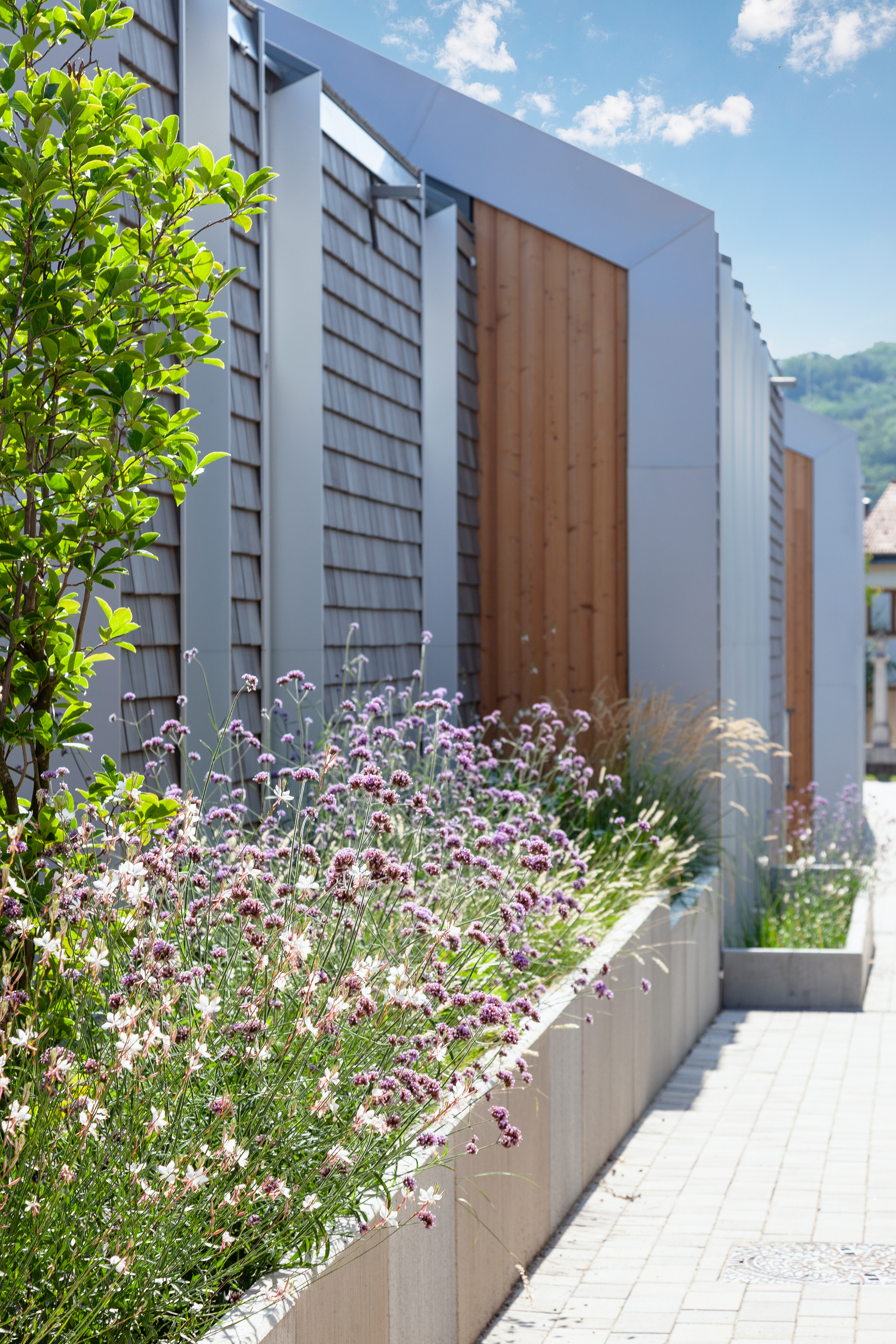Die Straßenfront wurde durchbrochen, statt einer langweiligen, verputzten Fensterfassade wurde mit städtebaulichem Wagemut eine hölzerne Satteldachfront in die Baulücke gestellt, links und rechts davon zwei wilde, verwunschene Gehwege, ein Abstecher in die Wohnsiedlung dahinter, gelegentlich kann man die Gemeindemitarbeiterinnen hier bei einer Zigarette und einer Tasse Kaffee antreffen, dazwischen erstreckt sich das Gebäude – wie eine Scheune irgendwo in Iowa – 60 Meter weit nach hinten.