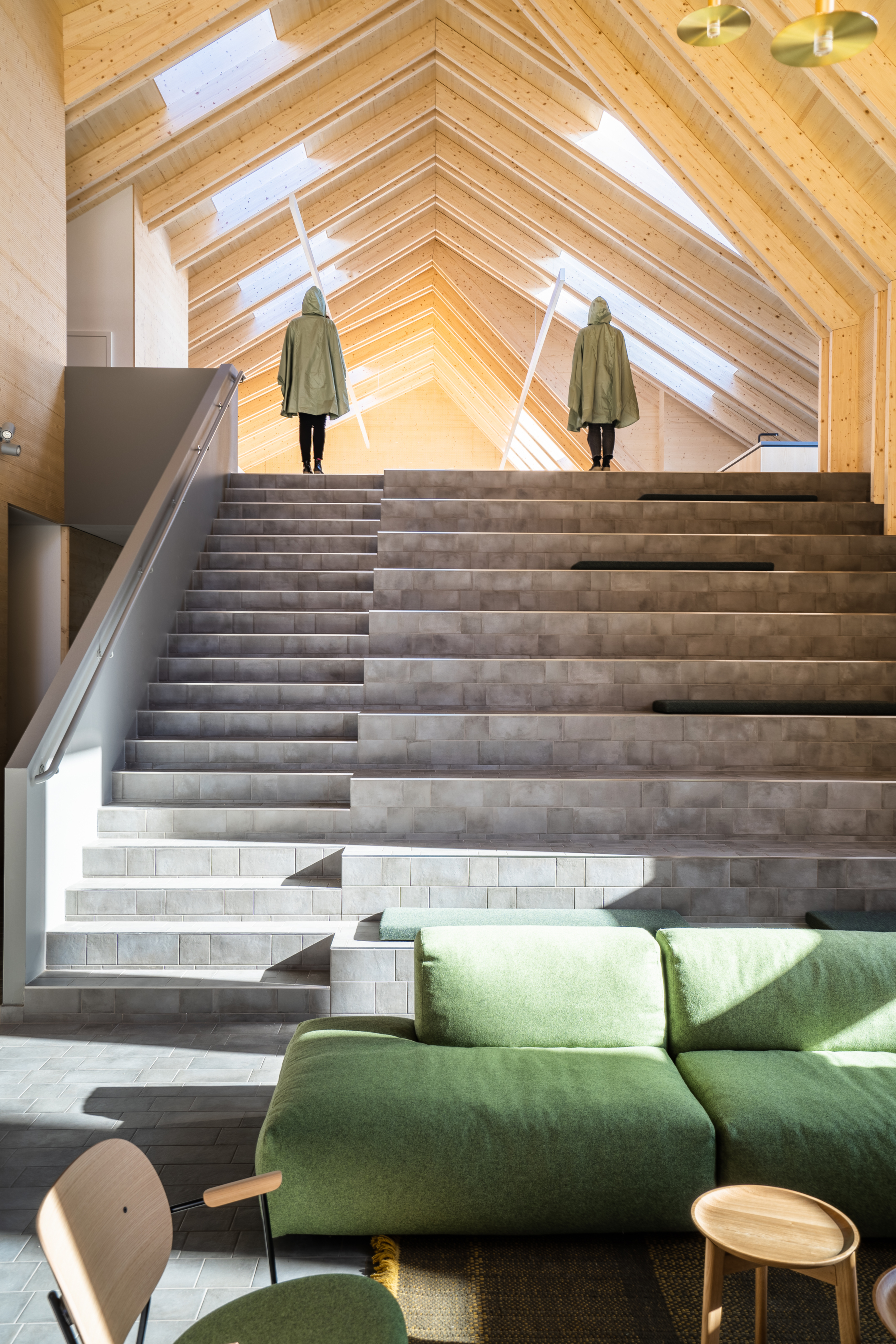 „Wir wollten ein wirklich offenes, öffentlich zugängliches Rathaus, das sich anfühlt wie ein Kumpel, dem man gern mal auf die Schulter klopft, weil man ihn so gern hat“, sagt Philipp Buxbaum, der gemeinsam mit seinem Partner Christian Kircher das Wiener Büro Smartvoll Architekten leitet. Das Ziel wurde erreicht: Während in einem klassischen Rathaus, wie Buxbaum vorrechnet, lediglich zehn bis 15 Prozent der Nutzfläche hausfremden Personen zur Verfügung stehen, sind in Großweikersdorf rund 55 Prozent des Gebäudes öffentlich begehbar – darunter auch eine Art Wohnzimmer-Lounge mit Bibliothek und Sitztribüne. Den schulterklopfenden Sympathiefaktor erreicht man über das gute alte Satteldach.
