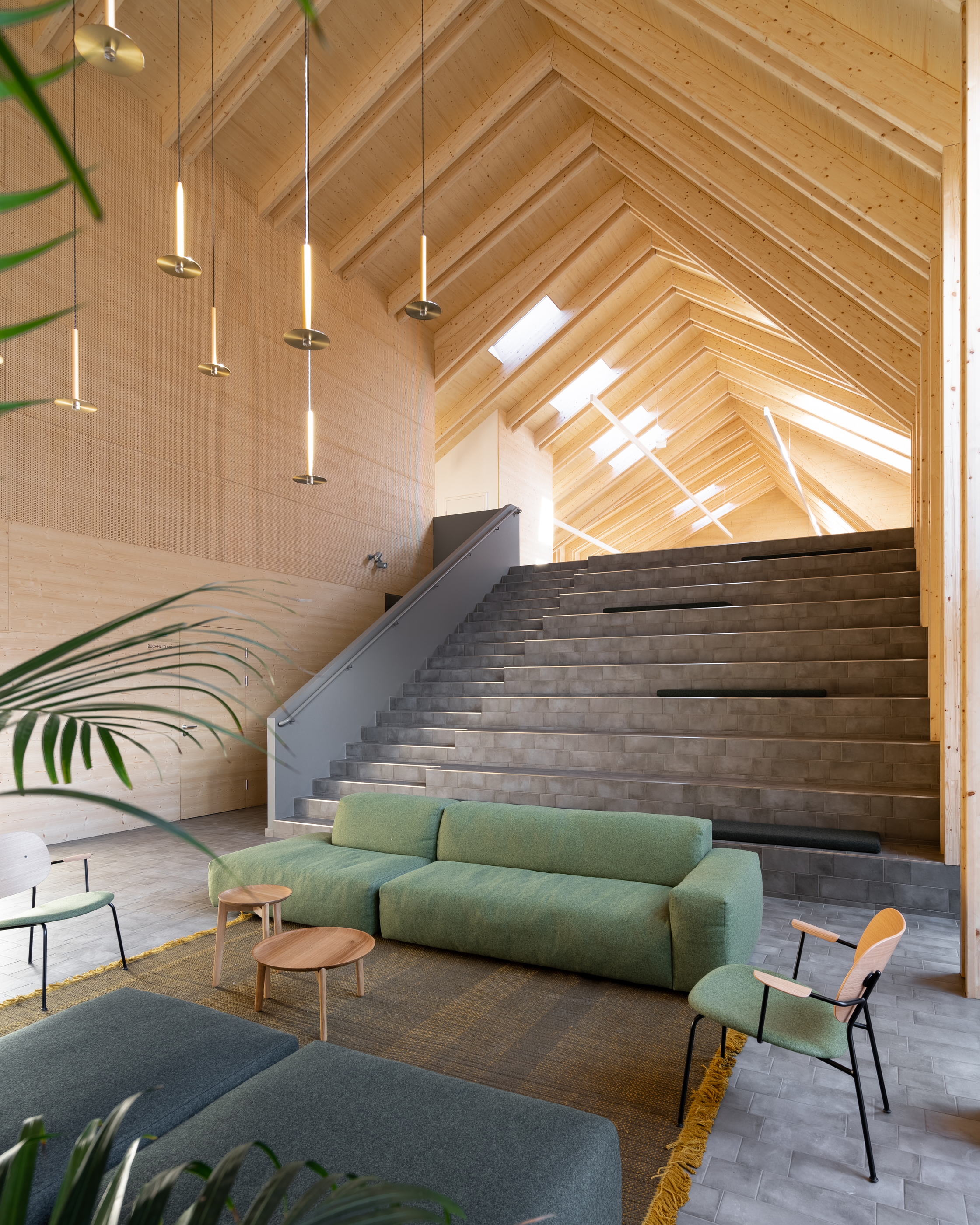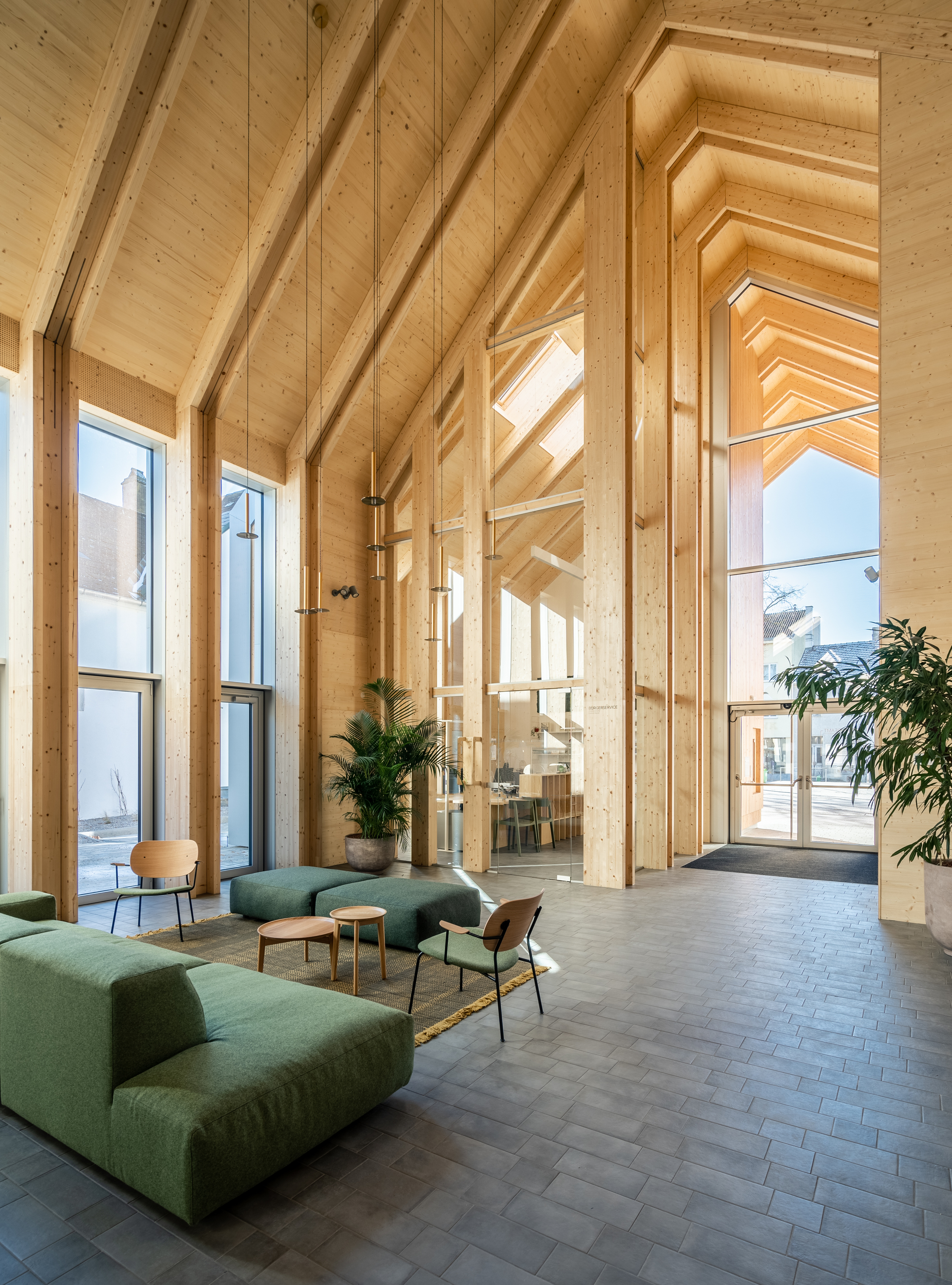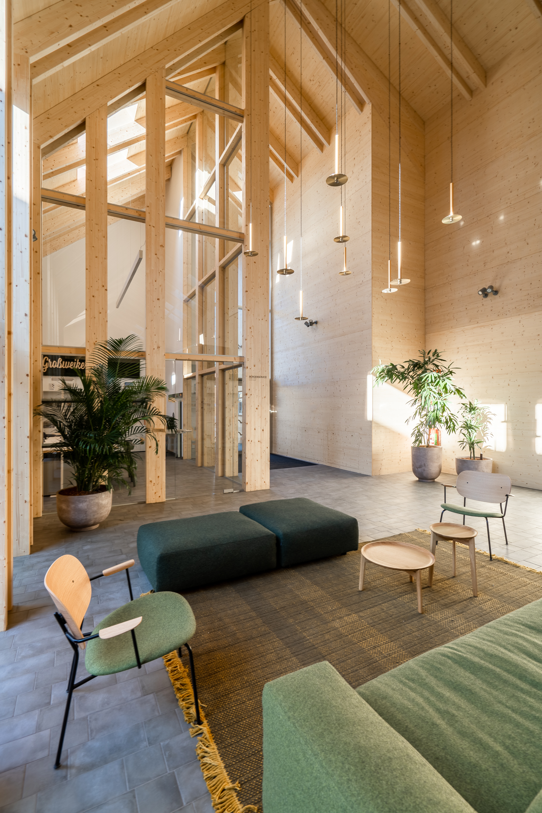 Bürgermeister Alois Zetsch hat bislang nur beste Rückmeldungen bekommen. „Die Leute lieben das Haus, und sie haben das Gefühl, dass ihnen die Gemeinde hier ein zweites Wohnzimmer hingestellt hat. Wenn sie einen Termin auf der Gemeinde haben und ein bissl warten müssen, dann sitzen sie nicht auf einem Konferenzstuhl im Wartezimmer, sondern auf einem grünen Sofa unter einem riesengroßen Holzdachstuhl.“ Der Erfolg des 5,3 Millionen Euro teuren Projekts hat schon weite Kreise gezogen: Nominierung für den Holzbaupreis und den INA Award 2021, Anerkennung beim Holzbaupreis, Sieger beim Architizer A+Award.