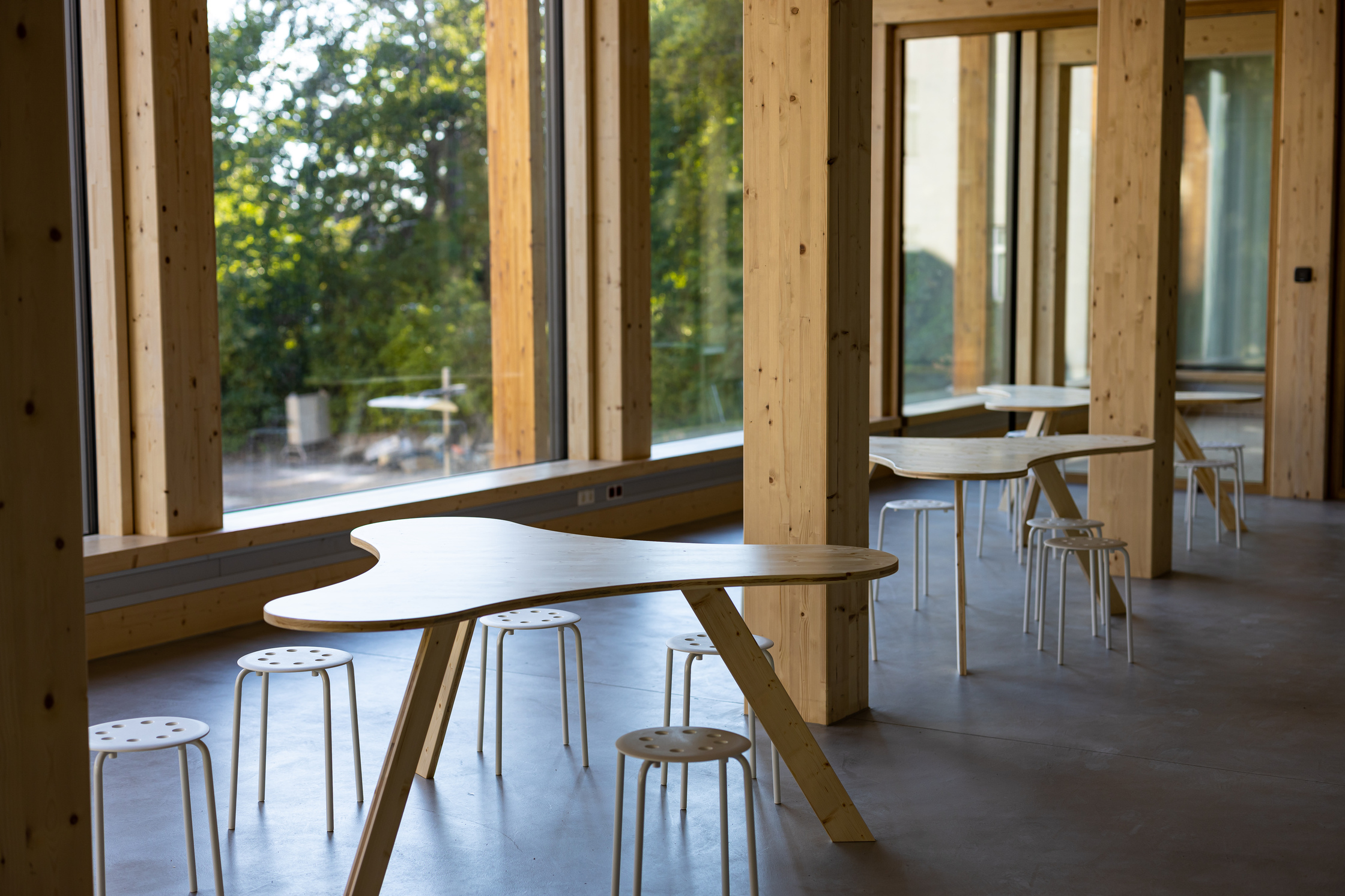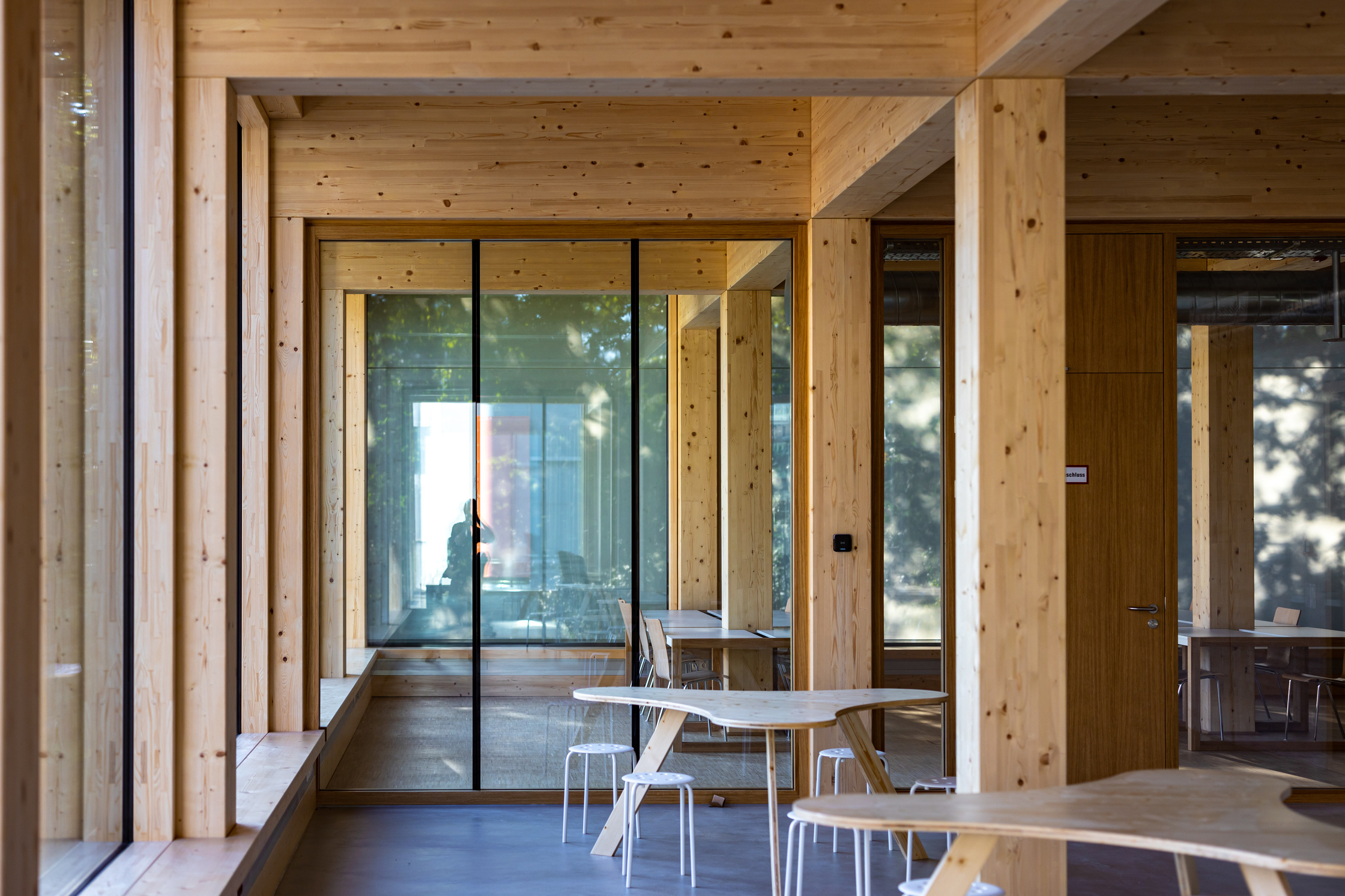 Unmittelbar neben diesem Gebäude war allerdings noch Platz für einen Zubau, ein leicht geböschtes Areal, umgeben von alten Bäumen. Hier sollten zusätzliche Flächen für Institutsräume sowie ein Seminarzentrum und eine Erweiterung der Bibliothek errichtet werden. In der Ausschreibung für den Architekturwettbewerb im Jahr 2017 war explizit ein konstruktiver Holzbau gefordert. Dass eine Universität, die der Land- und Forstwirtschaft ihre Gründung verdankt, aus diesem Material auch bauen möchte, ist naheliegend. Bereits 2014 hatte sie sich beim Wettbewerb für eine neues, 200 Meter stadteinwärts gelegenes Institutsgebäude für einen Entwurf des Büros Baumschlager-Hutter entschieden, bei dem immerhin die Fassade aus vertikalen Holzlamellen besteht. Dass man diesmal einen Schritt weiter gehen und auch das Tragsystem aus Holz errichten wollte, hing nicht zuletzt mit den guten Erfahrungen zusammen, die man bei einer Außenstelle der Universität in Tulln gemacht hatte. Dort hatte das Architekturbüro SWAP in Kooperation mit Delta Projektconsult ein Laborgebäude in Holzkonstruktion errichtet, der 2018 in der Kategorie „Öffentlicher Bau“ den österreichischen Holzbaupreis erhielt.