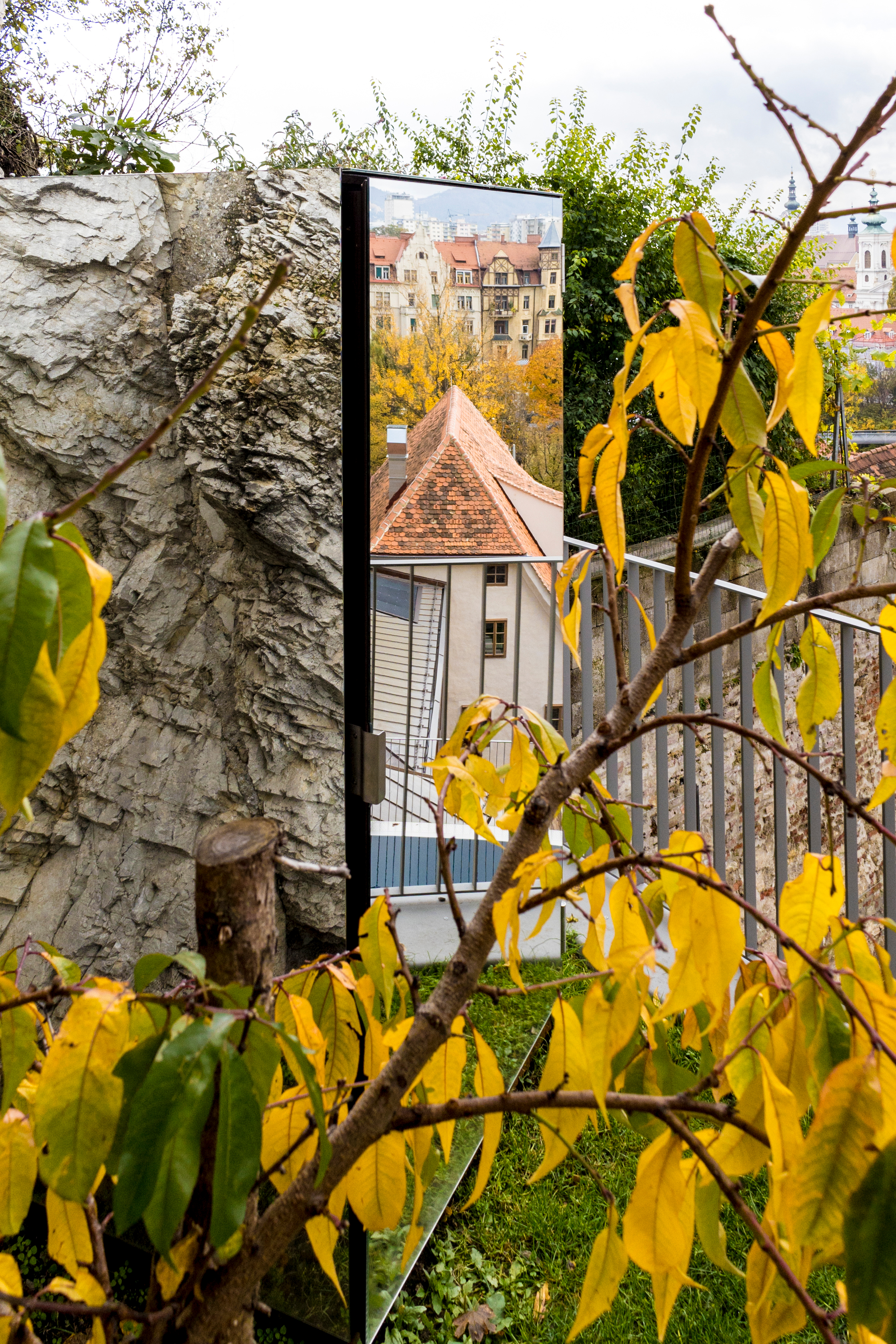 Mit diesen Einbauten, aber auch mit der Vielfalt der Freiräume unter Einbeziehung vorhandener Geländestufen und der neu genutzten Terrassen, Treppen und Zugangswege entsteht ein lebendiges Ganzes – erkennbar als Zeitschicht von 2020. Dass die Gratwanderung zwischen Bewahrung und Erneuerung im historischen, über die Jahrhunderte unterschiedlich genutzten Denkmal mit diesem Plan gelingen kann, erkannte die Grazer Altstadtkommission offensichtlich und genehmigte ihn trotz der sensiblen Lage am gut einsehbaren Abhang des Schlossbergs. Für den Bauherrn war die Erweiterung unabdingbar, entstand doch auch mit den Aufbauten nur eine Anzahl an Zimmern, die für kühle Rechner noch immer weit unter den üblichen Grenzen der Wirtschaftlichkeit liegt.