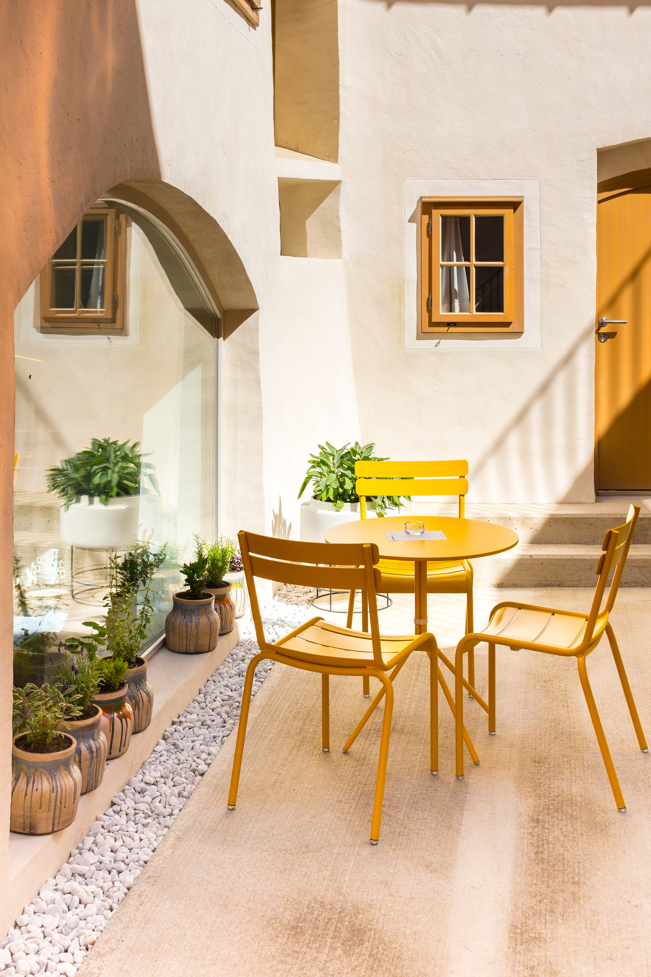 Die Gäste erwarten 21 individuell gestaltete Zimmer, die mit dem Lift, im Stiegenaufgang oder über den kleinen Innenhof erst gefunden werden wollen. Wenn auch unter den riesigen Dachflächen das Gebälk sichtbar blieb, so zeigt sich doch überall im Inneren das Bedürfnis der Architektin, dem Haus ohne rechte Winkel eine frische, unkonventionelle Note zu verleihen. Sanitärzellen bleiben als Raum im Raum ersichtlich, und die Treppe ins oberste Geschoß wird als formschönes, kompaktes Möbel gestaltet. Wo nichts im Lot war, wurden Böden so verlegt, dass Puristen vermutlich die Nase rümpfen – schräg, in ungewöhnlichen Formaten und im Materialmix Naturstein und matt belassenes Holz. Nichts wirkt luxuriös. Öffentliche Bereiche wie das Café, das auch der Frühstücksraum für die Hotelgäste sein wird, sollten die Intimität von Wohnräumen spiegeln. Was man aus Lokalen in hippen Stadtquartieren von Berlin oder München kennt, findet sich auch hier – Naturmaterialien und Detailverliebtheit, ein üppiger Mix an Mobiliar und überall Kunst an den Wänden.