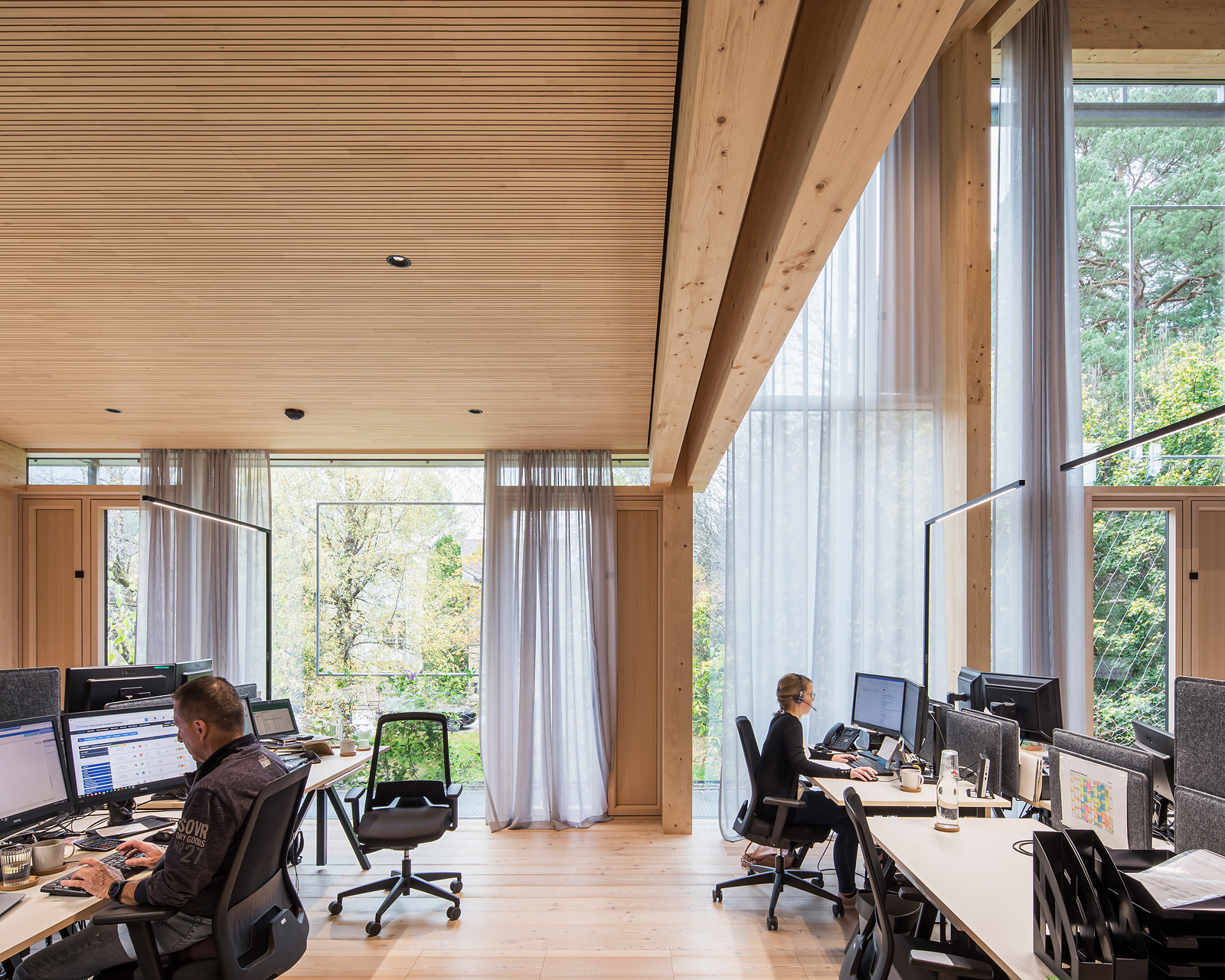 Abstimmung Gebäude-Haustechnik mit Hilfe einer thermisch-dynamischen-Gebäudesimulation. Einfache Haustechnische Anlagen zur Verringerung des Wartungsaufwands. Offene Innenraumgestaltung über mehrere Geschoße mit natürlicher Raumlüftung. Unterstützt über automatisch gesteuerten Lüftungsflügel.