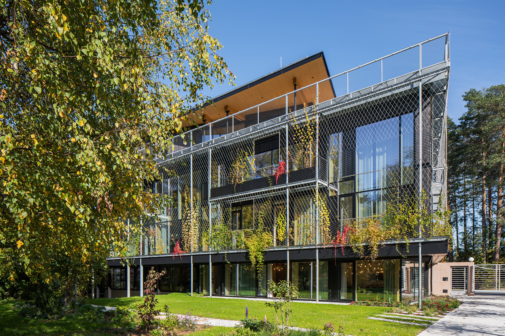 Wärme-/Kälteverteilung über gemeinsames Verteilnetz und Fußbodenheizung/Kühlung. Sommerlicher Überhitzungsschutz durch vorgehängte grüne Fassade.