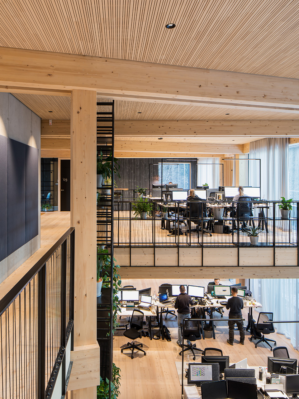 Abstimmung Gebäude-Haustechnik mit Hilfe einer thermisch-dynamischen-Gebäudesimulation. Einfache Haustechnische Anlagen zur Verringerung des Wartungsaufwands. Offene Innenraumgestaltung über mehrere Geschoße mit natürlicher Raumlüftung. Unterstützt über automatisch gesteuerten Lüftungsflügel.