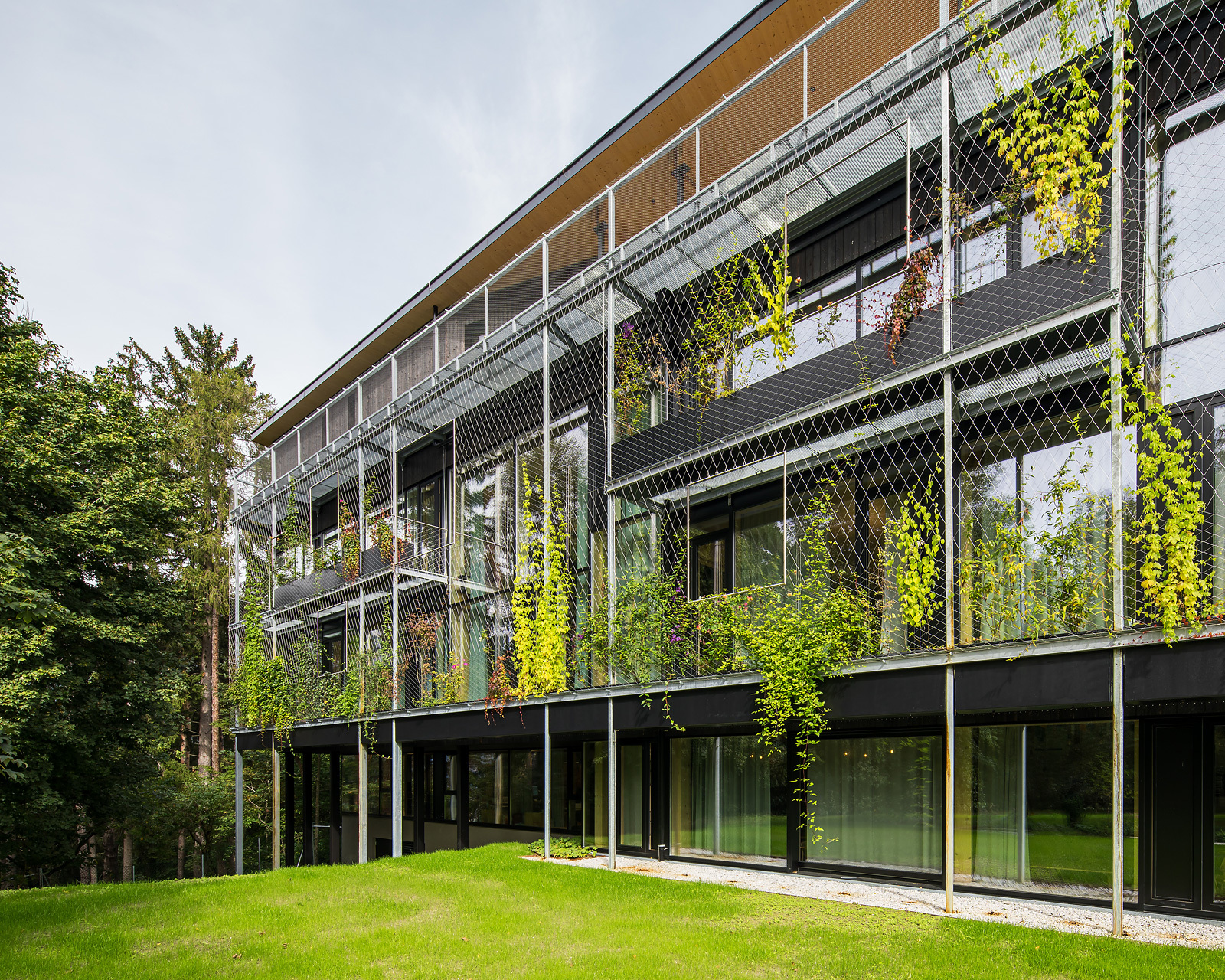 Wärme-/Kälteverteilung über gemeinsames Verteilnetz und Fußbodenheizung/Kühlung. Sommerlicher Überhitzungsschutz durch vorgehängte grüne Fassade.