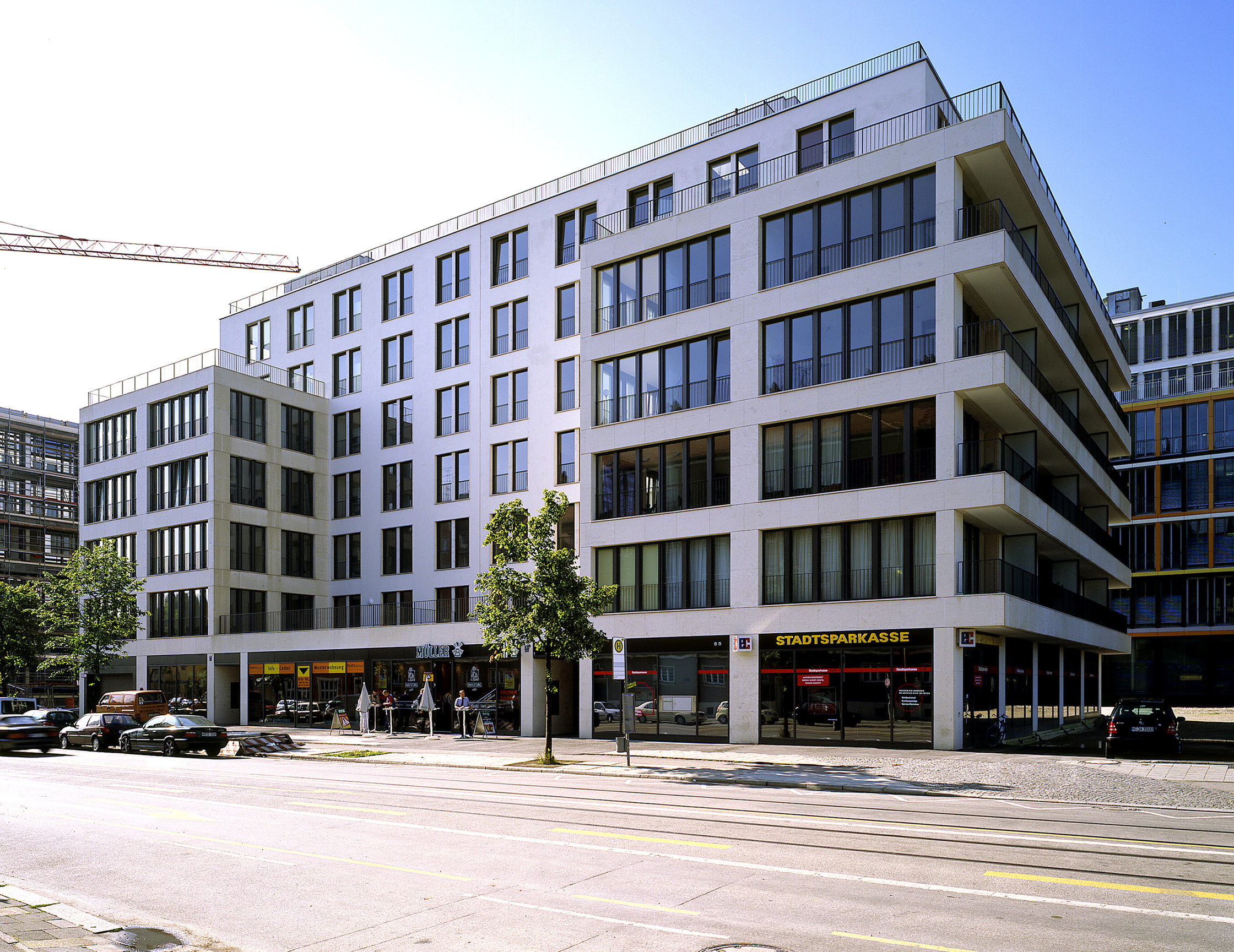 Diese Stadtplanung «en miniature» verband Steidle in seinem Entwurf für den Potsdamer Platz mit der Blockrandstruktur des 19. Jahrhunderts, um schliesslich bei seinem bisher wichtigsten städtebaulichen Projekt, der Neugestaltung des einstigen Münchner Messegeländes auf der Theresienhöhe, zu einem freien Spiel von Block, Zeile und Punkthaus zu finden, bei dem nun der zuvor in Ulm und Wien erprobten Farbigkeit ein ganz zentraler Stellenwert zukommt. Zu diesem gemischt genutzten, aus Geschäftshäusern und Wohnanlagen mit insgesamt 1600 Apartments bestehenden Quartier steuerte Steidle unter anderem das KPMG-Verwaltungsgebäude bei, dessen Fassadenraster effektvoll mit buntem Klinker verkleidet ist, sowie das in Orange und Gelb gehaltene Hochhaus - einen Wohnbau, der mit seinen Erkern und weit ausladenden Balkonen an zeitgenössische holländische Bauten erinnert. Noch plakativer eingefärbt als dieser Turm sind die einfachen Baukörper einer von den Grundrissen chinesischer Hofhäuser ausgehenden Siedlung in Peking, die eben erst nach kürzester Planungs- und Bauzeit fertig gestellt wurde. Den gut zehngeschossigen Wohnblöcken gibt neben der Farbigkeit eine fast pittoresk anmutende Verschachtelung Halt in der Anonymität der Vorstadt.