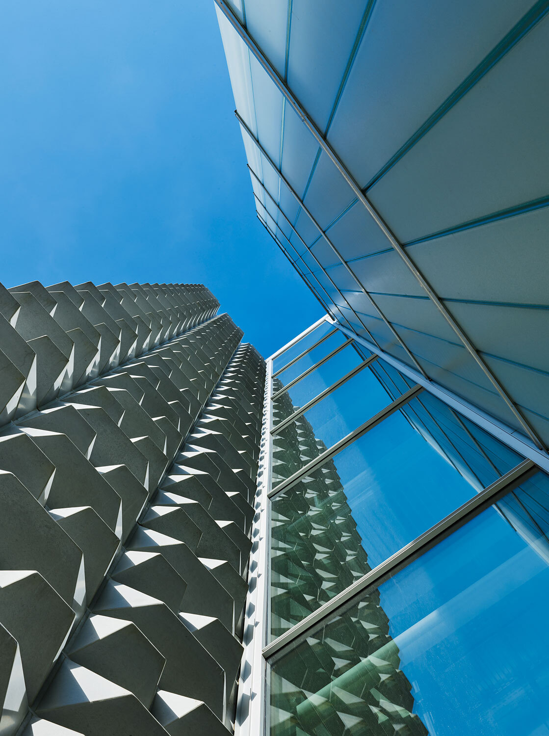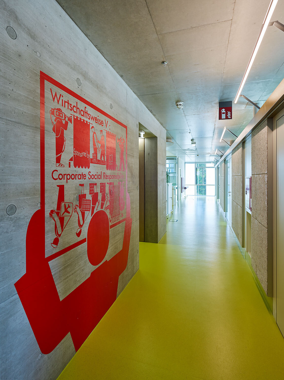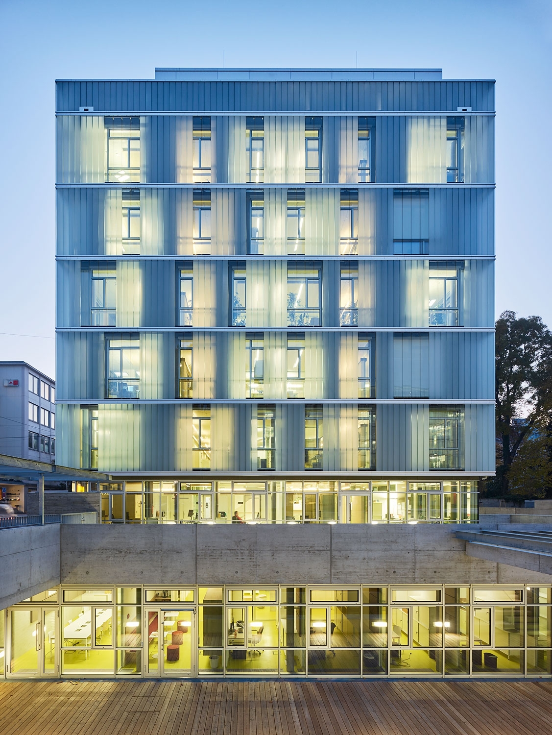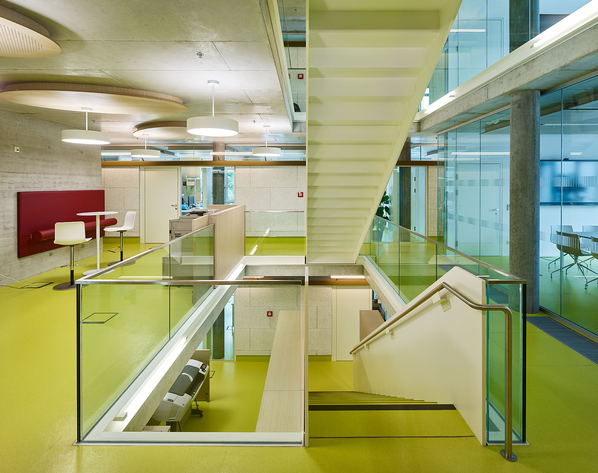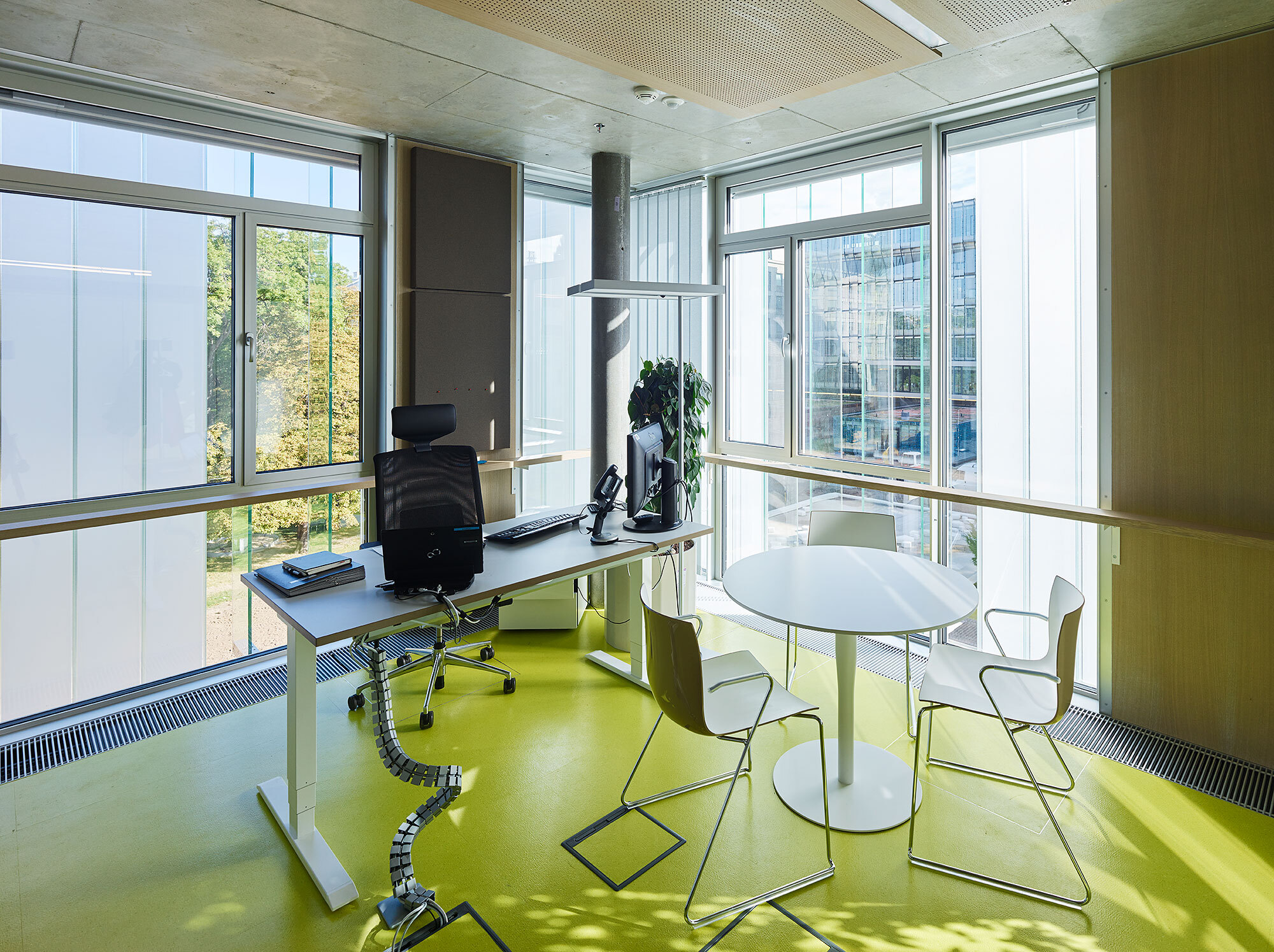 Natürliche Lüftung war eine Planungsvorgabe und ist mit der Funktionalität der Außenhaut abgestimmt. Die Kühlung erfolgt über kontrollierte Nachtlüftung (gekippte Oberlichten in der Innenhaut und Absaugung aus der Mittelzone) mit Speicherung der Nachtkühle in den unverkleideten Stahlbetondecken. Nur Besprechungsräume und das Konferenzgeschoss werden aktiv klimatisiert.