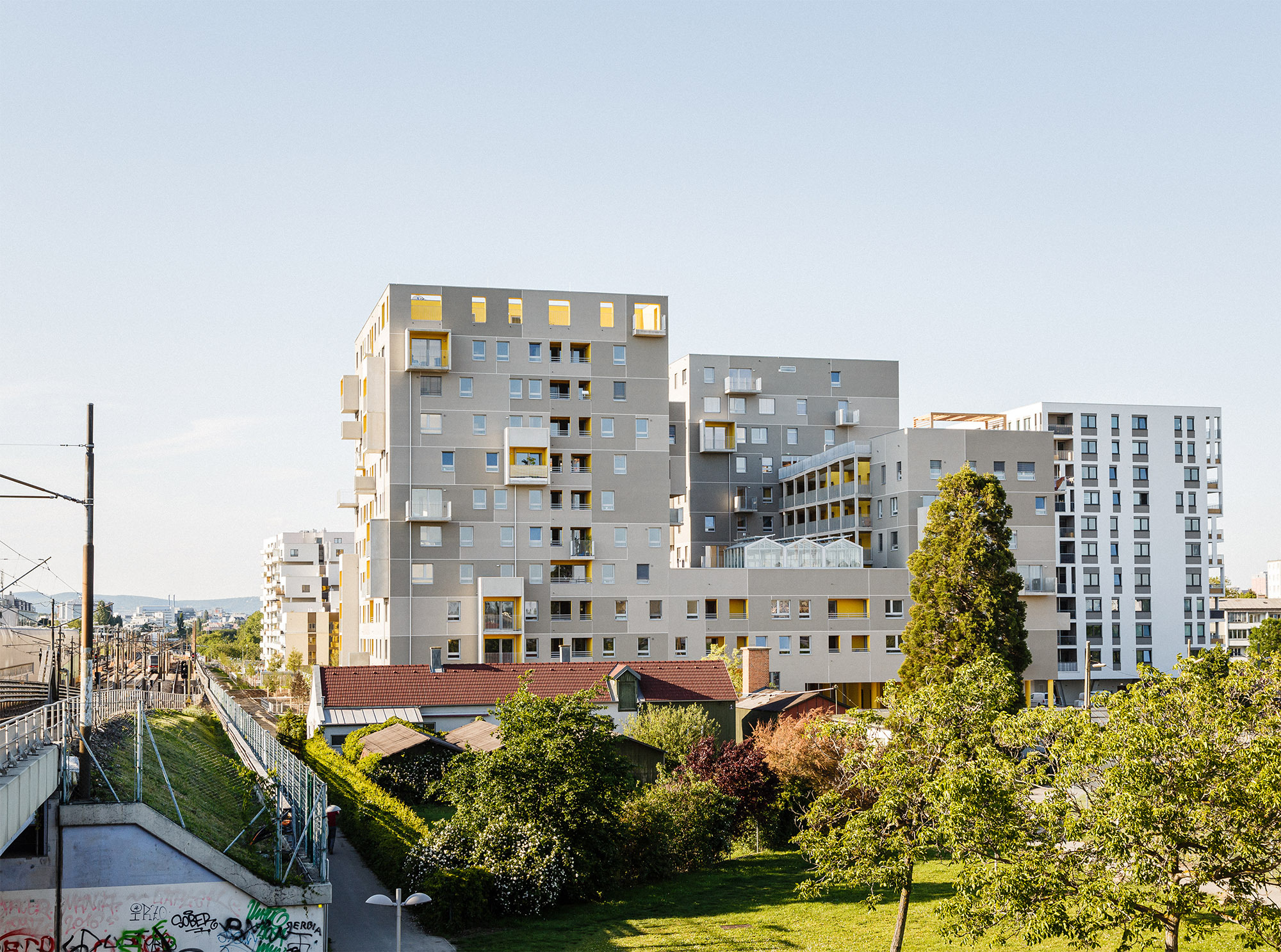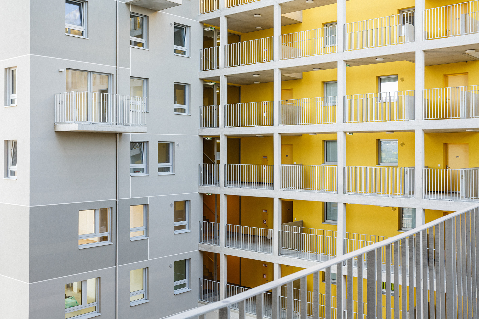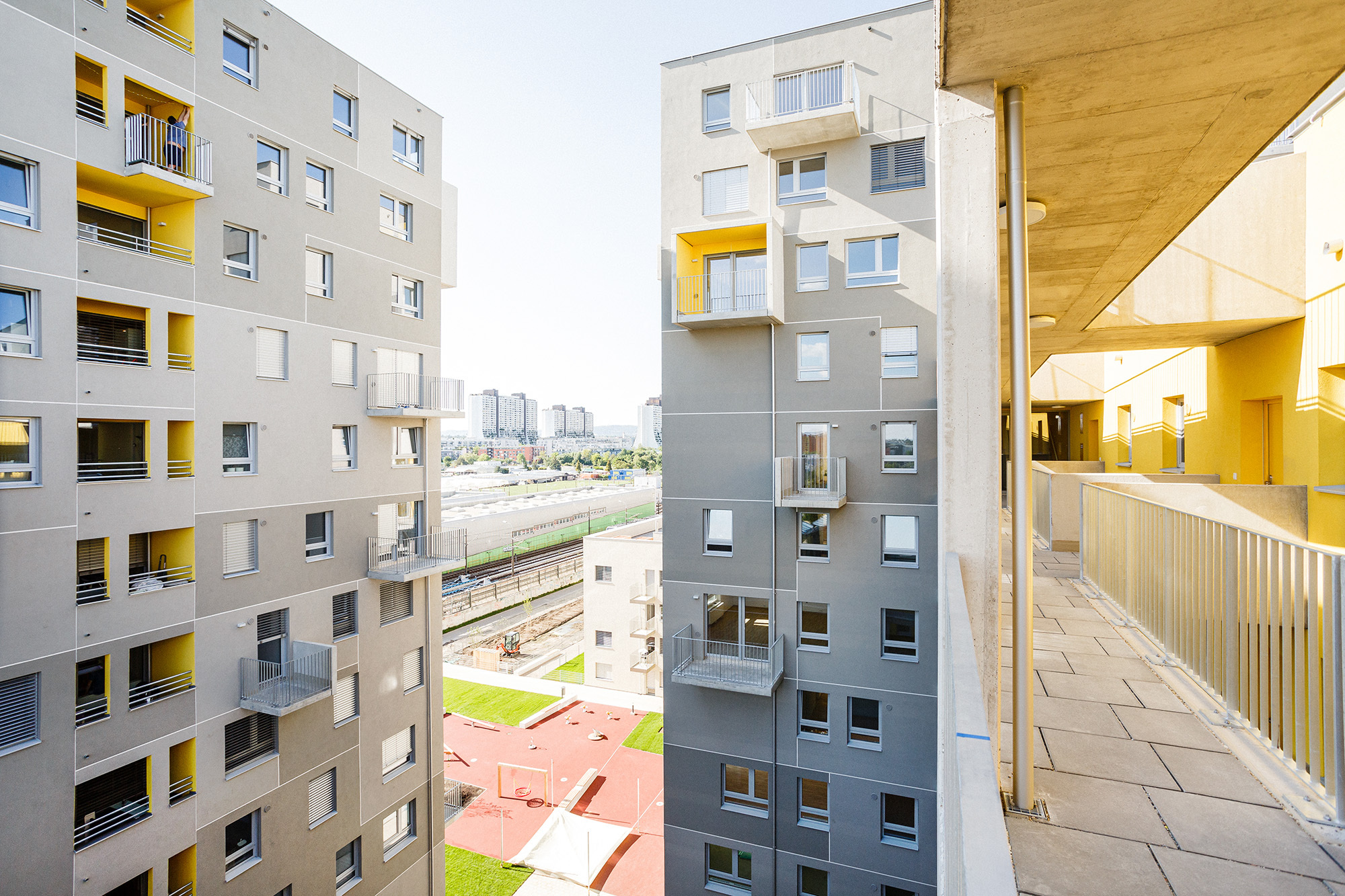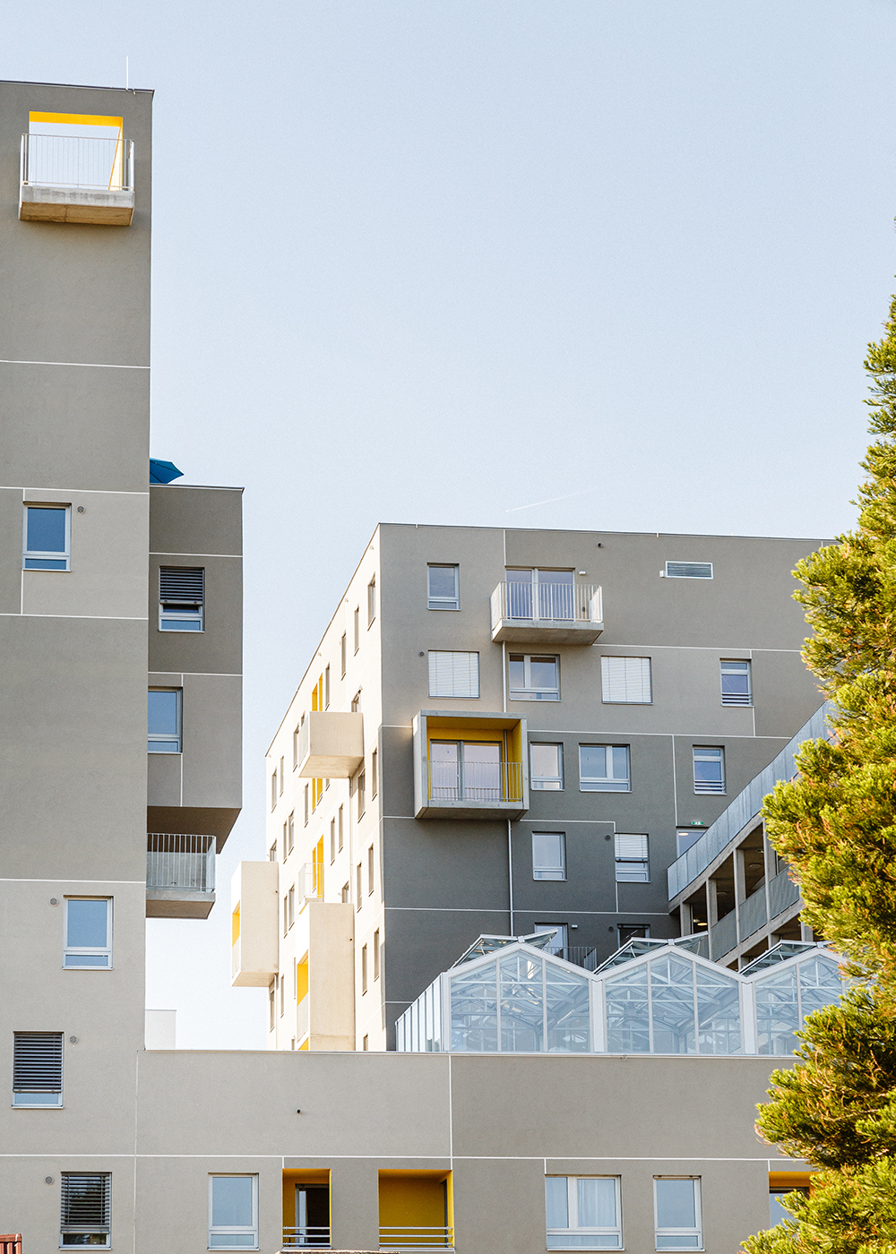 Querlüftung der Wohnungen: Im Sinne eines guten Raumklimas und besonders in Hitzeperioden erscheint eine zweiseitige Orientierung der Wohnungen wesentlich. Durch das Auflösen der Baukörper wurde eine große Anzahl an über Eck orientierten Wohnungen generiert, der Mittelgang in den Punkthäusern erhält durch öffenbare, brandmeldegesteuerte Klappen eine Querlüftung, welche gerade an hitzigen Tagen spürbare Verbesserung bewirkt und für Frischluft sorgt, die Laubengänge ermöglichen querlüftbare Wohnungen.