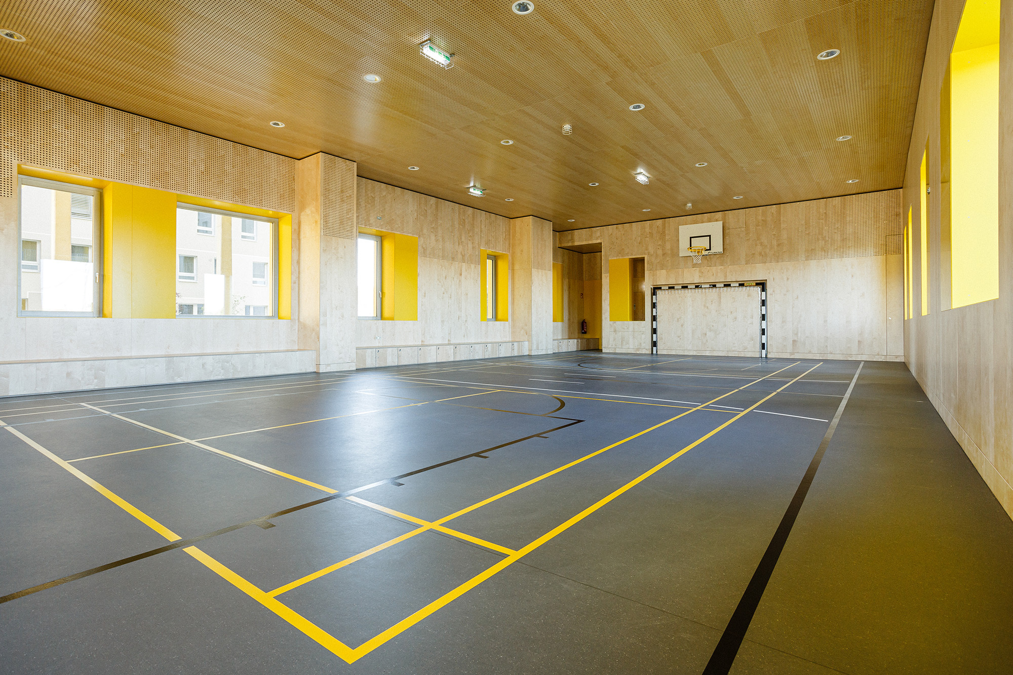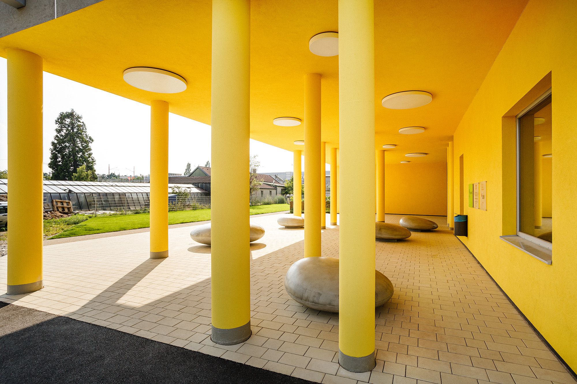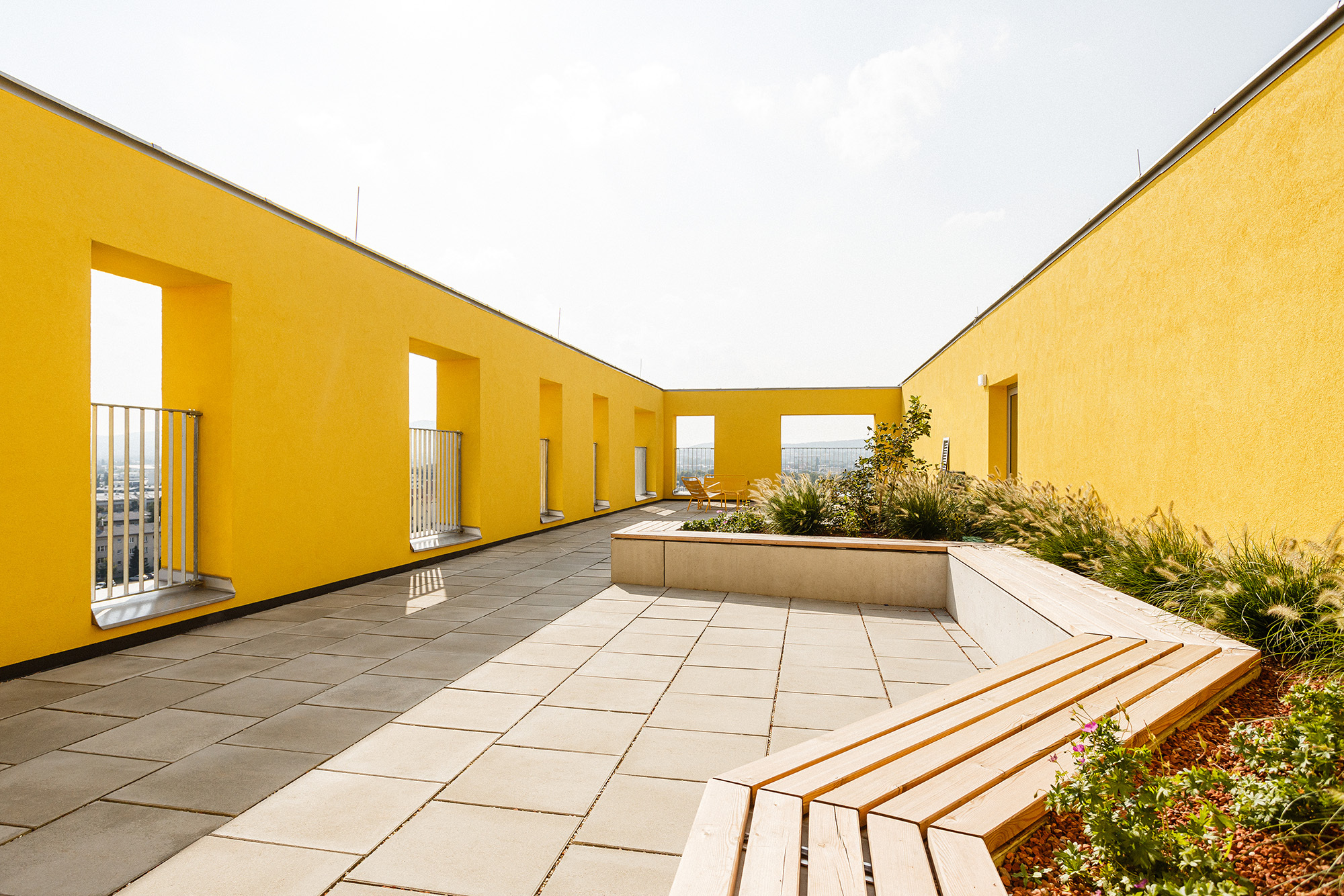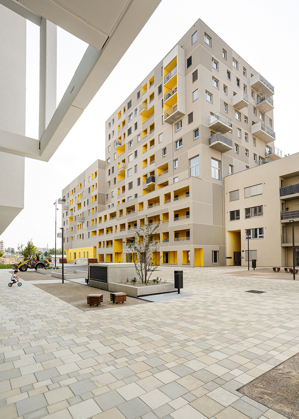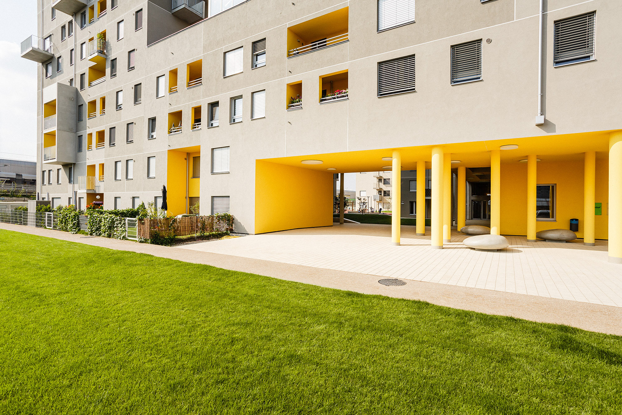 Querlüftung der Wohnungen: Im Sinne eines guten Raumklimas und besonders in Hitzeperioden erscheint eine zweiseitige Orientierung der Wohnungen wesentlich. Durch das Auflösen der Baukörper wurde eine große Anzahl an über Eck orientierten Wohnungen generiert, der Mittelgang in den Punkthäusern erhält durch öffenbare, brandmeldegesteuerte Klappen eine Querlüftung, welche gerade an hitzigen Tagen spürbare Verbesserung bewirkt und für Frischluft sorgt, die Laubengänge ermöglichen querlüftbare Wohnungen.