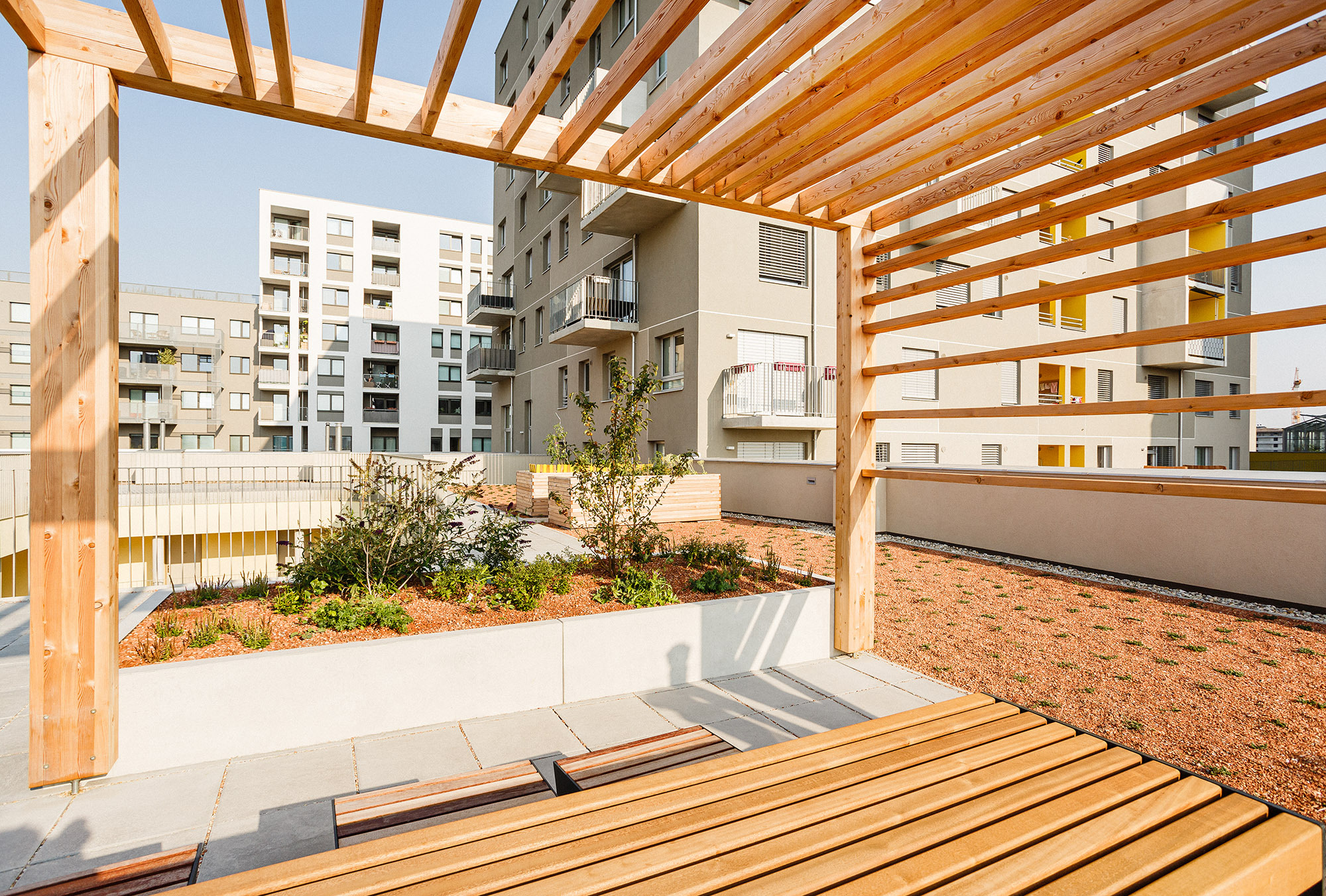 Kühlung: Die begrünten Dachflächen -die wiederum dem Thema „Urban Gardening“ Rechnung tragen, wirken durch Verdunstung als übergroßes Kühlgerät und speichern anfallendes Regenwasser.