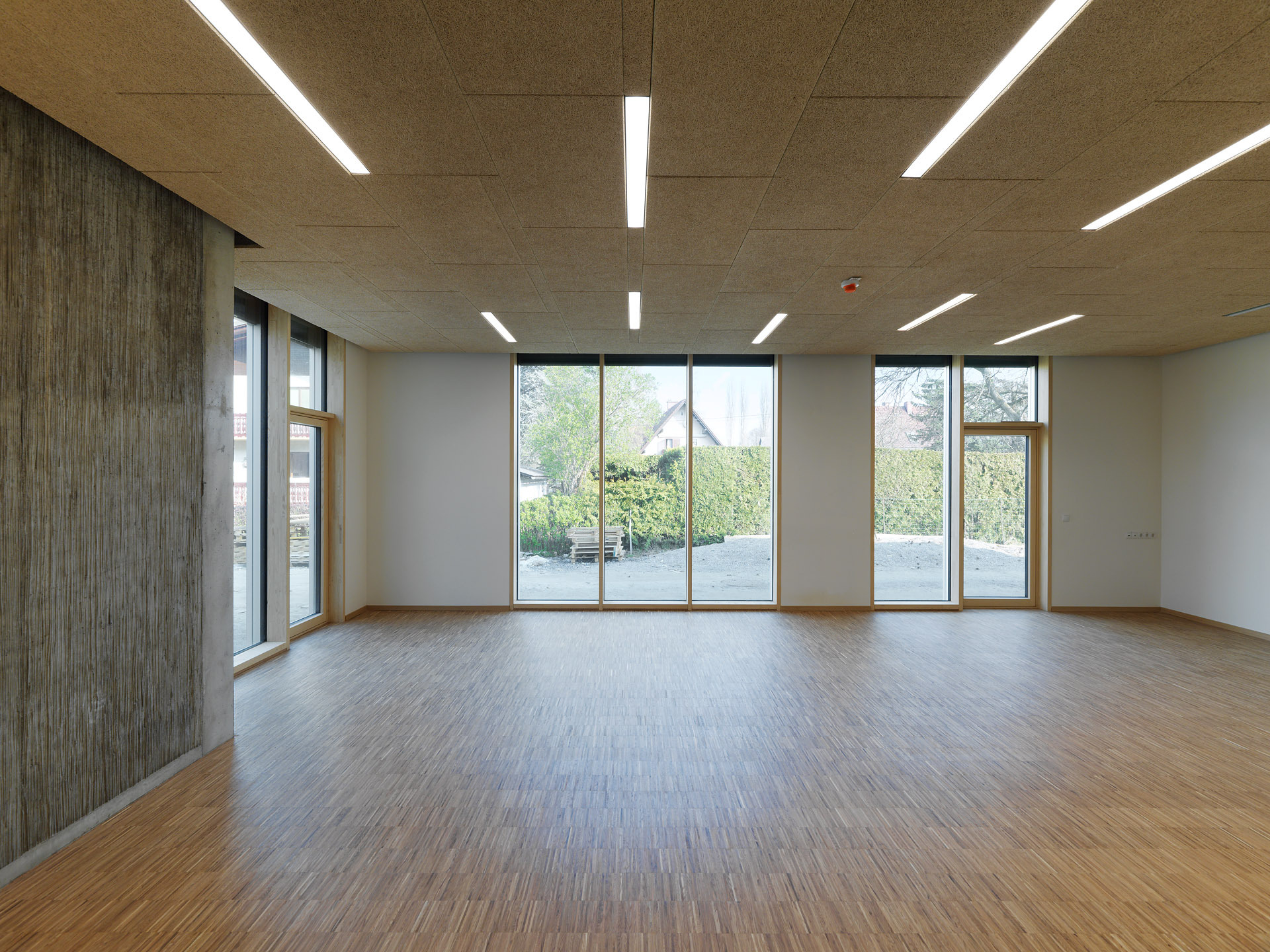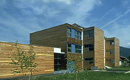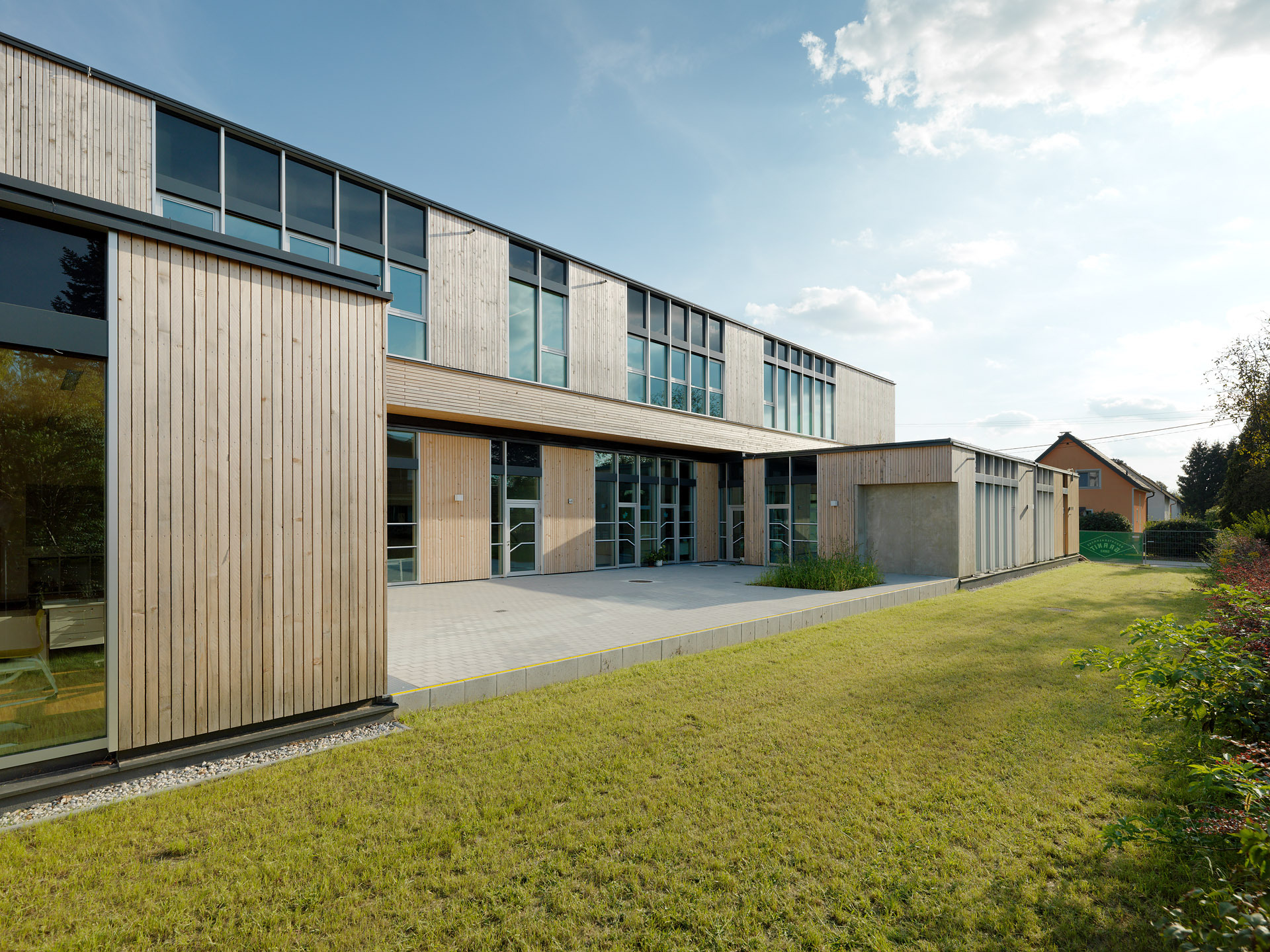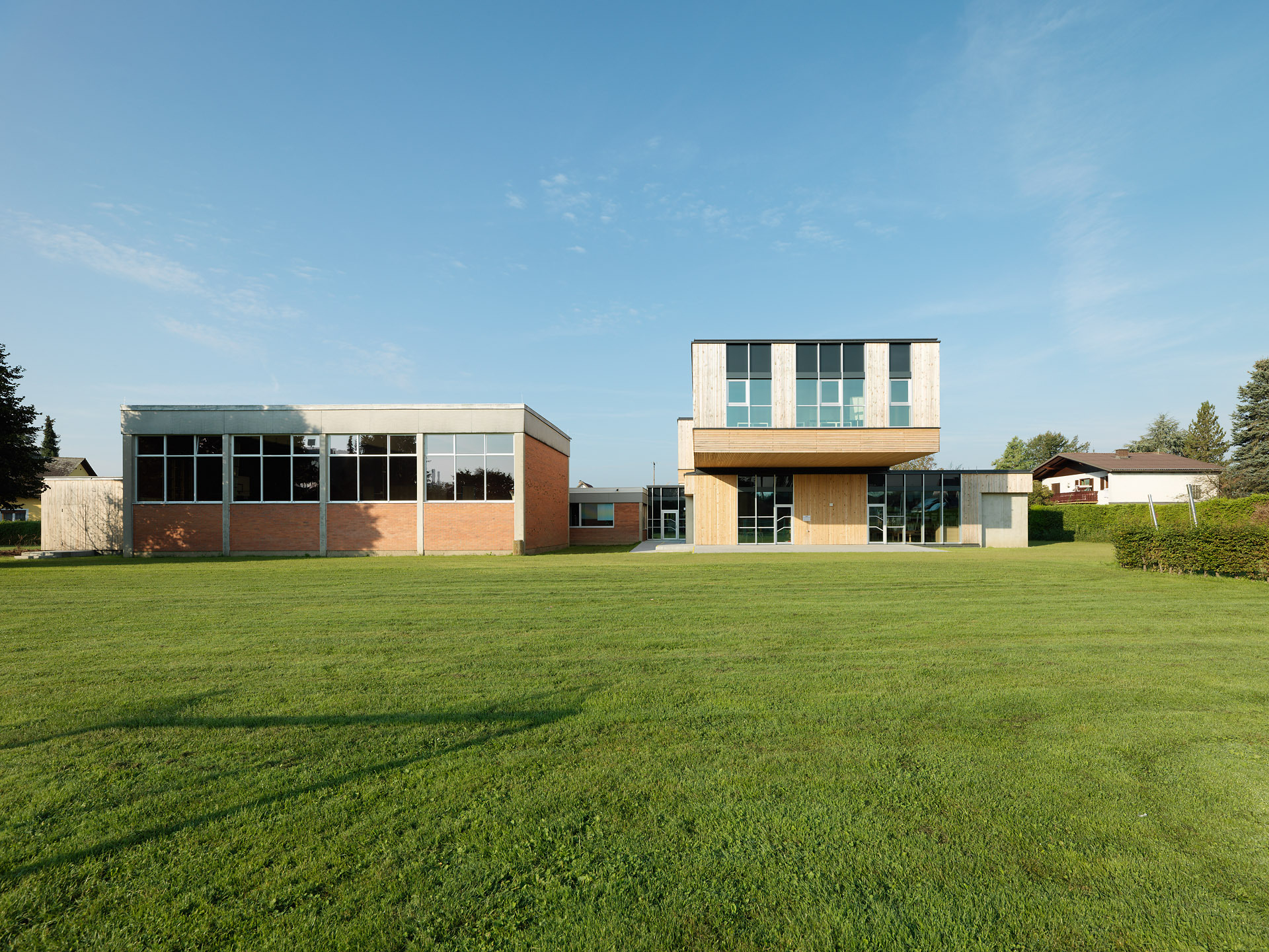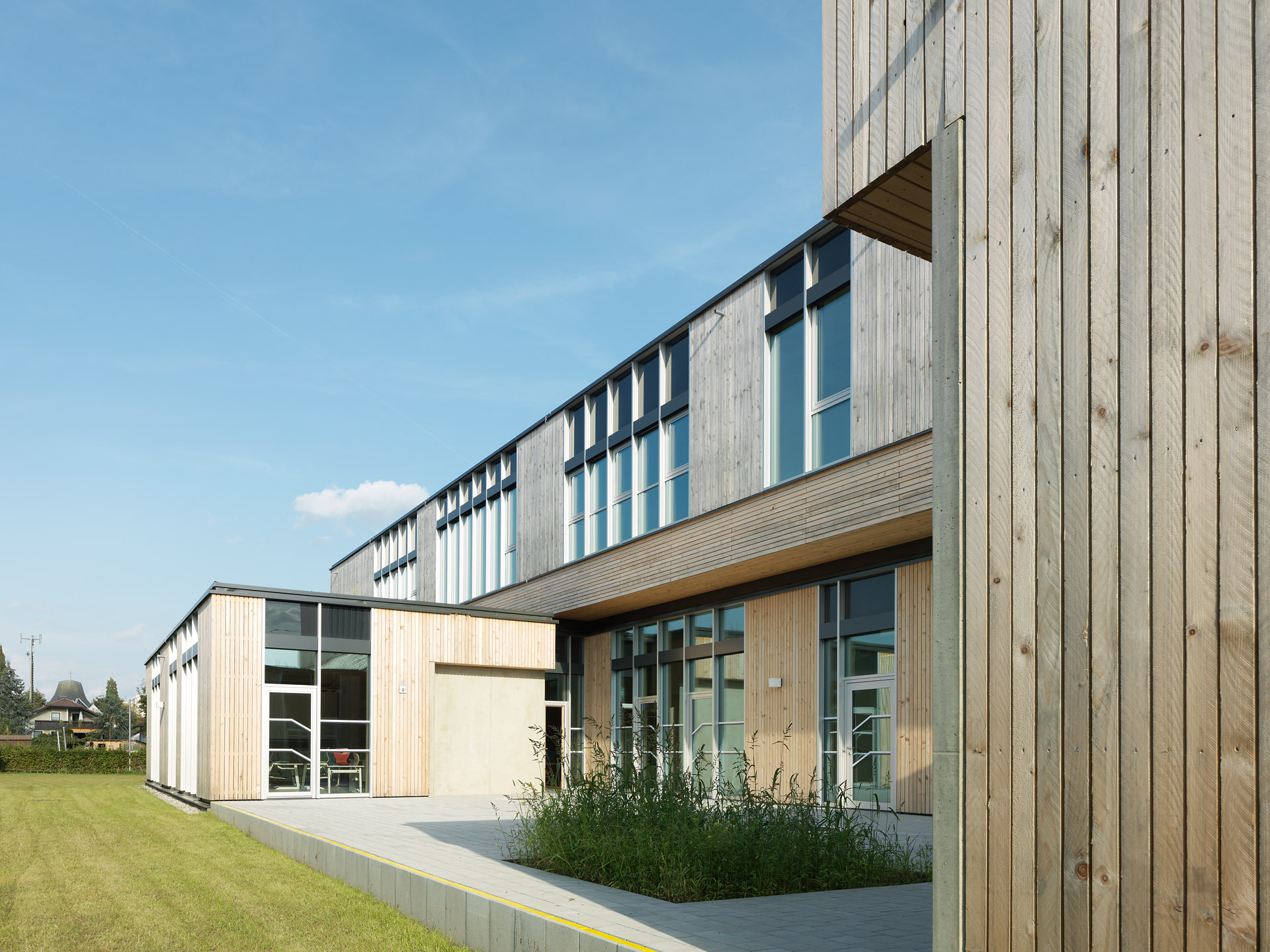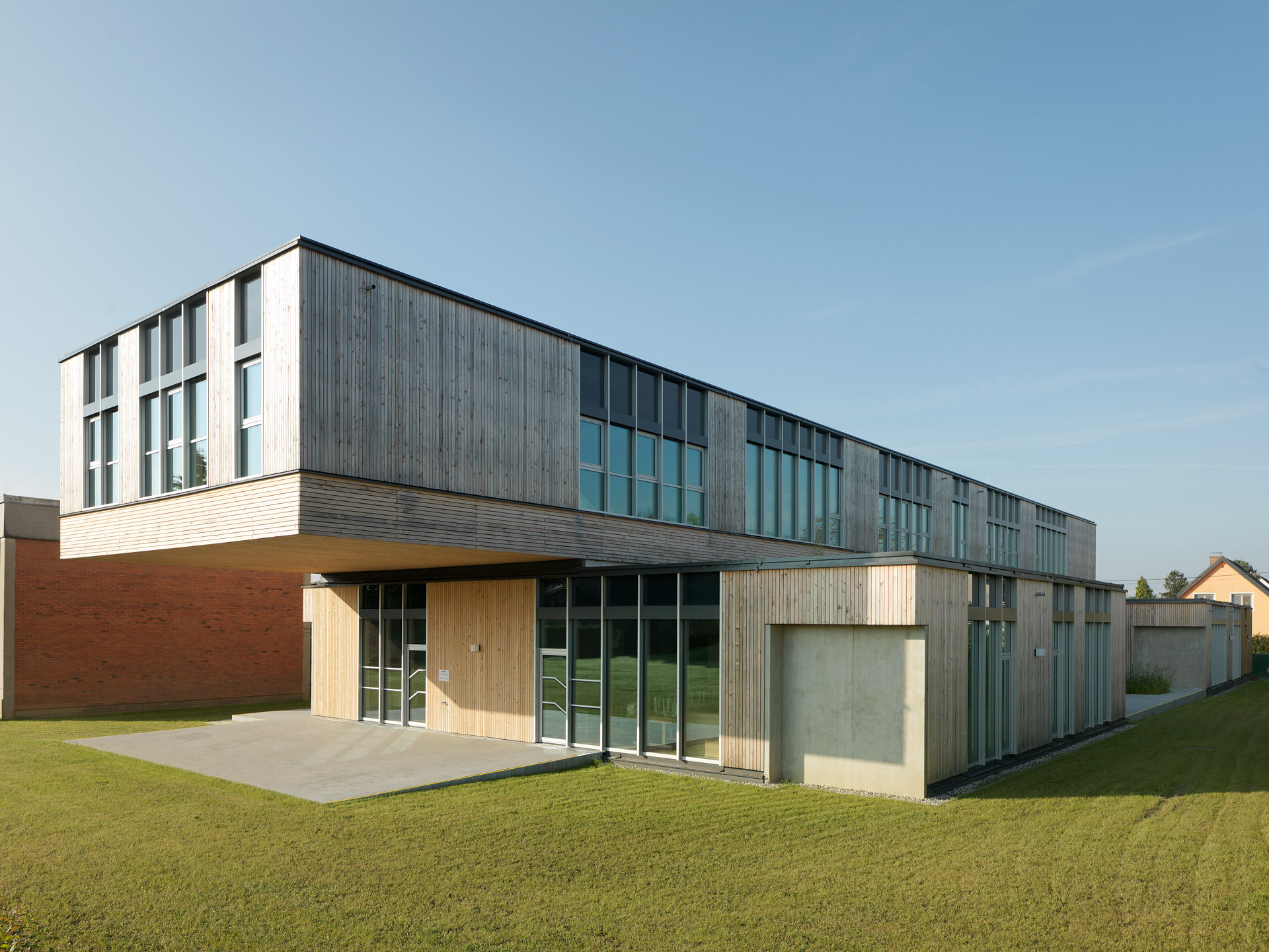 Zum ProduktReduzierung von Stahlbeton, oberste Decke aus Brettschichtholz, Außenwände größtenteils in Holzbauweise. Tannenholzfassade unbehandelt. Außenliegender Sonnenschutz.
