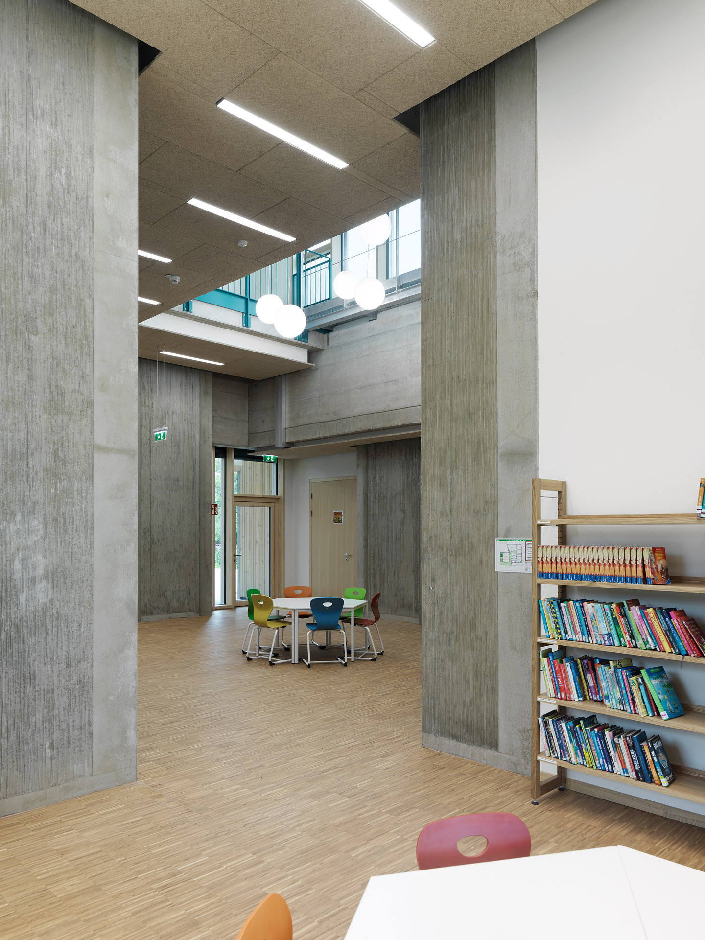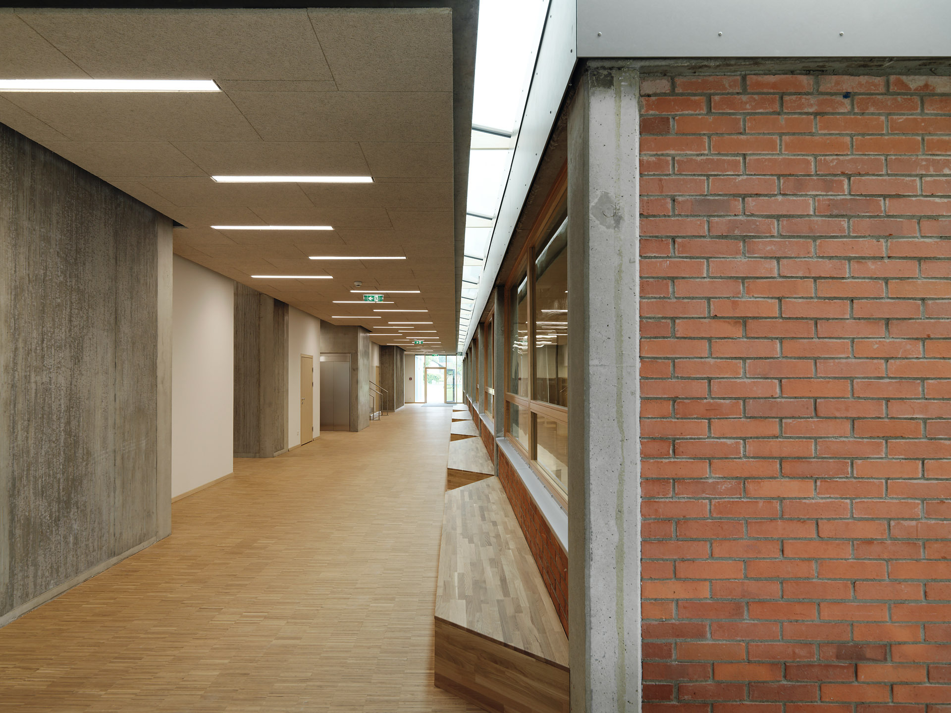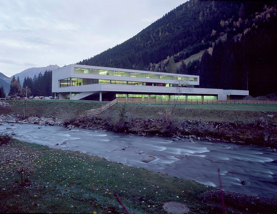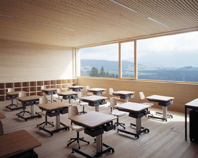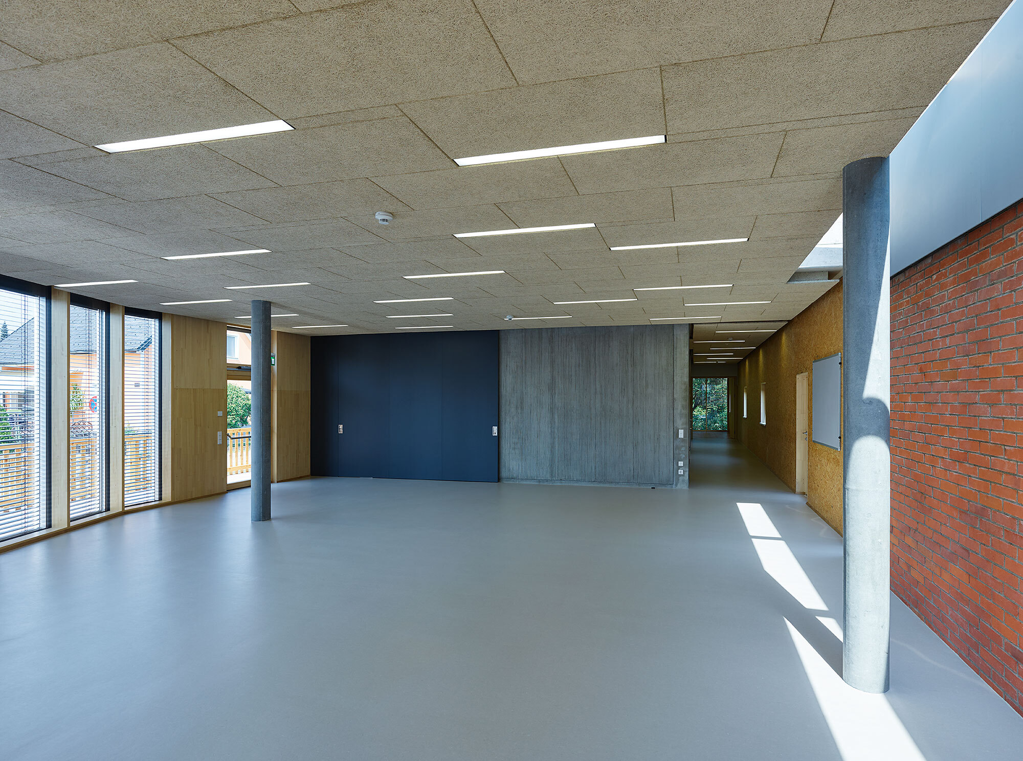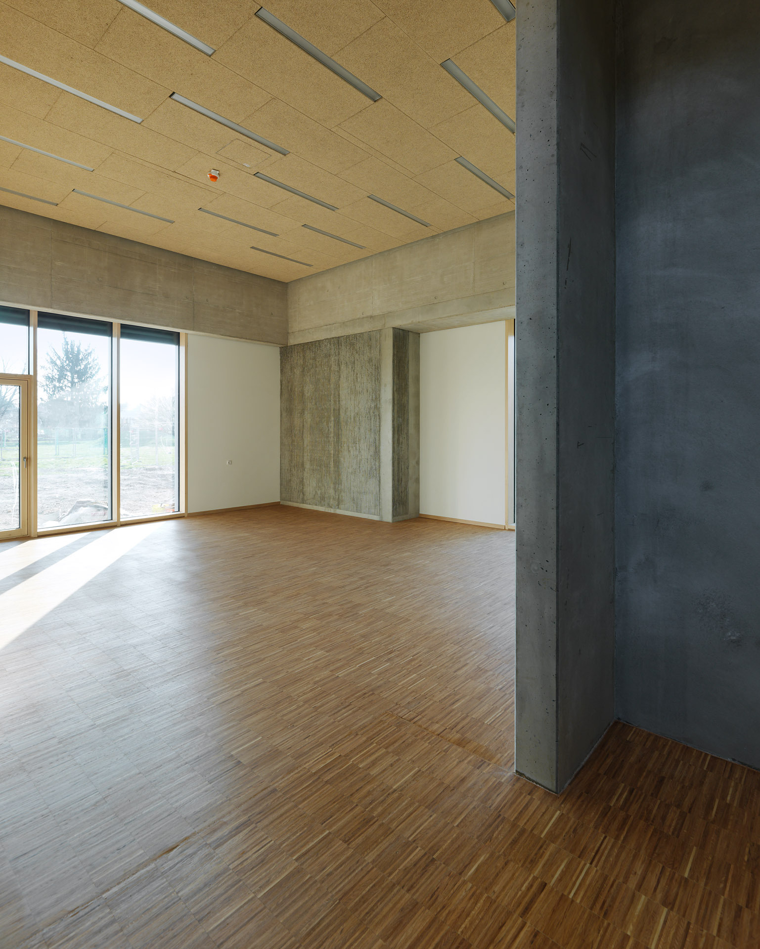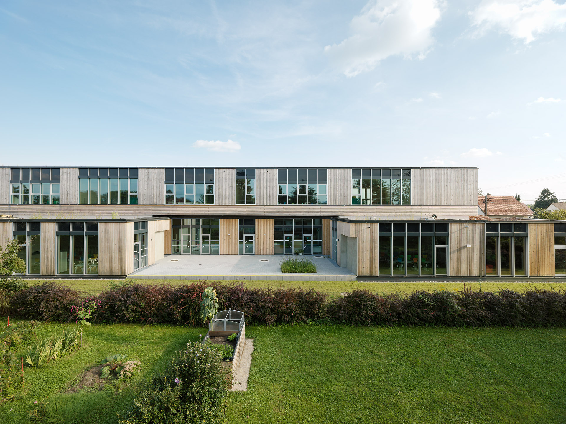 Zum ProduktReduzierung von Stahlbeton, oberste Decke aus Brettschichtholz, Außenwände größtenteils in Holzbauweise. Tannenholzfassade unbehandelt. Außenliegender Sonnenschutz.