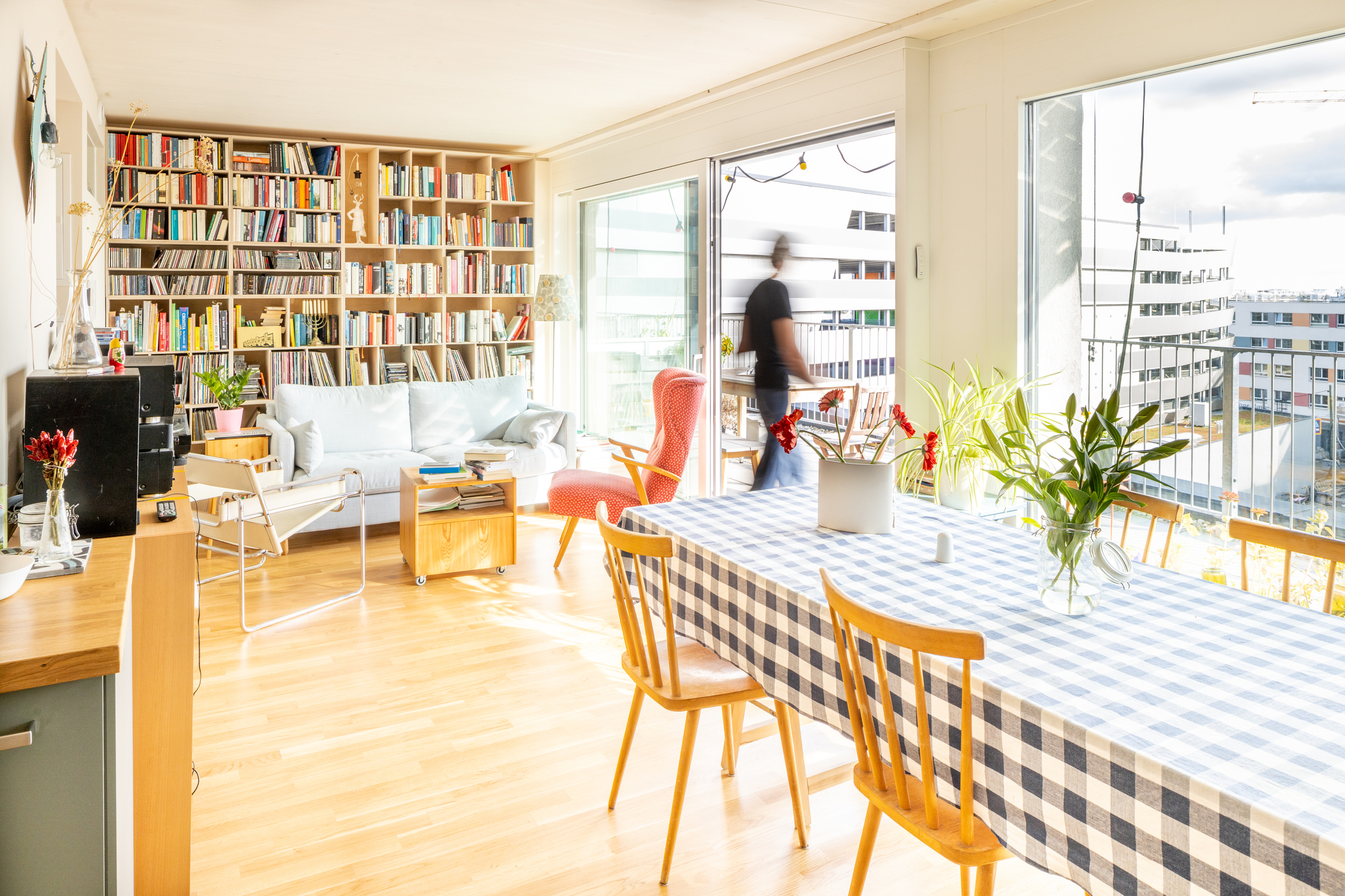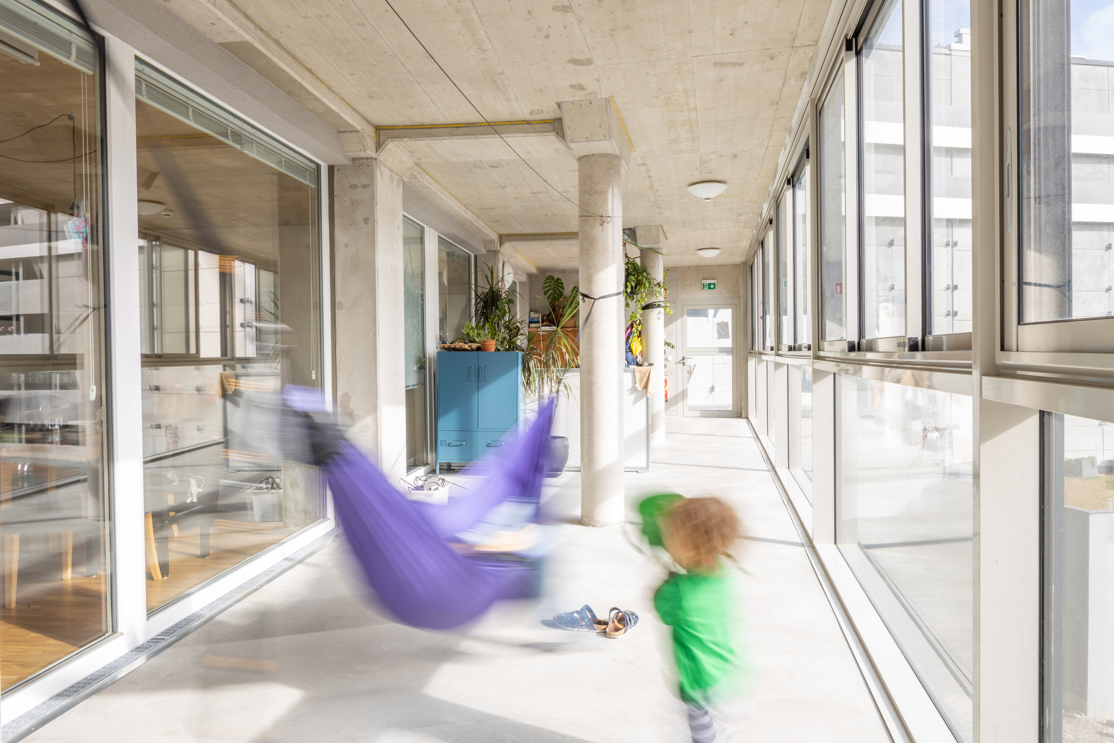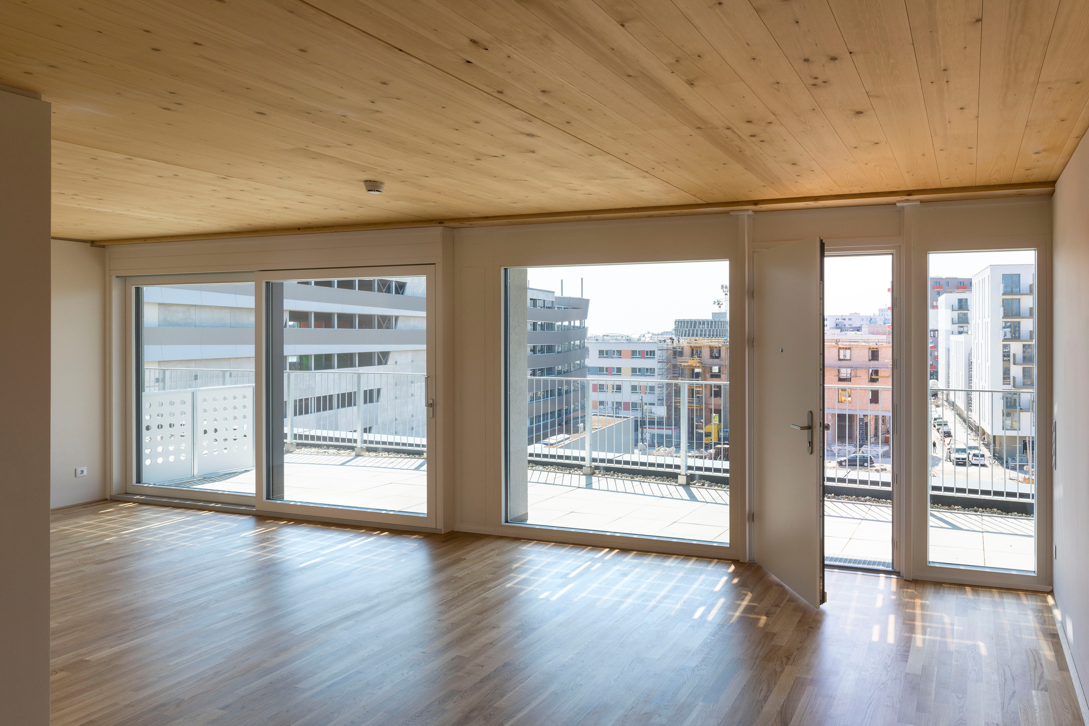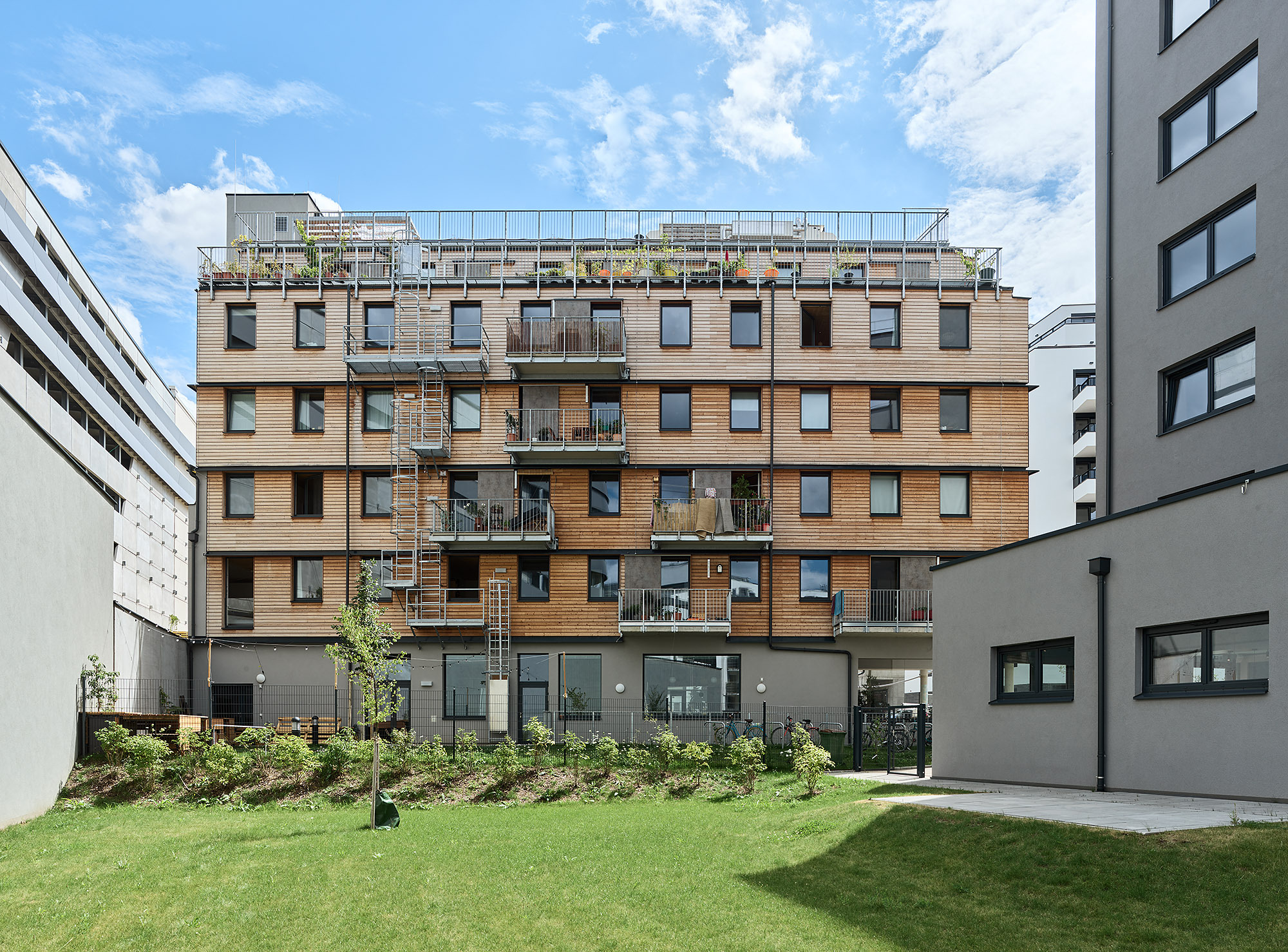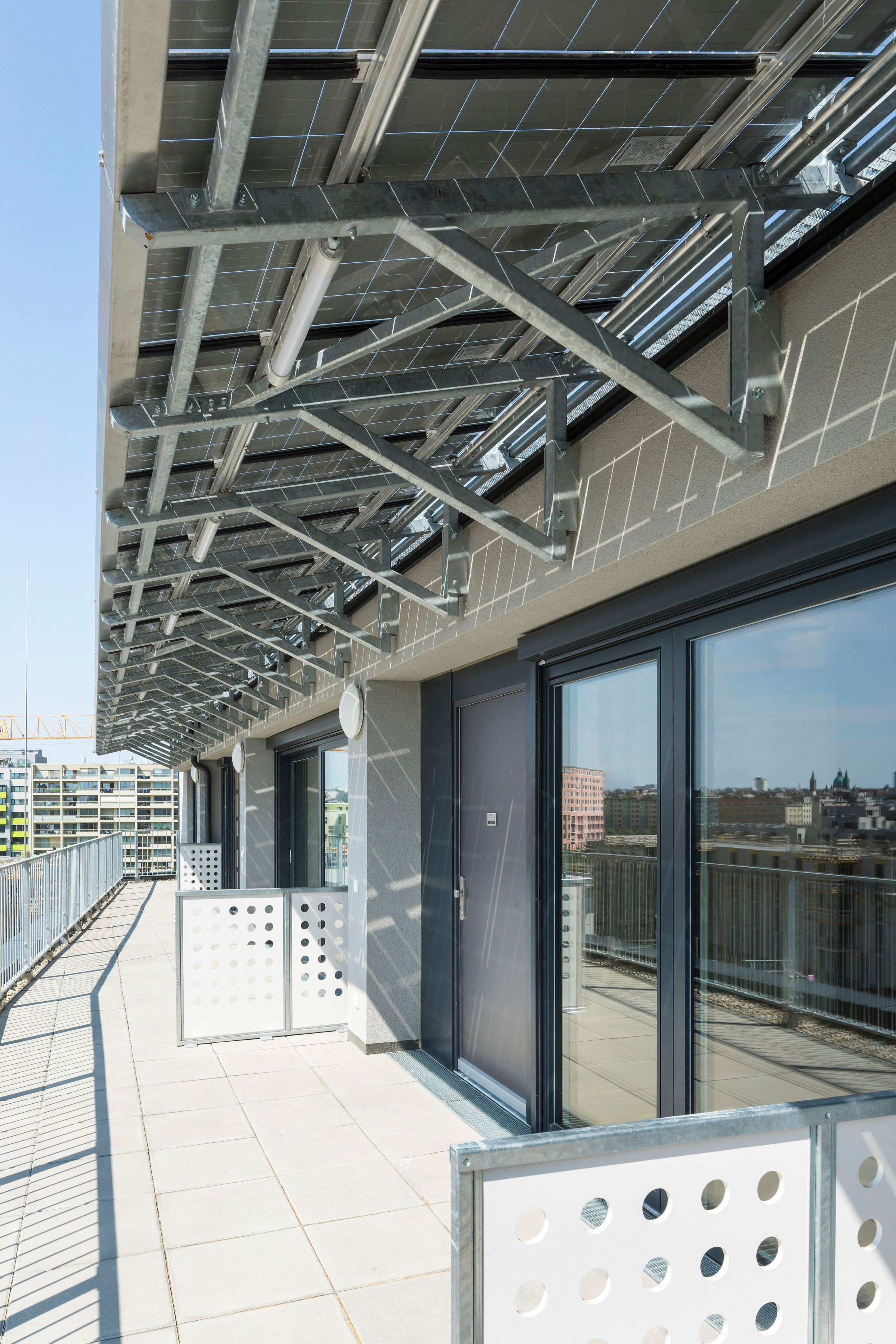 Zum ProduktDer kompakte Baukörper entspricht dank der hohen Wärmedämmung und der Lüftungsanlage dem Passivhausstandard. Die Belüftung erfolgt über eine Lüftungsanlangen mit Wärmerückgewinnung, die Luftverteilung über zwei vertikale Schächte. Der Wintergarten ist nicht beheizt, seine Masse kann die Sonnenwärme des Winters und die Nachtkühle des Sommers gut speichern. Die äußere Glaswand ist über die gesamte Länge mit doppelt verglasten Schiebefenstern ausgestattet. Automatisch öffnende Türen des Wintergartens, die gemeinsam mit einer Lüftungsöffnung am Dach des Stiegenhauses gesteuert sind, sorgen für sommerlichen Überhitzungsschutz. Der Heiz- und Warmwasserbedarf wird aus dem Netz der Wiener Fernwärme gedeckt. Die monokristalline Photovoltaik-Anlage umfasst 39 m² (6,1 kWp) und dient auch der Beschattung. Die Produktion betrug von 1.1.2021 bis Ende 7.2021: 3.839 KWh. Der Eigenverbrauch lag 2020 bei etwas mehr als 70% Das Regenwasser wird teilweise am Dach gesammelt und gänzlich vor Ort versickert. Es wurden für das Projekt ca. 370m² Brett- Sperr-Holz verbaut, des Weiteren kommen noch ca. 45m³ KVH , BSH ca. 10m³,ca. 500 m² Fassadenschalung Lärchen Rhombus und 2,75m³ Baubuche.