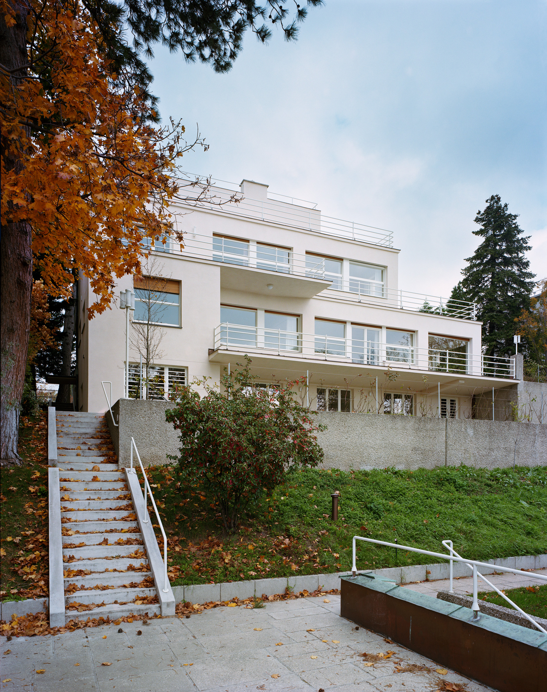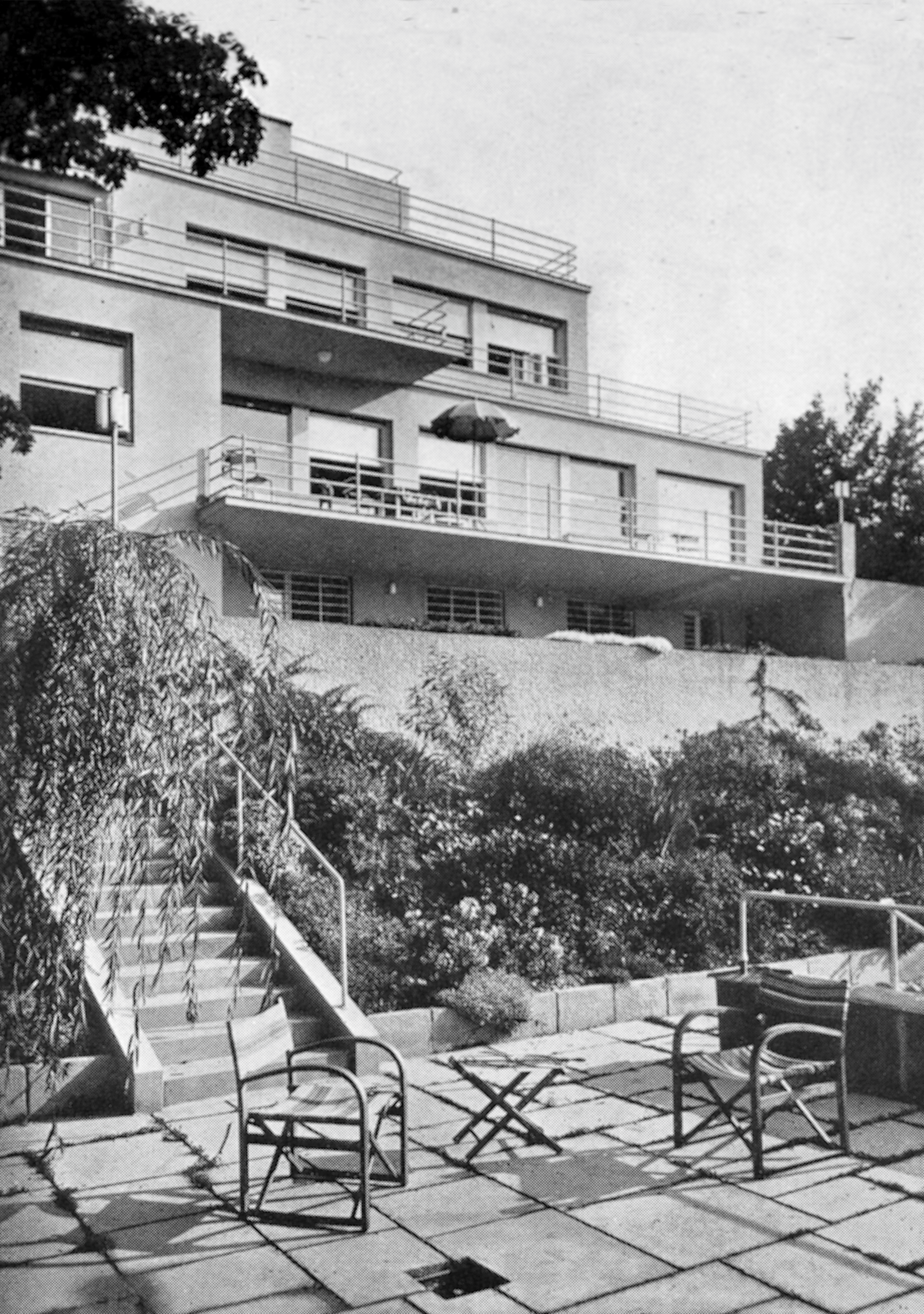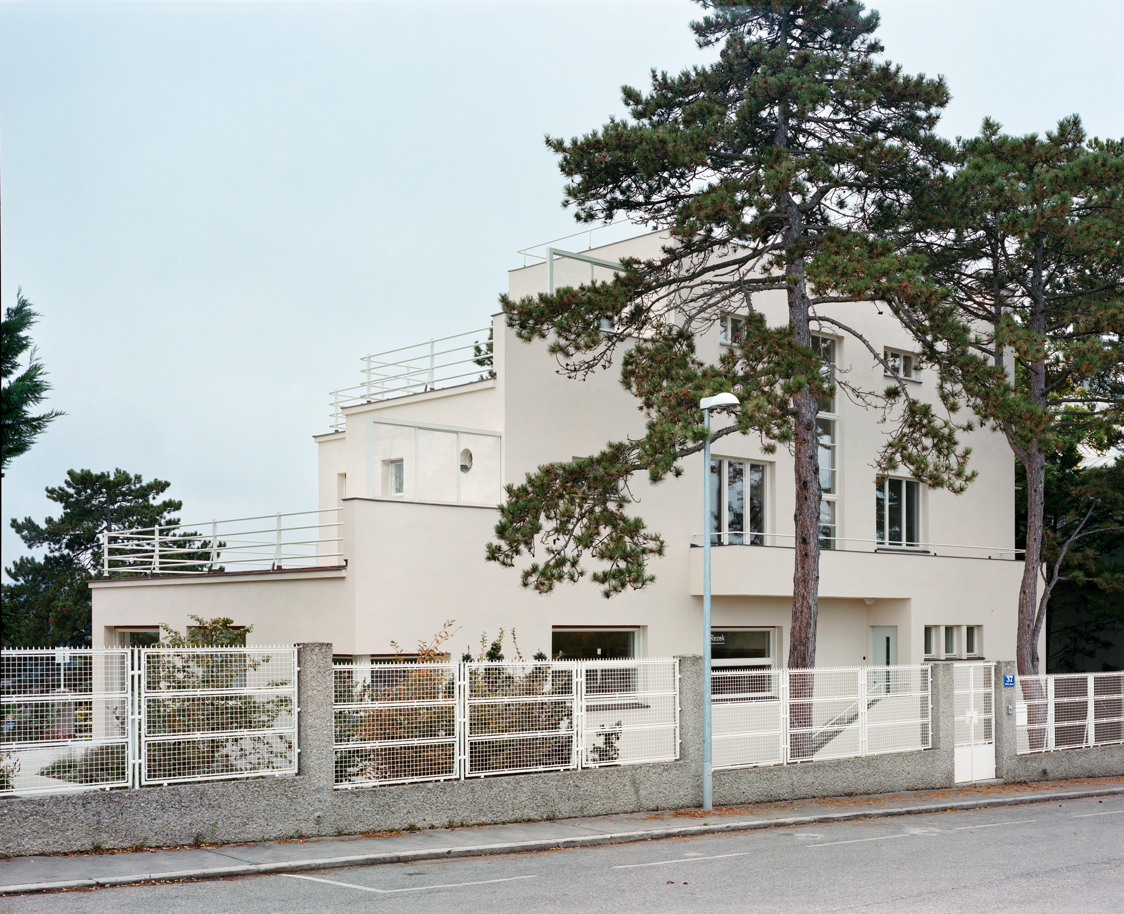 Souverän nimmt die streng abgetreppte, aus mehreren gestapelten Quadern komponierte Villa mit vier Wohn- und einem Untergeschoß das Gelände so in Besitz, dass sich das Panorama über die sonnenbeschienene Stadt wie auf dem Serviertablett präsentiert. Jede Ebene hat eine Terrasse, seitlich treppen sich zwei kaskadenartige Außenstiegen den Hang hoch, für den es von Gartenarchitekt Albert Esch einen Bepflanzungsplan gab. Den Wintergarten kann man mit etwas gutem Willen als Variation des Wintergartens der Villa Tugendhat von Mies van der Rohe in Brünn (1929/30) interpretieren. Dort reicht er über die gesamte Schmalseite der Wohnebene, in Wien ist er am Eck eingeschnitten. Parallelen lassen sich finden. So waren auch die Fenster des Wintergartens der Villa Rezek zur Gänze im Boden zu versenken. Dass sich die Scheiben vor die Wände des darunterliegenden Dienstbotenzimmers schoben, störte keinen.