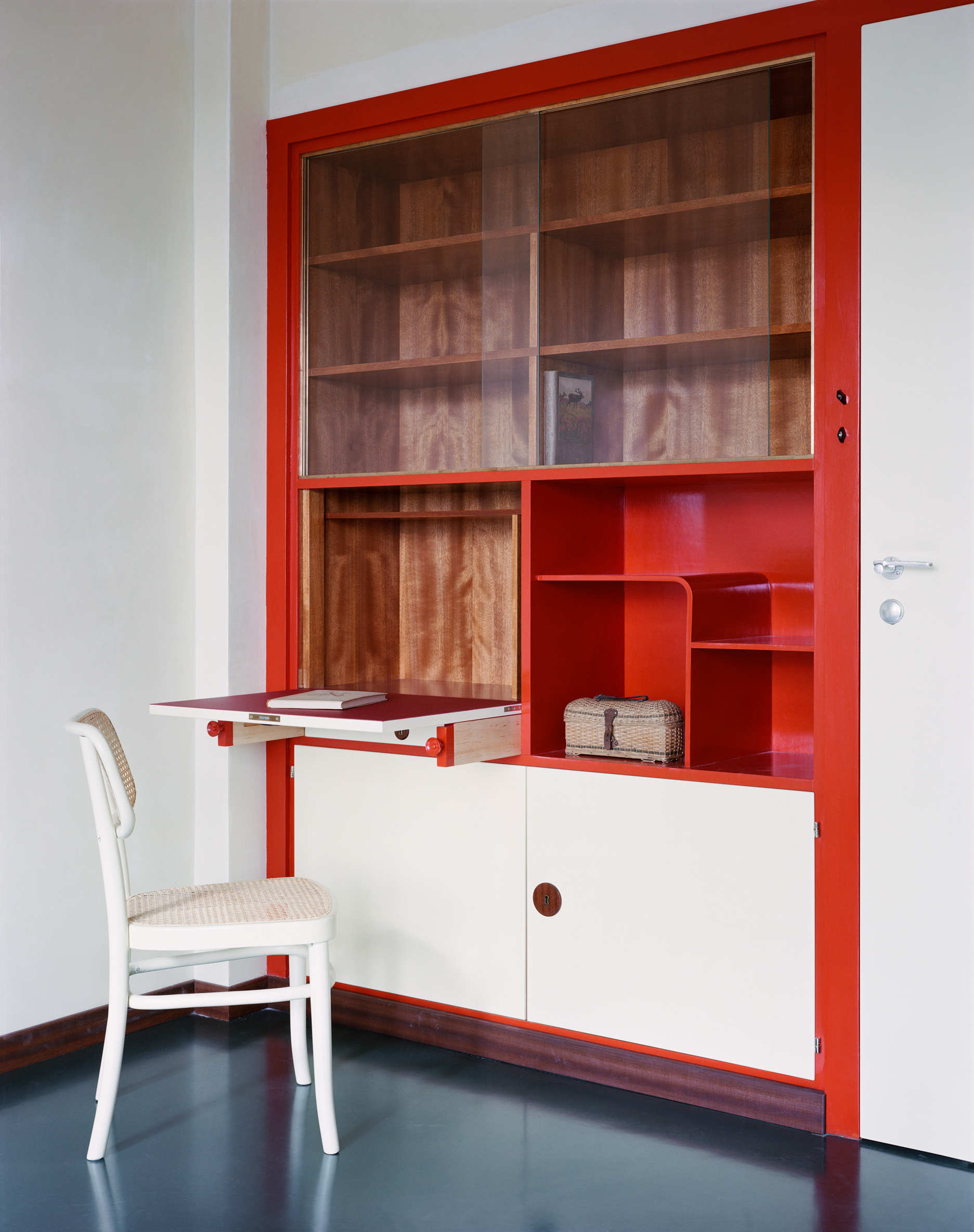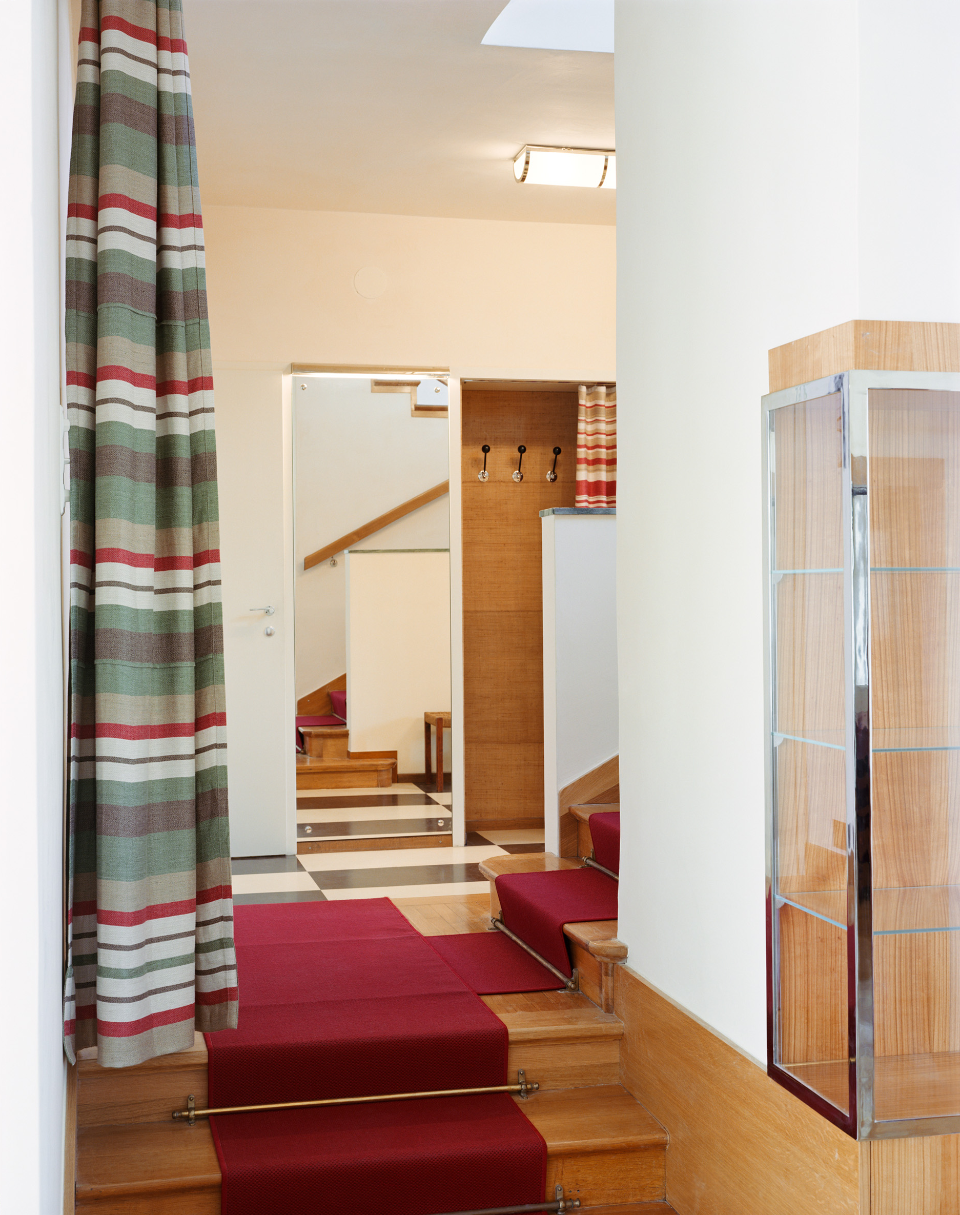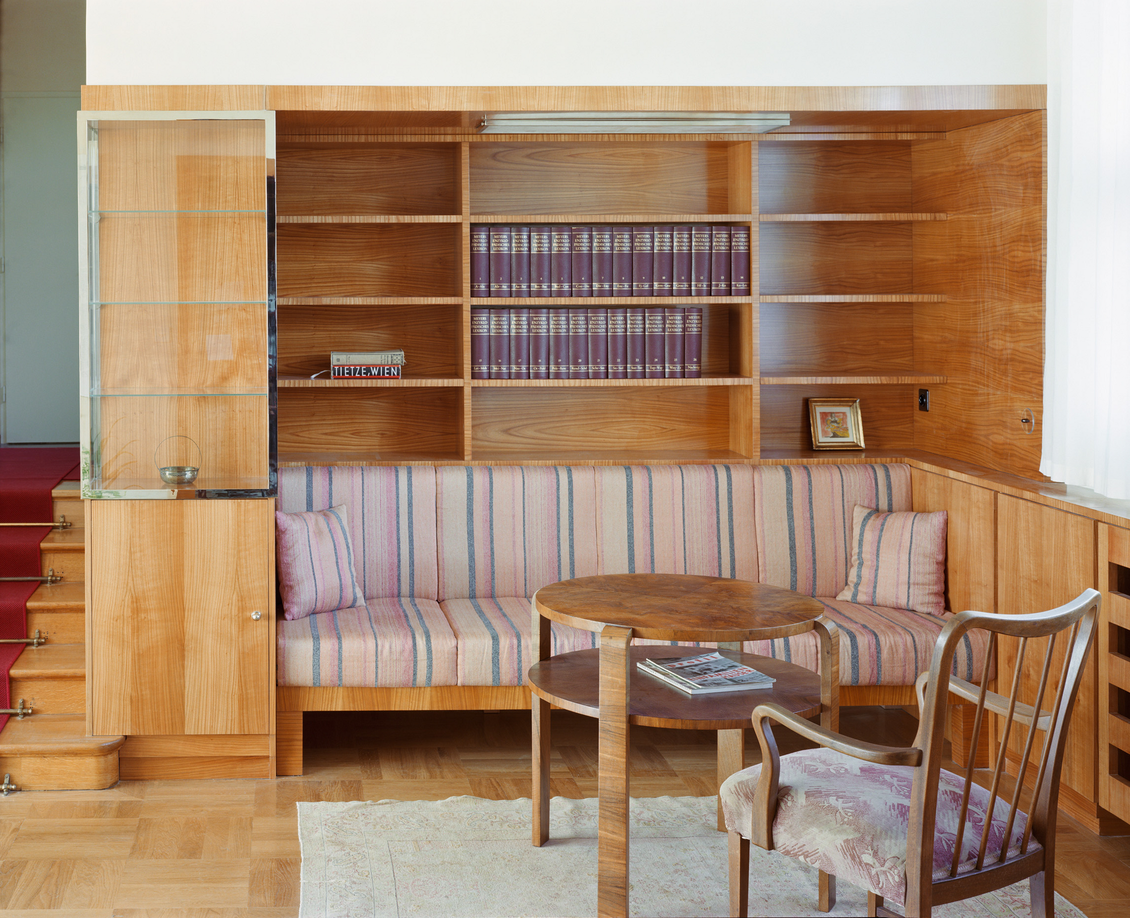Die Rolle der Architektenteams ist essenziell, denn Parameter wie Barrierefreiheit, Fluchtwege, Statik, Haustechnik, Brandschutz sind kaum verhandelbar. Der CMP umfasst auch die künftige Erhaltung und Vermittlung des Denkmals, er ist quasi ein Wartungsbuch. Das Bundesdenkmalamt subventionierte ebenso die wissenschaftliche Untersuchung von Bauhistorie, Putz, Stein, Beton, Holz und Metall. Restauratorin Claudia Riff-Podgorschek befundete die Wandflächen: Der originale Putz war beige-sandfarben. Die Vorstellung einer „weißen Moderne“ ist vor allem der Schwarz-Weiß-Fotografie ihrer Zeit geschuldet, die Villa Rezek trägt nun wieder Ocker. „Wir brachten den Kratzputz auf Kalkbasis in historischer Technik auf“, sagt Eisenköck, „ohne Zement, ohne Kunstharz, diese Wand atmet.“ Vollwärmeschutz gibt es keinen – dafür schlanke Vordächer. „Man kann so ein Haus nicht komplett einpacken, ein Oldtimer wird mit einem E-Motor auch nicht nachhaltiger.“ Details sind in der reduzierten Formensprache der Moderne besonders wichtig. Eisenköck untersucht und rekonstruiert sie akribisch. Die Steinbrüstung der Treppe, die sich so hochelegant von der Halle – mit Blick in den Wohnsalon und einem Richtungswechsel in den ersten Stock – windet, ist rekonstruiert. „Wie saniert man solche Details seriös? Man kann sich über Fotos mit Beschreibungstext oder das Studium anderer Objekte der Bauzeit annähern und je nach Priorität Rückschlüsse ziehen.“ Eisenköck hat viele Bauten besucht und ist einschlägig belesen. „Bei dieser Brüstung haben wir zwei Marmorplatten im Fuchsbau des Gartens gefunden. Dank der Löcher der Schrauben, mit denen der Metallkorb für die Pflanzen befestigt war, konnten wir sie richtig zuordnen.“ Die Villa Rezek war oft publiziert: Die britische Kunstzeitschrift „The Studio“ brachte 1936 einen Beitrag mit Fotos von Franz Mayer, die auch das Innere zeigten. Materialien, Farben, Möbel, alles war genau beschrieben. So erfuhr man, dass Schmutzwäsche durch Rohre von den oberen Etagen in die Wäscherei befördert wurde und Sonnenterrassen mit Duschen ausgestattet waren.