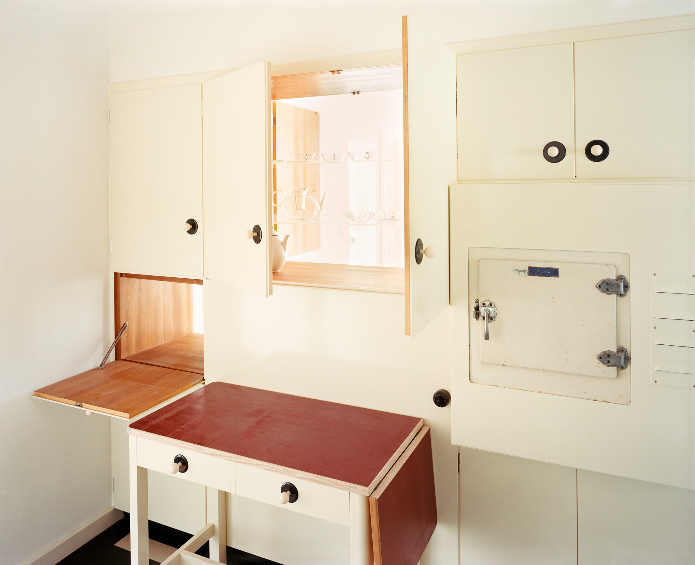 Die Rollladenkästen der Fenster, die in den Parapeten des Wohn- und Esssalons verschwinden konnten, waren noch im Original vorhanden. Es sind „Nikolaus Patentschiebefenster“, wie es sie damals in vielen Lungenheilanstalten gab. Mit der Tischlerei Sadofsky arbeiteten Architekt und Restaurator an einer Rekonstruktion des Mechanismus. Beim dritten Prototyp klappte es.