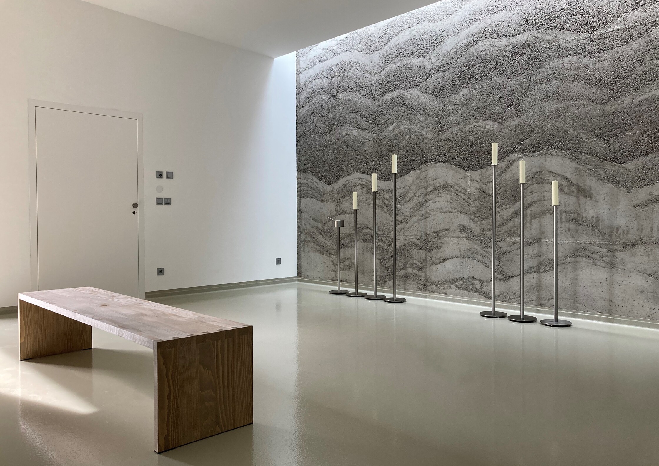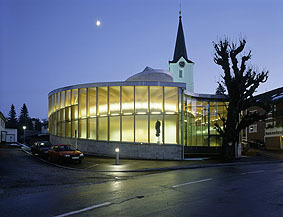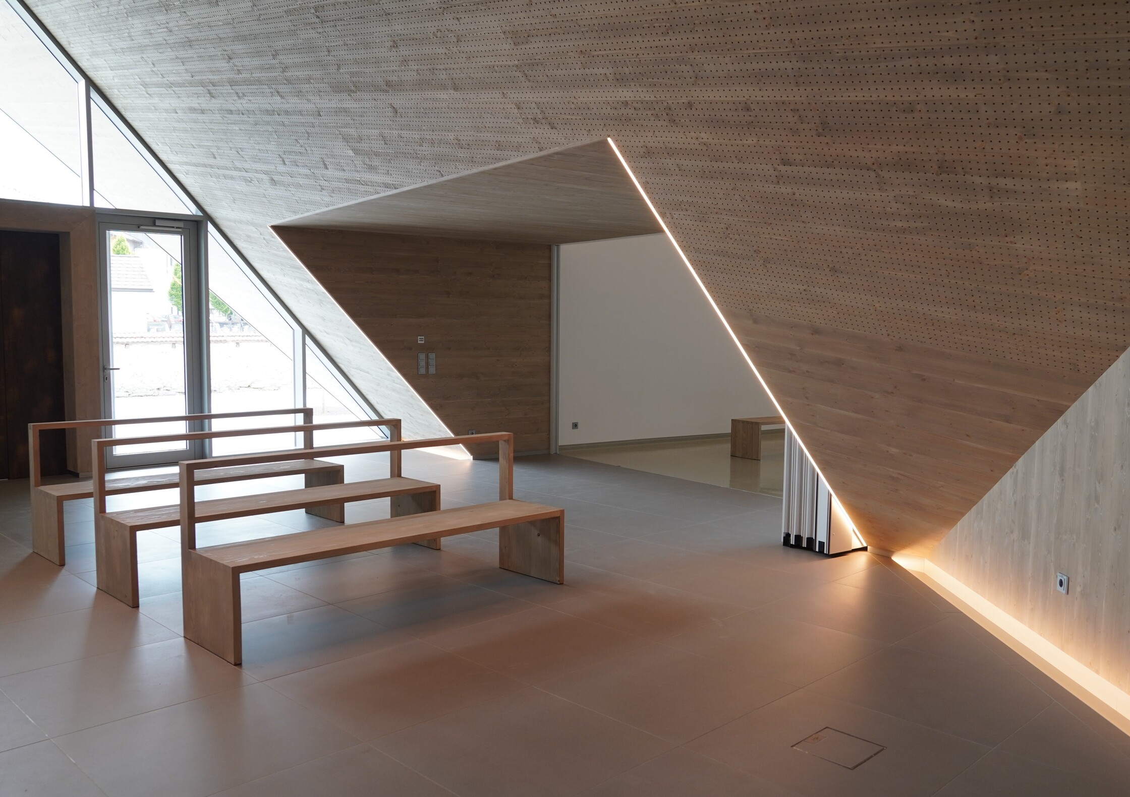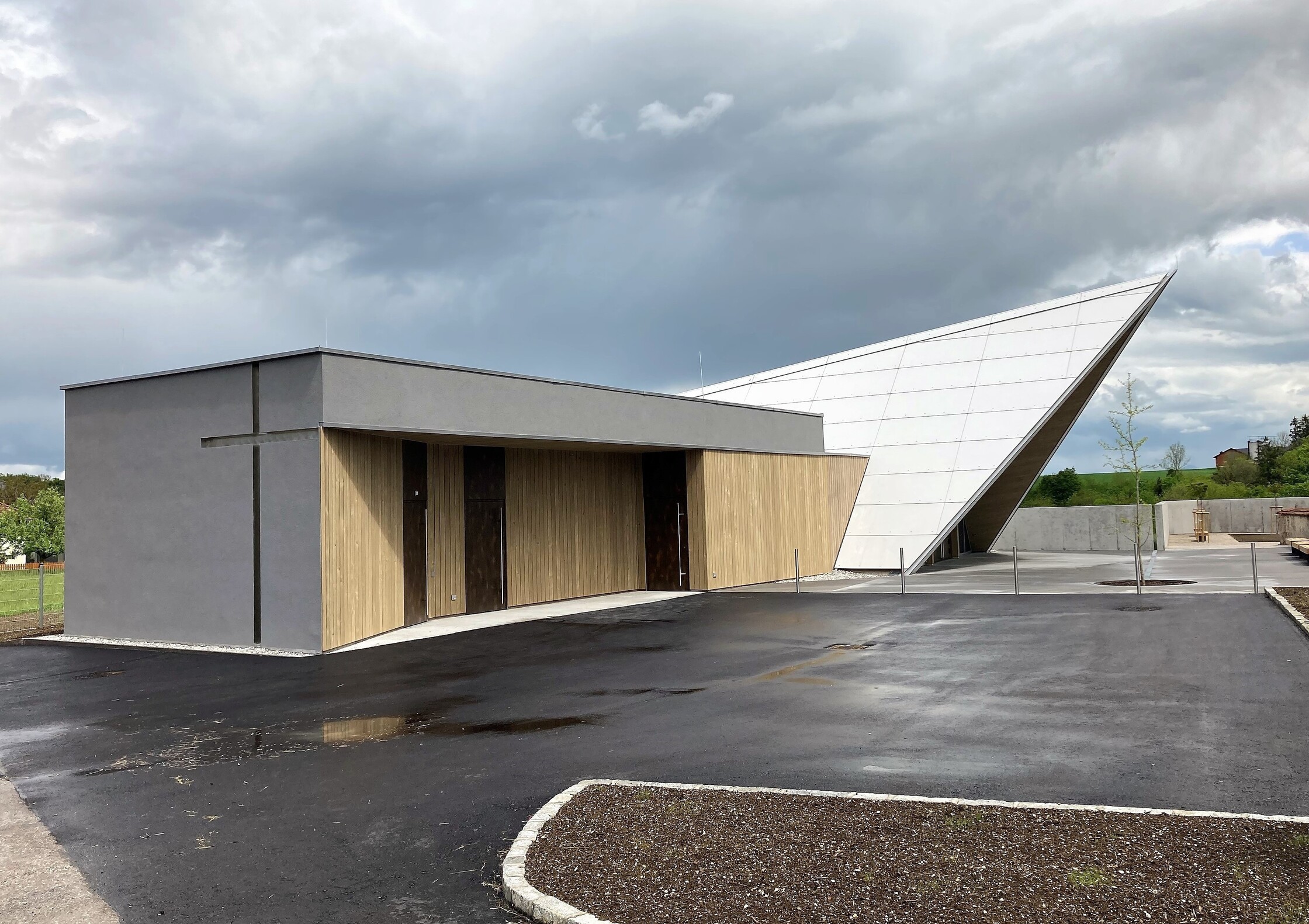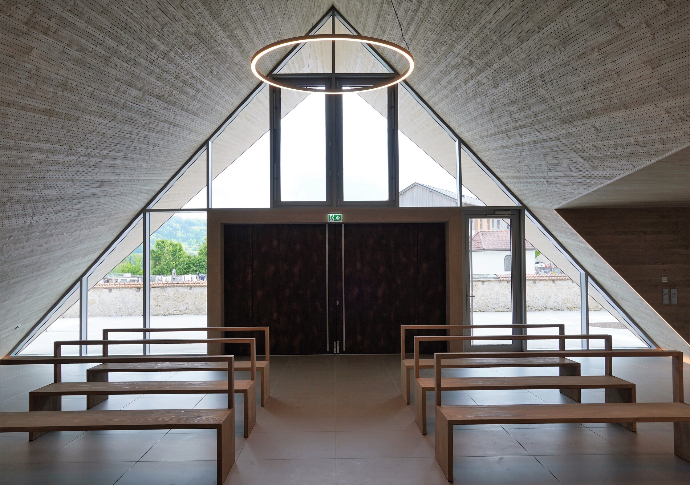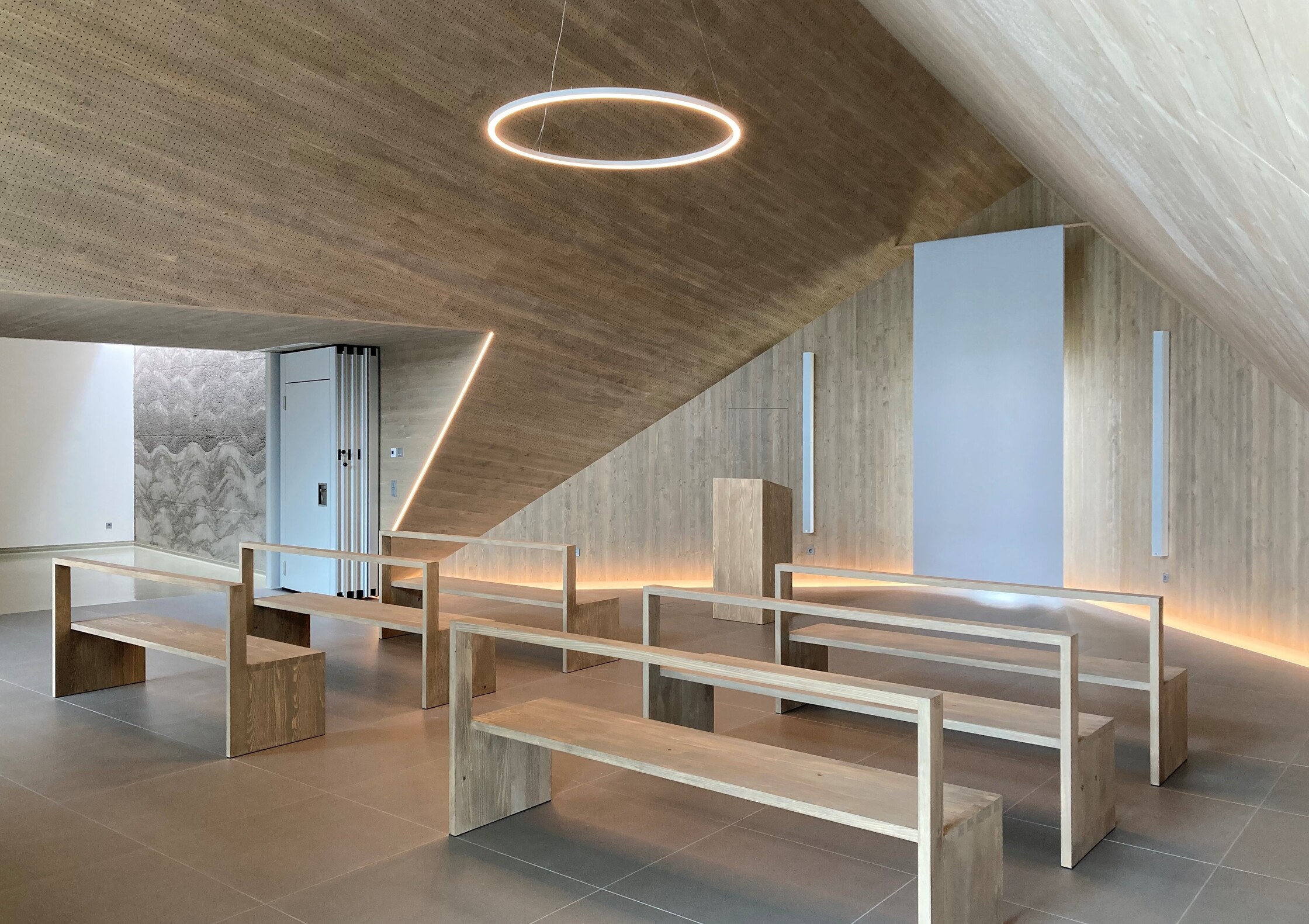 Da das Objekt jeweils nur für die relativ kurze Dauer der Verabschiedung genutzt wird, kommt lediglich eine schnell wirksame Fußboden-Induktionsheizung zum Einsatz. Aufgrund des hohen Abstrahlungswertes der weißen Dachfläche ist grundsätzlich keine Kühlung nötig, im Bedarfsfall kann eine Kühlzelle aktiviert werden.