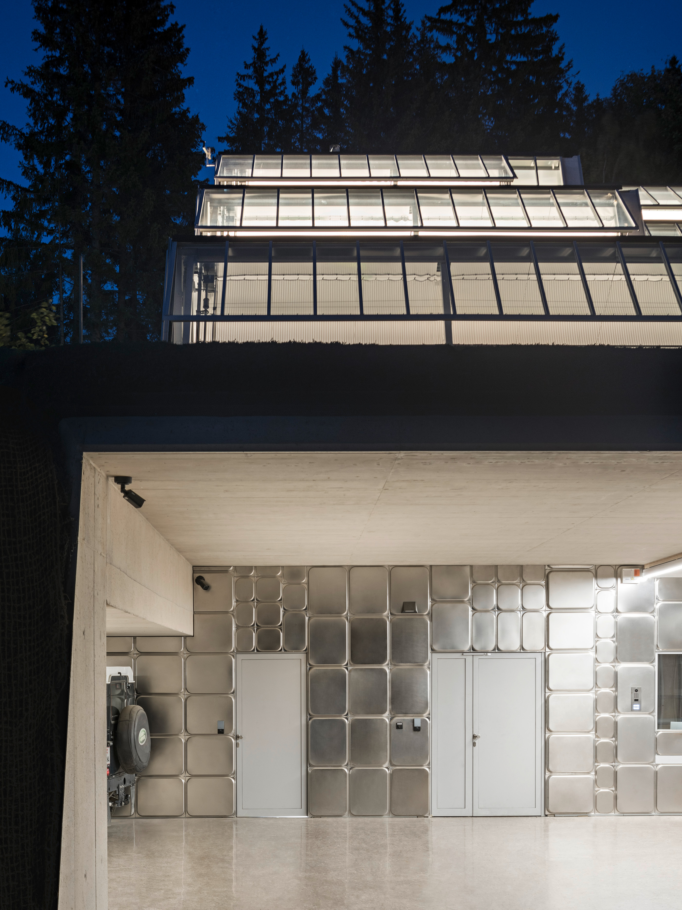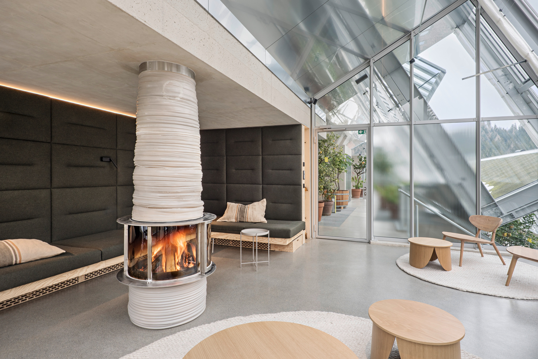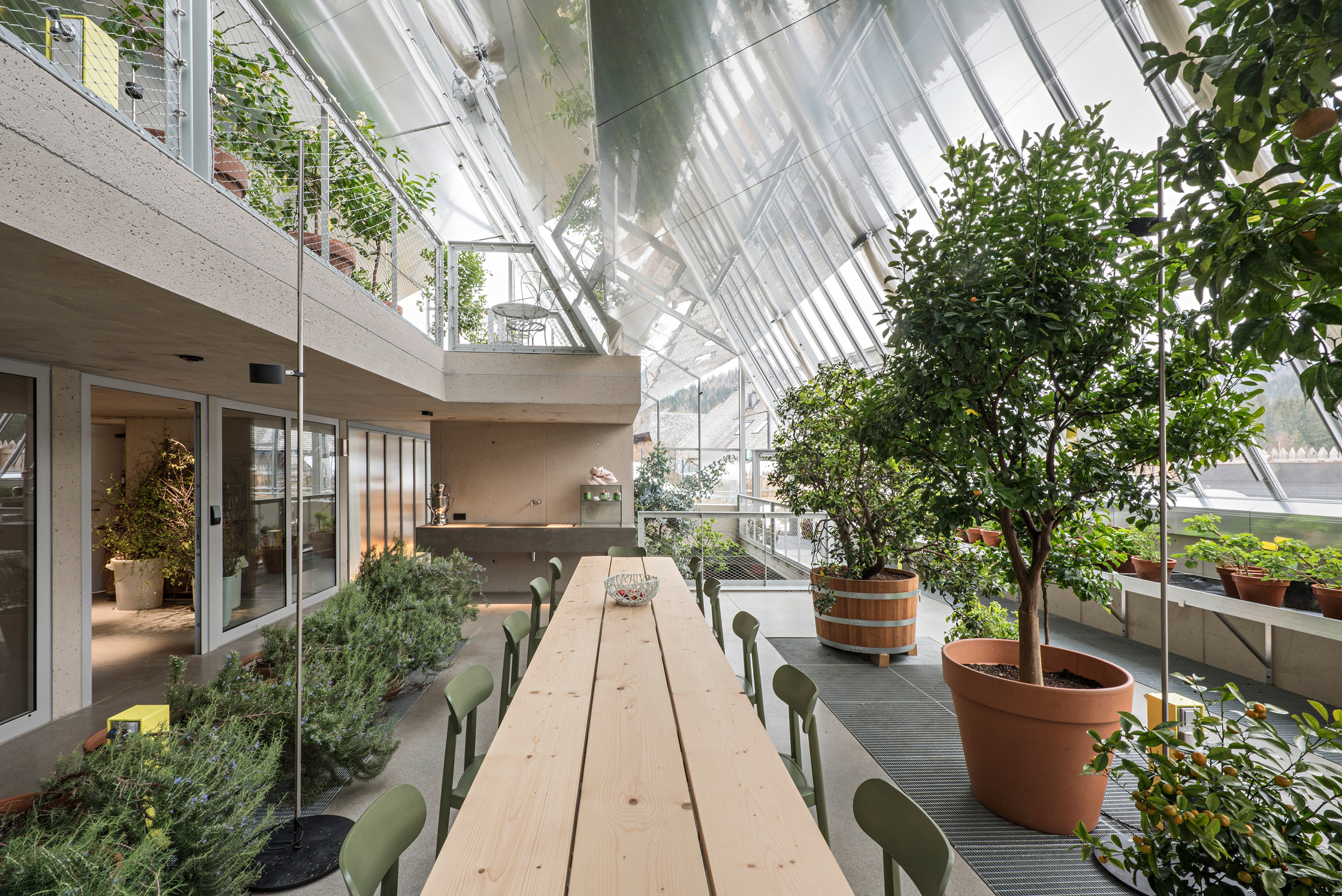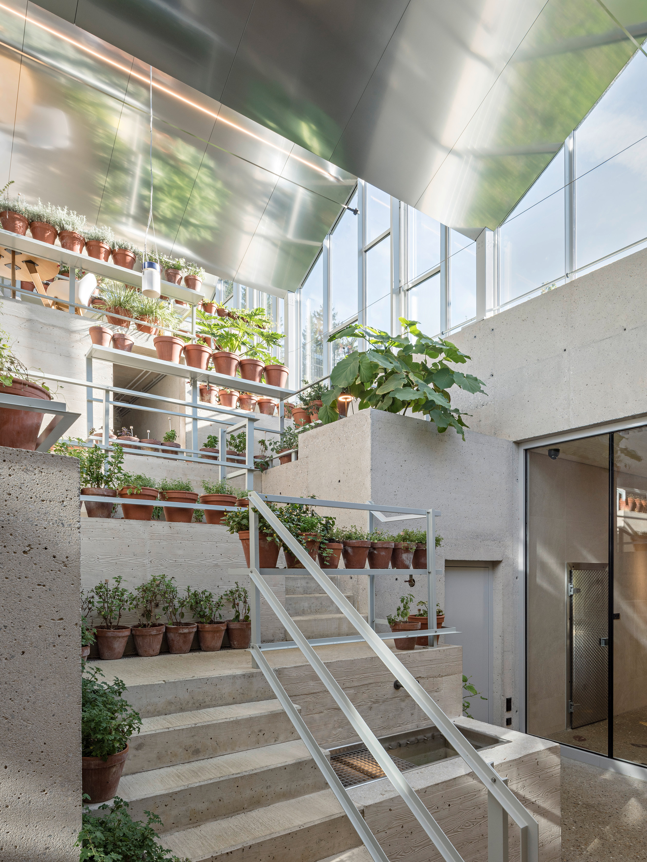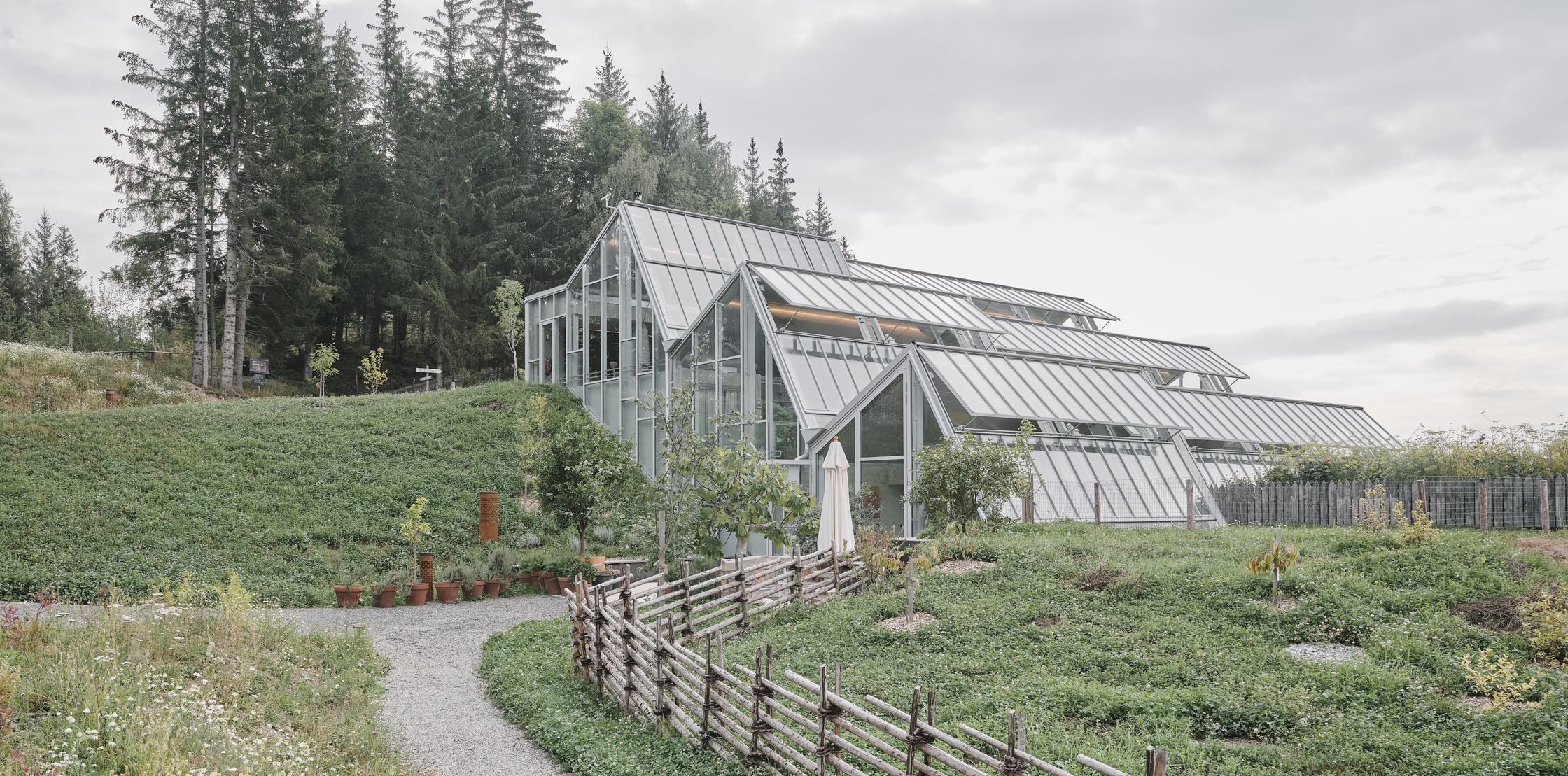Das warme Glashaus (ca. 22°) versorgt die Küche mit frischen Kräutern & Gewürzen und ist intimer Backstagebereich für das Pogusch-Team, in dem sich neue Ideen entwickeln lassen. Beide Glashäuser sind über Atrien mit dem darunterlegenden Küchen-Hinterland verbunden und werten dieses durch direktes Tageslicht auf. Diese große Welt im Verborgenen und im Hintergrund, die für das Wohl des Gastes verantwortlich ist, tritt im Postkartenbild kaum in Erscheinung. Doch unter der Grasnarbe befinden sich gut belichtete Arbeitsplätze mit hoher räumlicher Qualität.