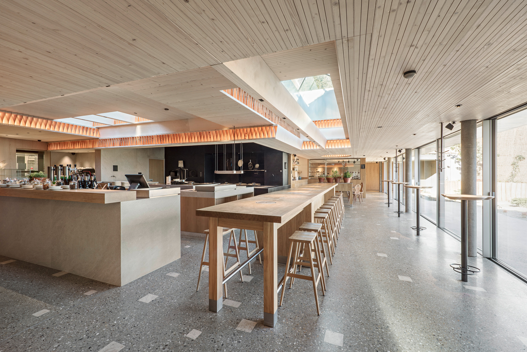 Die Schank und Feuerküche mit großem Grill als der für den Gast präsente Teil der Küche ist tagesabhängig hell und transparent oder atmosphärisch und dunkel vor dem Hintergrund des Grills: ein starker Raum im Herzen des Hauses. Hier kommt auch ein leichtes und zugleich hoch tragfähiges Holzbauelement zum Einsatz: eine Kielstegdecke. Bei alternierender Verlegerichtung werden jene Anschnitte sichtbar, die bei der Normanwendung verborgen bleiben. Die dünnen gebogenen Sperrholzplatten, die Ober- mit Untergurt verbinden, werden zum Lampenschirm des Gastbereichs umfunktioniert.