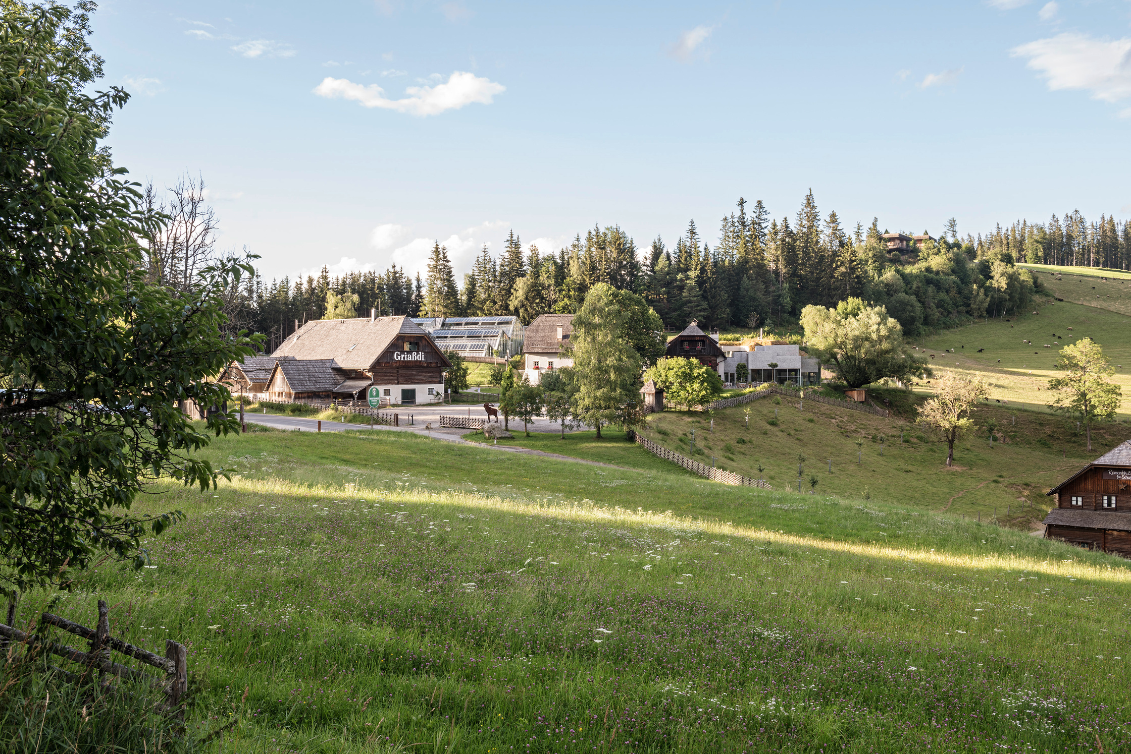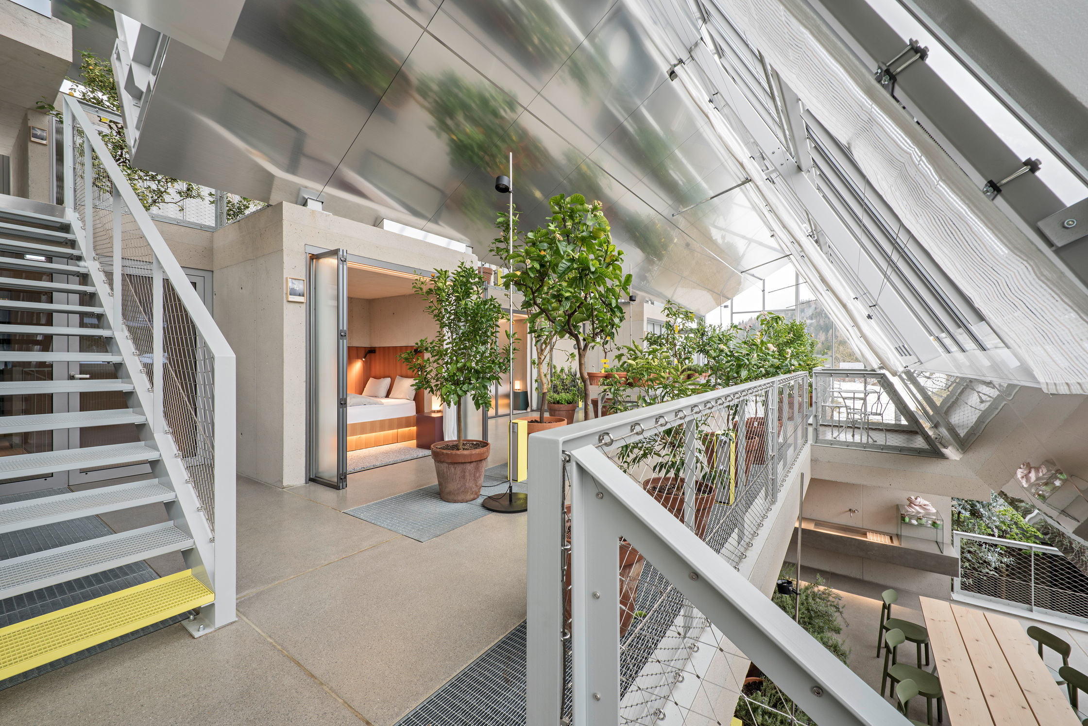 Glashäuser in dieser Höhenlage auf über 1.050 m.ü.A. stellen eine besondere Herausforderung dar. Enormer Forschungstrieb, in geringem Ausmaß Nutzpflanzenzucht und nicht zuletzt innovative, unkonventionelle Gästeunterbringung sind die inhaltlichen Schwerpunkte der Glashäuser.Es handelt sich um ein kaltes und ein warmes Glashaus, die jeweils unterschiedliche Aufgaben erfüllen. Das große, kalte Glashaus (Mindesttemperatur um den Gefrierpunkt) wird für ganzjährige Pflanzenzucht verwendet. Hier gibt es des Weiteren unkonventionelle Übernachtungsmöglichkeiten für unkonventionelle Gäste: die Kabanen. Hinter dem kalten Glashaus, unterdem Hang, liegt eine spezielle Badelandschaft mit Sauna. Im obersten Geschoss hingegen befindet sich ein Kaminzimmer.