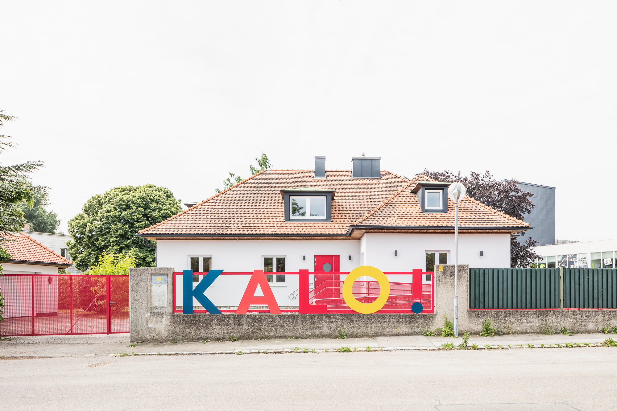 Den Architekten war es wichtig, den wohnlichen Charakter des Hauses zu wahren. Die Holztreppe blieb erhalten, das zweite Fenster der Halle wurde zum neuen Eingang verlängert. Er liegt nun also an der Gürtelstraße und ist vollkommen barrierefrei. KALO! steht in Blau, Zinnober-, Dunkelrot und Sonnengelb in einem rotgerahmten, gläsernen Feld im Zaun, die alten Pfeiler und weiteren Latten blieben. Eine rote Rampe führt im Zick-Zack zum großzügigen Podest vor der roten Tür mit dem runden Guckloch.