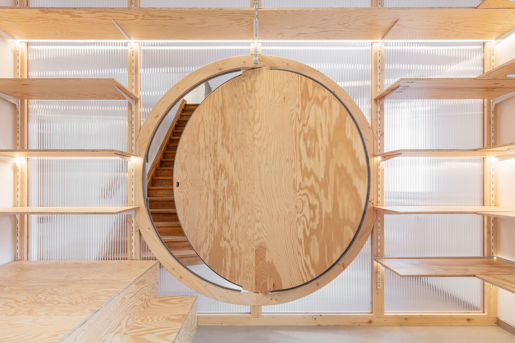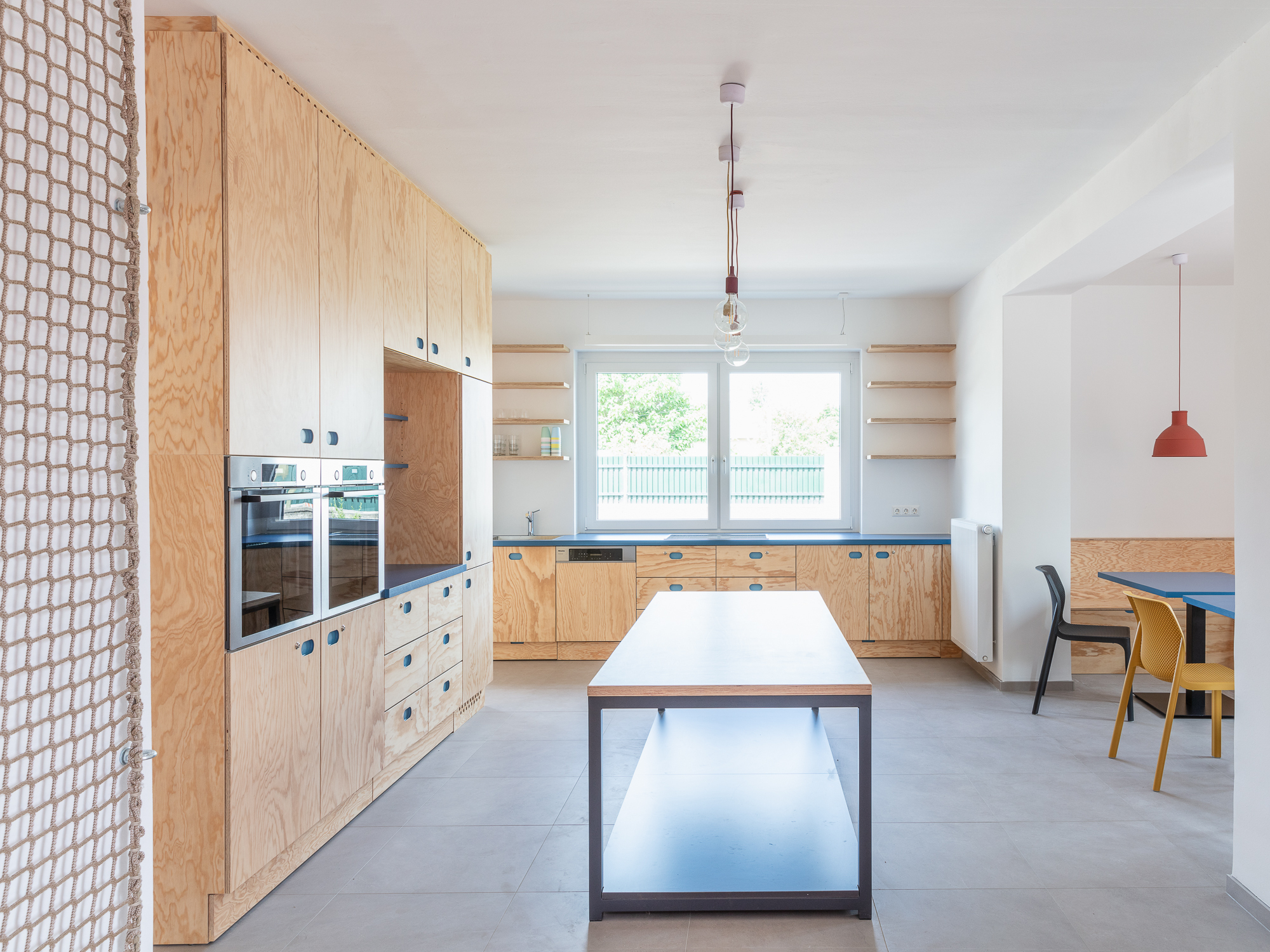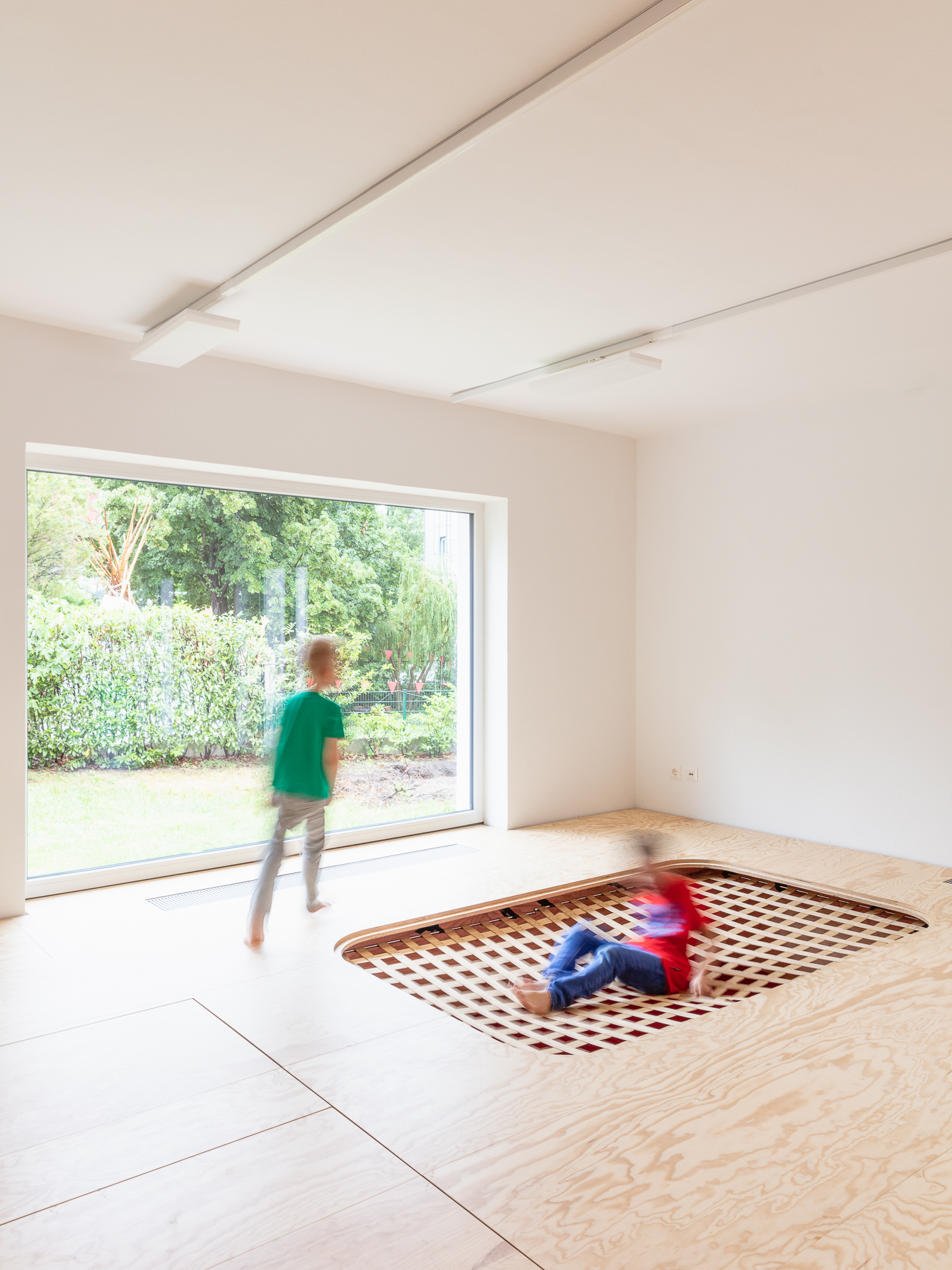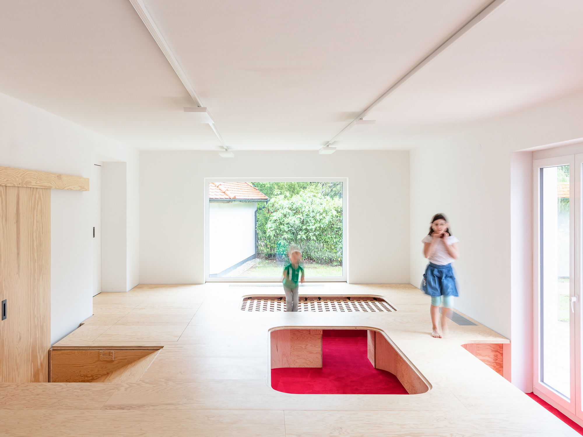 Das Innere ist liebevoll als räumliches Umfeld zum kindlichen Empowerment gestaltet. Ein 60 cm hoher Doppelboden aus Seekiefernsperrholz macht das frühere Wohnzimmer zum Abenteuerlabor. In den Boden sind vier Öffnungen eingeschnitten, die man mit Seekiefersperrholzplatten abdecken kann. Öffnet man sie, tun sich 60 cm tiefe Mulden mit rotem Teppichboden auf, von denen Maulwurfsgänge in den Zwischenraum führen. Für die kleinen ist das ein Abenteuer, für größere macht die Sitzmulde den Boden zum Tisch. Der Netzschlauch wird zur Kindertreppe, im Netz, das über den Durchbruch gespannt ist, kann man hüpfen, springen, spielen. Im Dachraum gibt es ein Malatelier und eine Werkstatt.