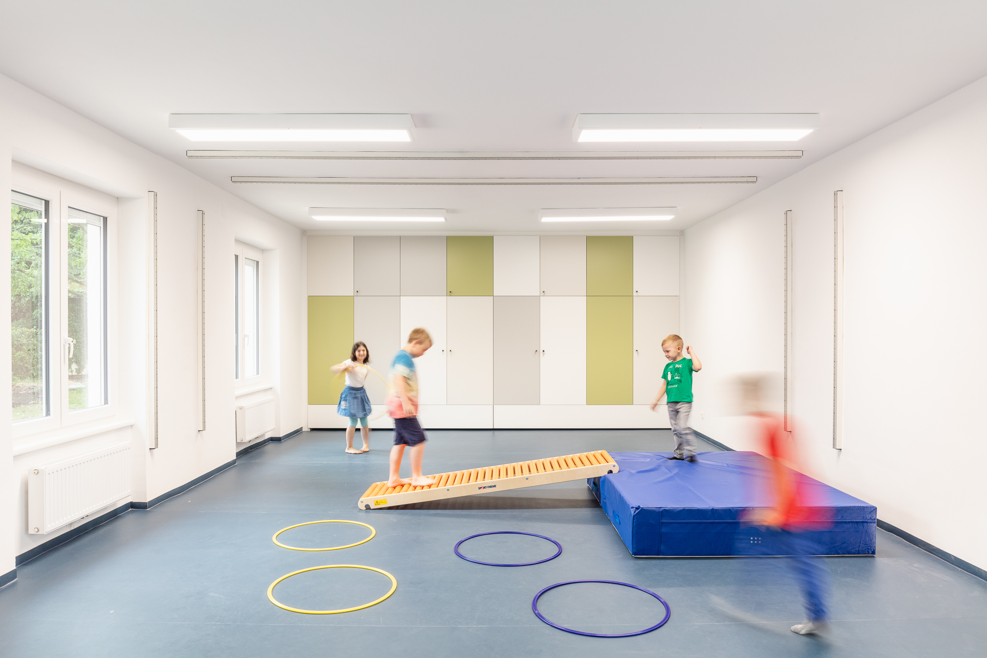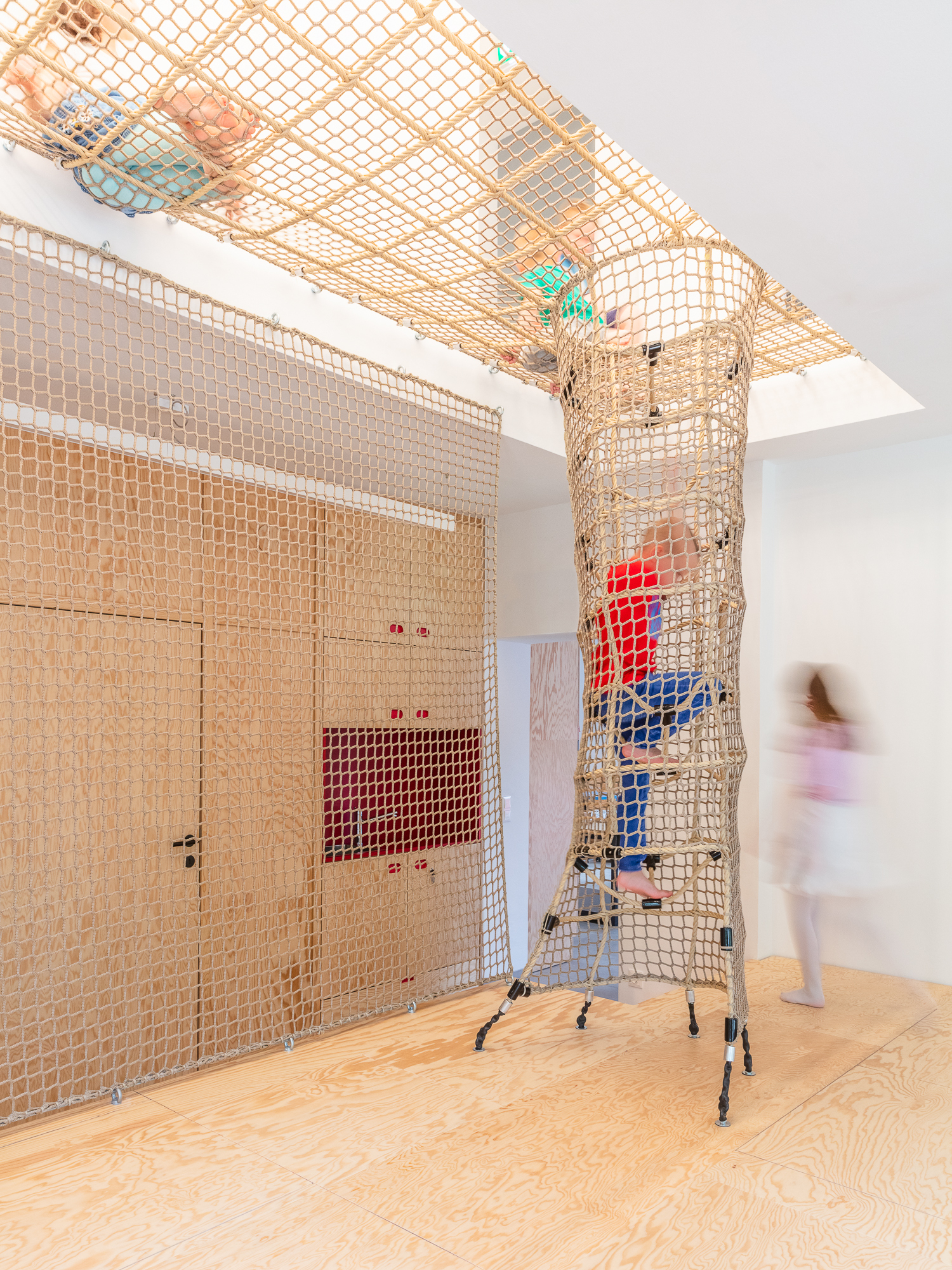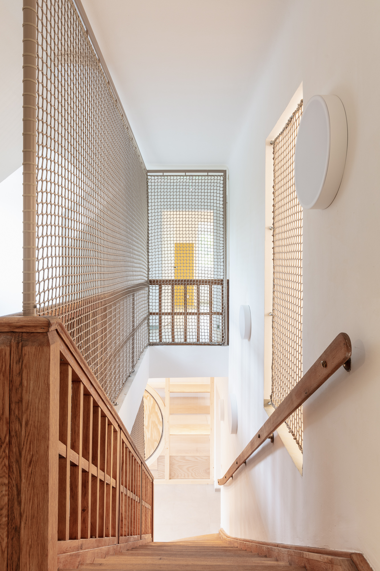 „Dieses Projekt hatte sehr viele Facetten“, sagt Sammer. „Wir arbeiteten sehr rauminstallativ. Alles sollte multifunktional sein.“ Nina Panozzo und Karin Blum standen nicht nur dahinter, sie gingen mit. Natürlich erfüllt dieses Haus alle OIB-Richtlinien (OIB = Österreichisches Intitut für Bautechnik) und Sicherheitsauflagen für Kindereinrichtungen. So müssen Treppengeländer mindestens 1,10 Meter hoch sein. Alte Bestandstreppen erfüllen das so gut wie nie, ASAP spannten ein raumhohes Auffangnetz vor das Geländer und stellten in der Halle eine Bank davor. So wird das Netz zur Garderobe, auf der jedes Kind in jeder Höhe seinen Mantel aufhängen kann. Lösungen wie diese sind hier viele zu finden. Sie gelingen nur, wenn alle an einem Strang ziehen. Die Stadt, die Nutzer und die Architekten.