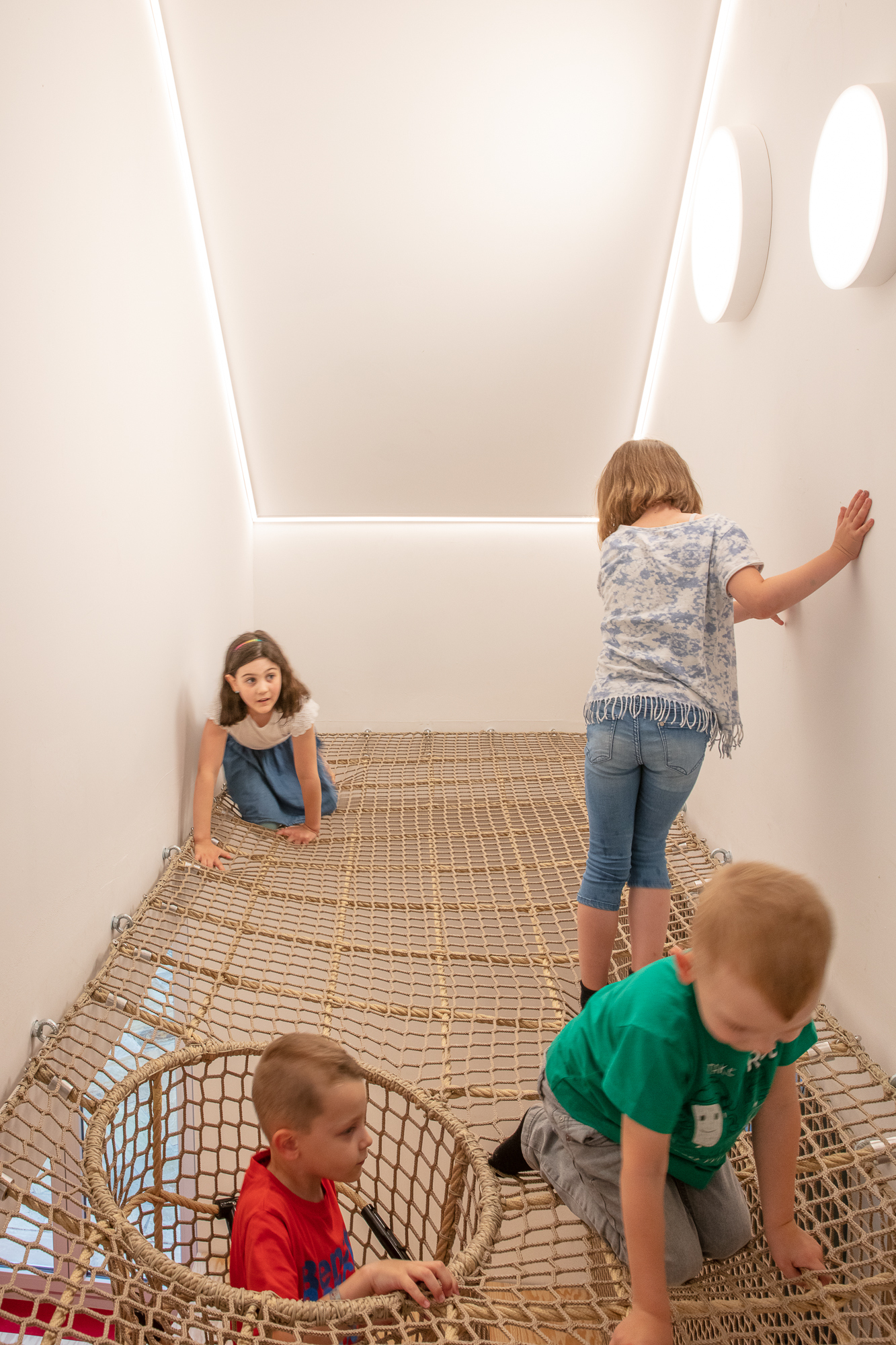 Das Budget verschonte die alten Ziegelmauern und selbst das Dach vor Vollwärmeschutz, dafür sind alle Fenster ausgetauscht und thermisch verbessert. Ein paar Zwischenwände wurden abgerissen, ein paar Fensteröffnungen verändert, ein neuer Deckendurchbruch geschaffen. „Wir wollten den Bestand aufbrechen, um Überraschungselemente einzubringen“, sagt Sammer. Dieser Durchbruch erfolgte im System des Bestands. Aus dessen Fertigteildecken wurde ein Deckenfeld entfernt und stattdessen ein Netz eingehängt, von dem ein runder Netzschlauch bis in das darunterliegende Abenteuerlabor im Erdgeschoss führt.