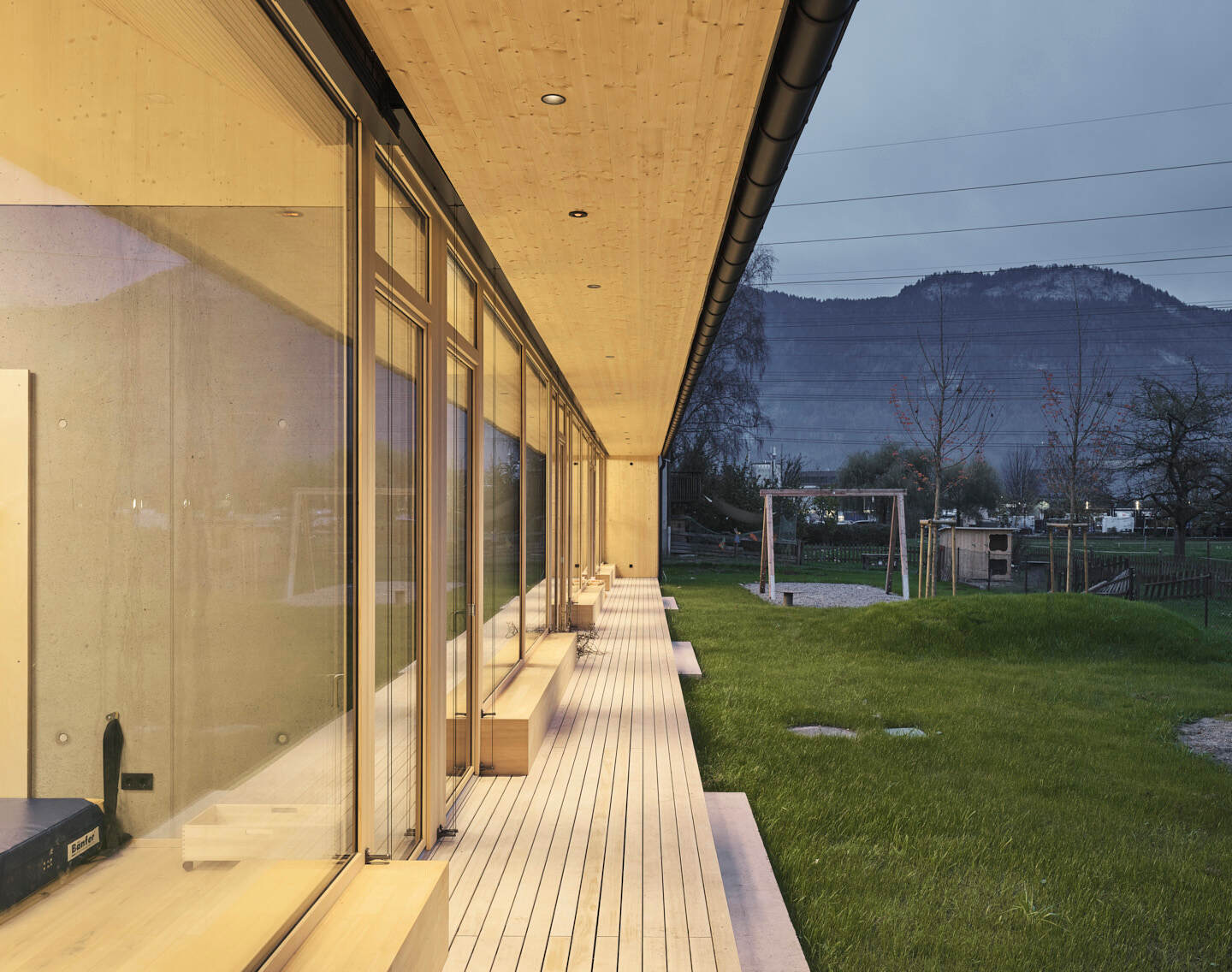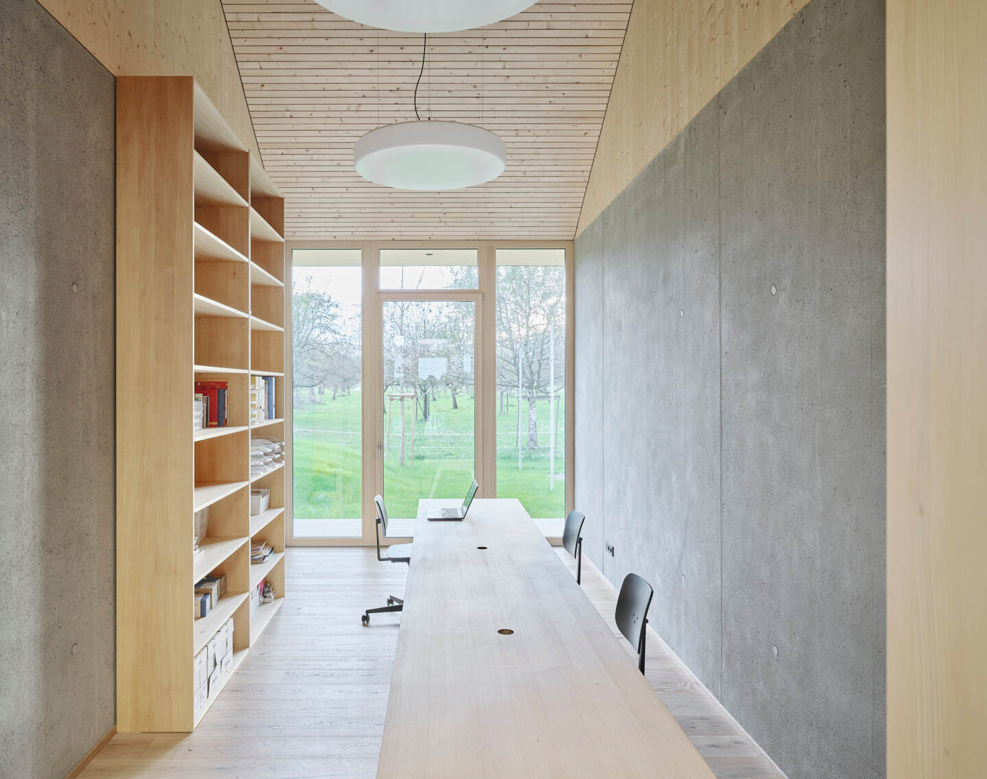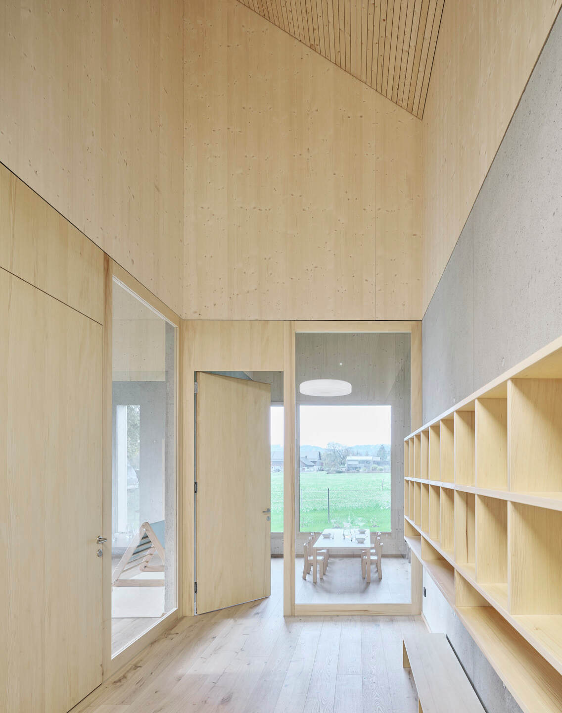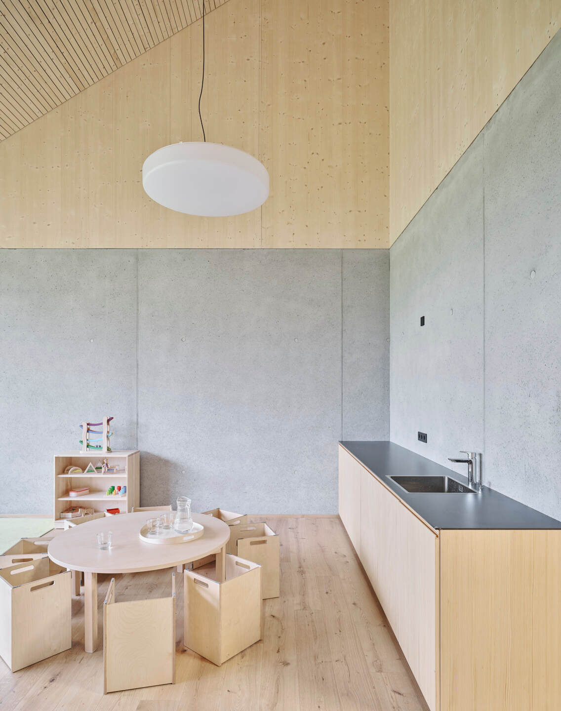 Die bis Niveau 3,15 m betonierten Wände reduzieren den Energiebedarf des gesamten Gebäudes. Sie können über Nacht abkühlen und tagsüber überschüssige Wärme aus dem Raum abführen.
