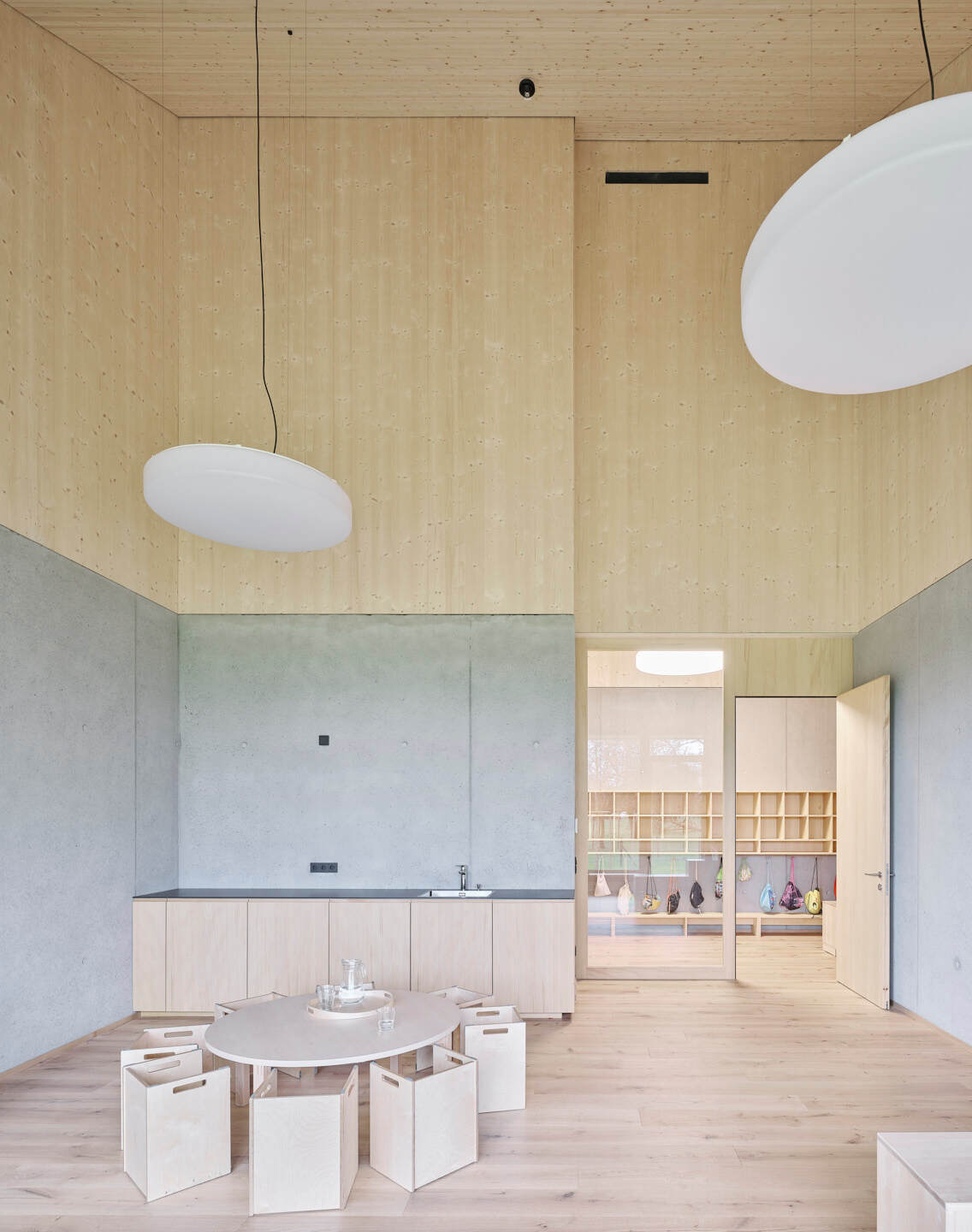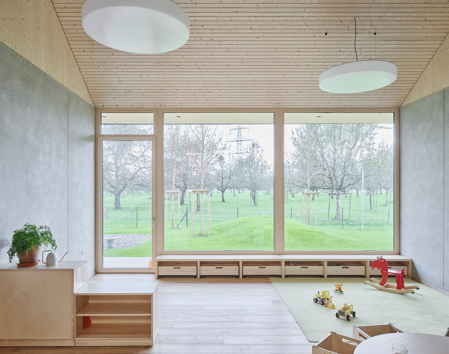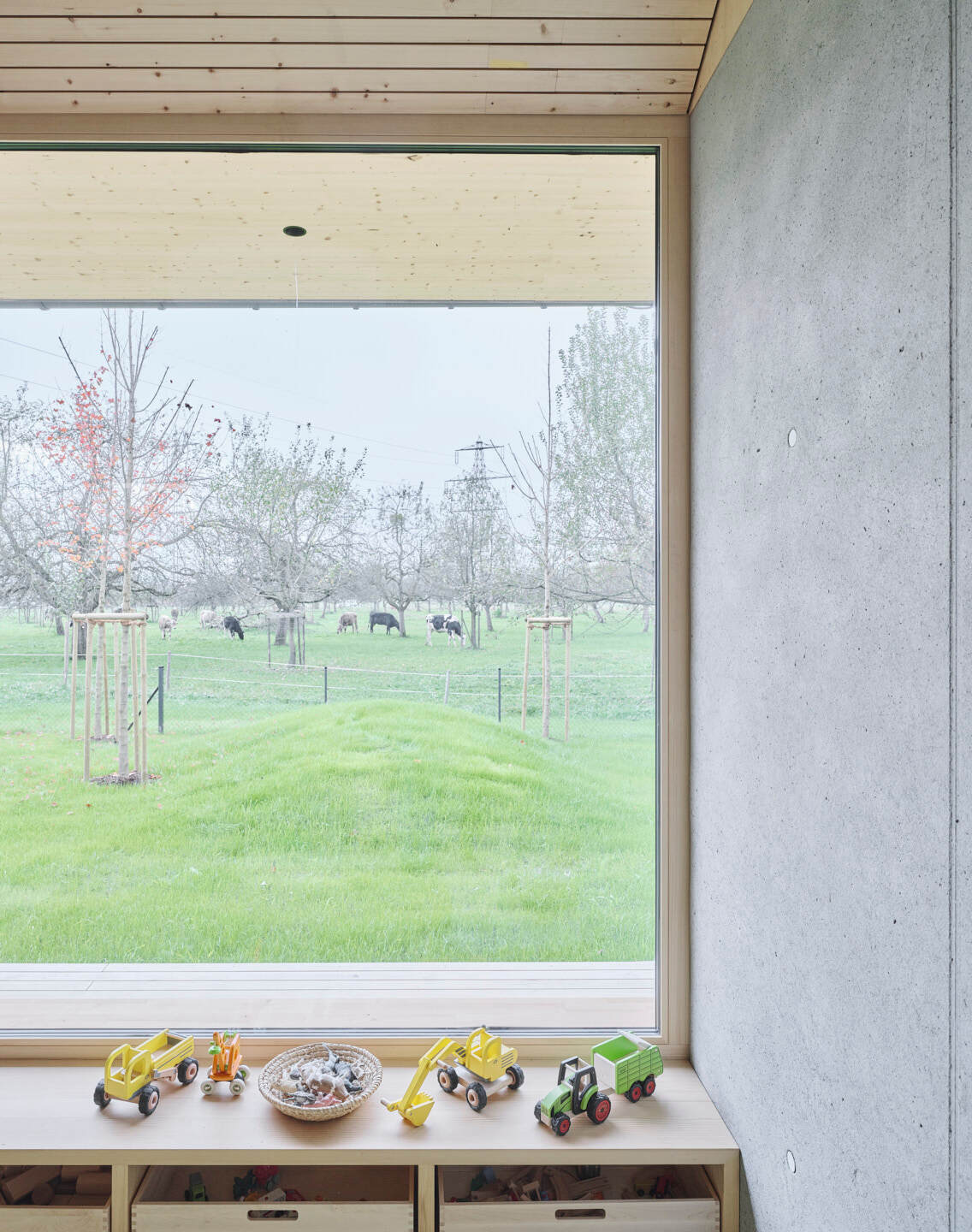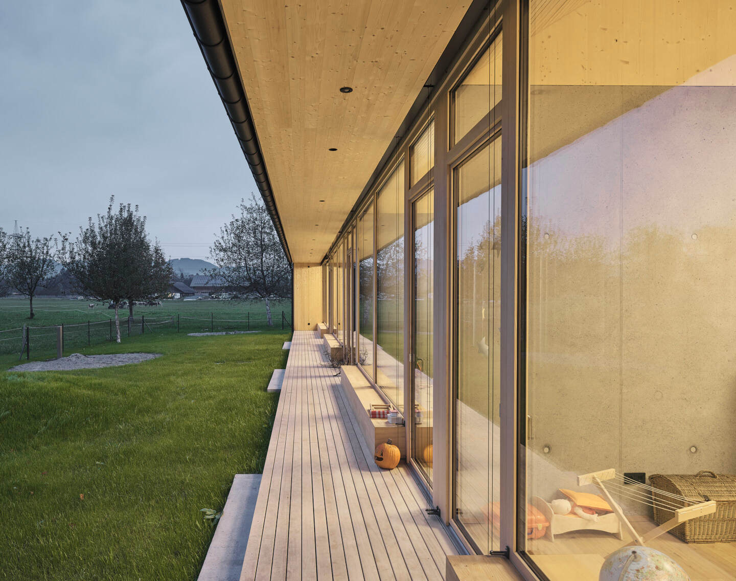 Die bis Niveau 3,15 m betonierten Wände reduzieren den Energiebedarf des gesamten Gebäudes. Sie können über Nacht abkühlen und tagsüber überschüssige Wärme aus dem Raum abführen.