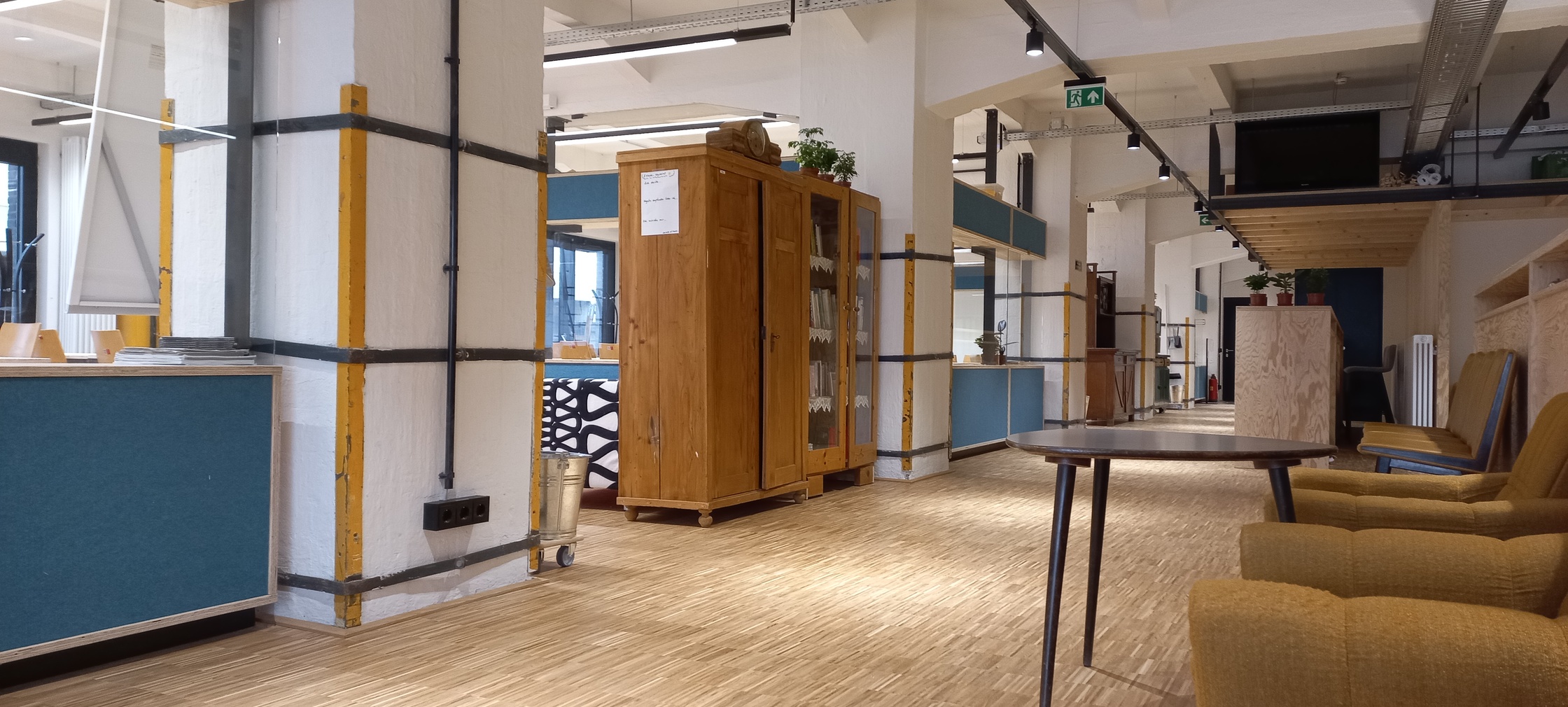 Über ein paar Stufen gelangt man vom Innenhof der Tabakfabrik auf eine vorgelagerte Terrasse, von dort in ein riesiges Loft, das lediglich von ein paar gläsernen Trennwänden und simplen Tischlereinbauten aus Schichtsperrholz mehr atmosphärisch denn akustisch zoniert und gegliedert wird. Dazwischen immer wieder Bauernschränke, Ohrenfauteuils, Thonet-Sessel und diverse Kleinmöbel, die das Mid-Century-Herz höherschlagen lassen. Es ist, als würde man einen Coworking-Space oder eine abgerockte Berliner Werbeagentur durchschreiten.