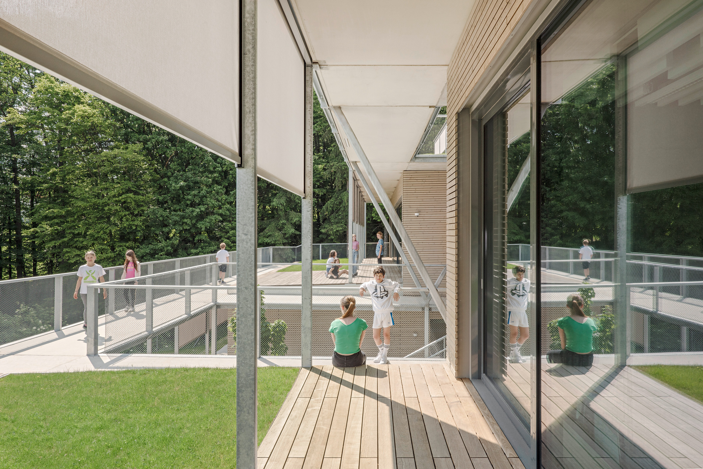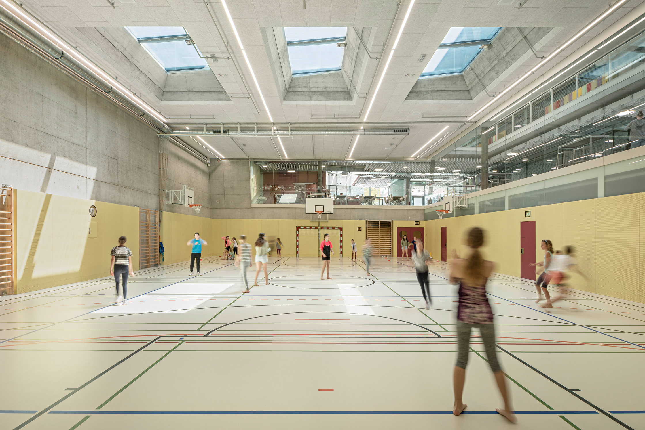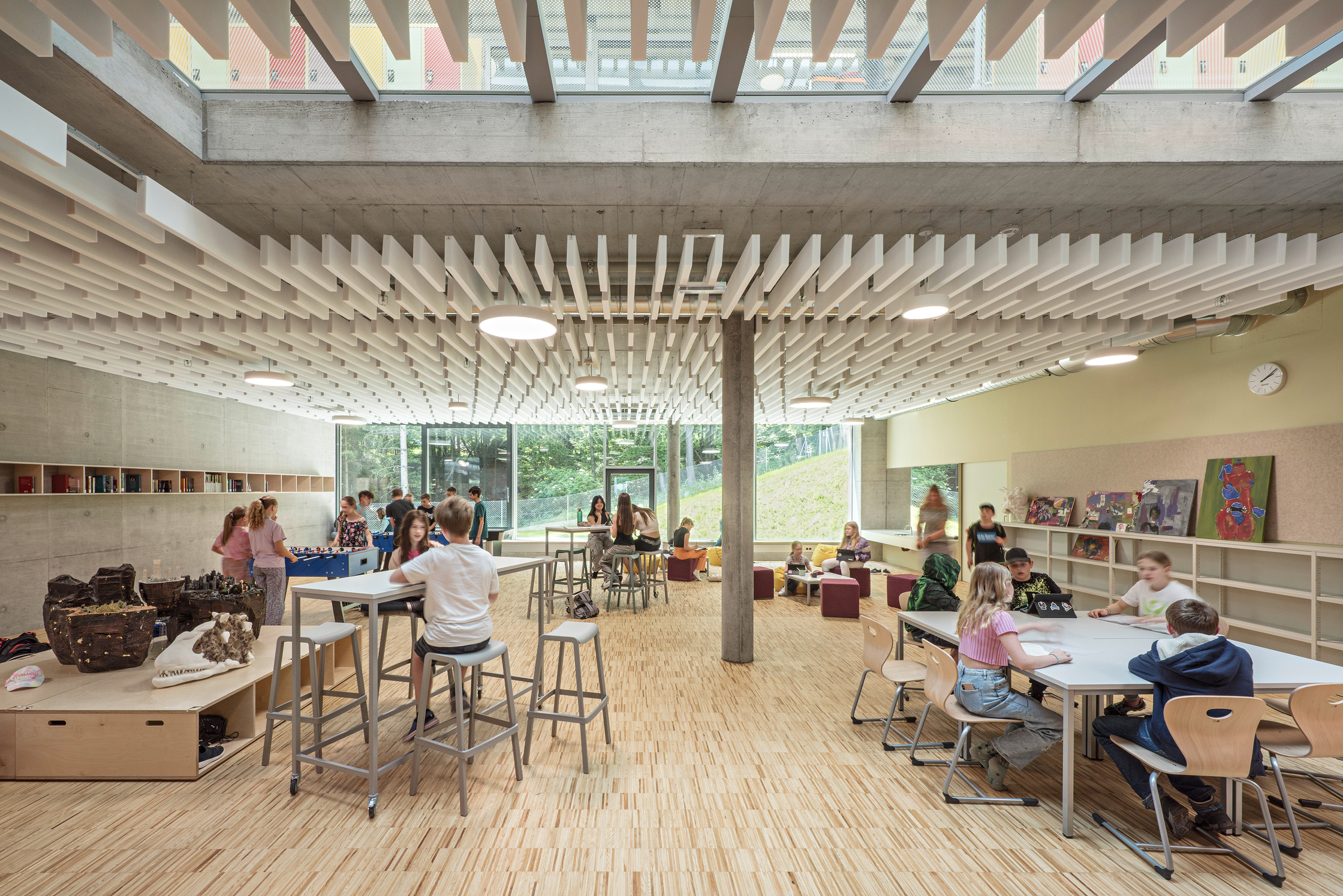 Typologisch verbindet das Projekt einen Terrassentyp mit einem hangseitigen Kammtyp, bei dem jeweils vier Klassenräume einen offenen Hof begrenzen. Durch verschiebbare Wände eignet sich der Grundriss sowohl für ein konventionelles Stammklassensystem, wie es derzeit betrieben wird, als auch für ein Departmentsystem.
