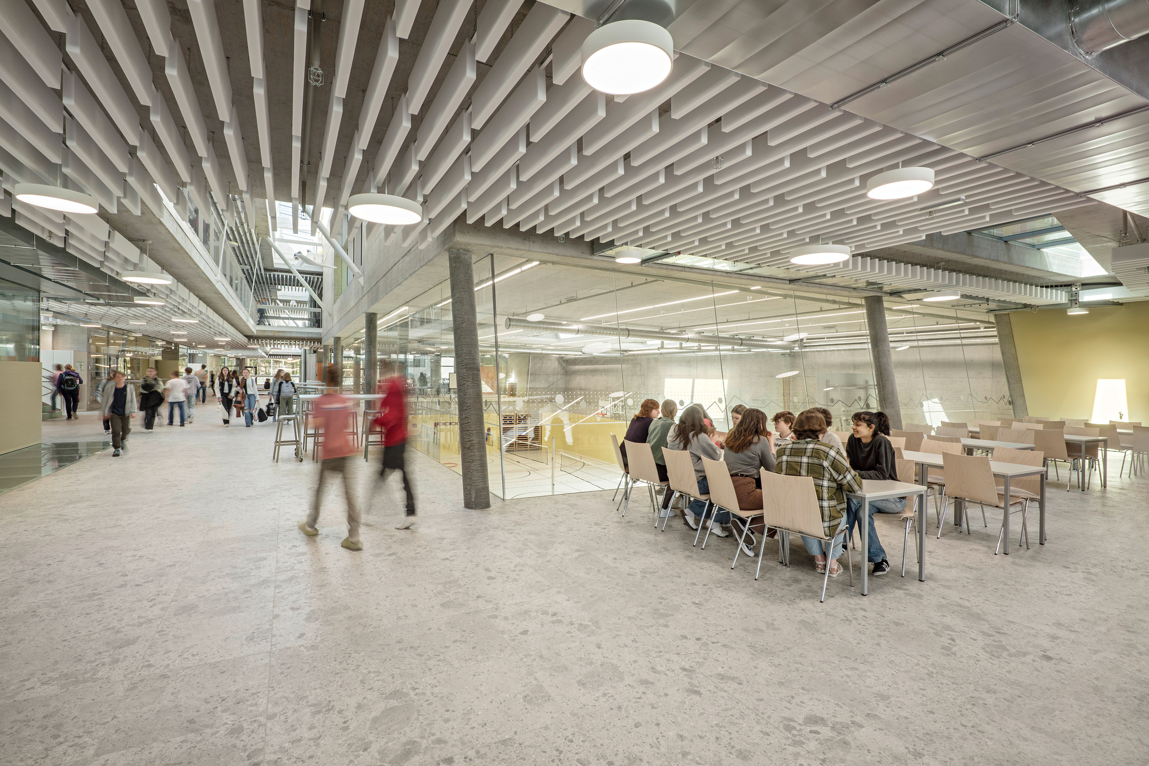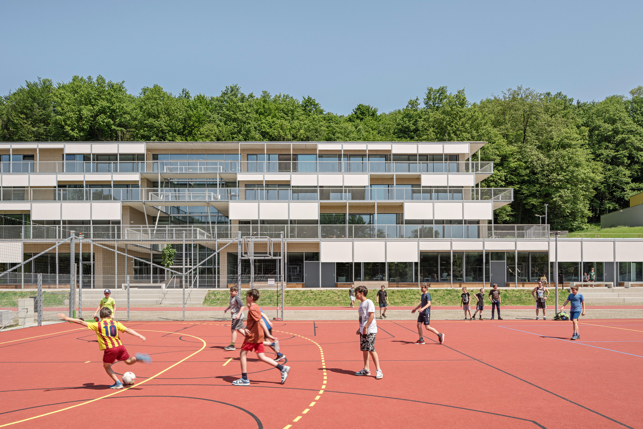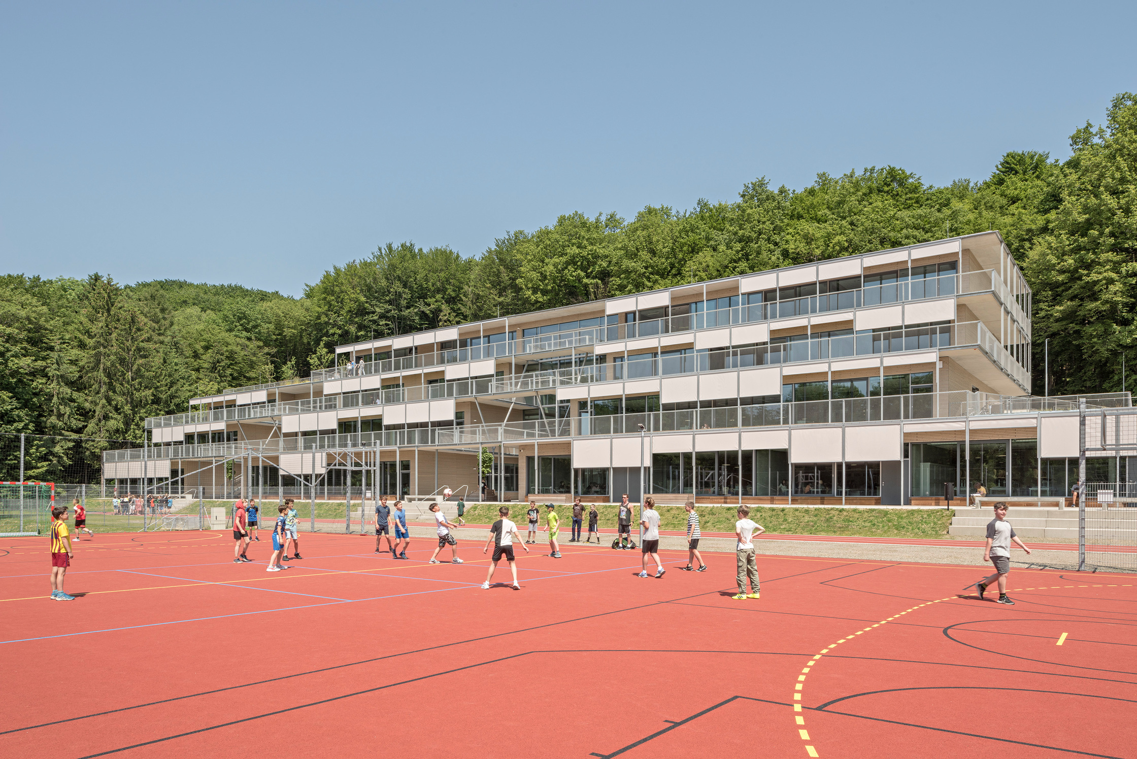 Typologisch verbindet das Projekt einen Terrassentyp mit einem hangseitigen Kammtyp, bei dem jeweils vier Klassenräume einen offenen Hof begrenzen. Durch verschiebbare Wände eignet sich der Grundriss sowohl für ein konventionelles Stammklassensystem, wie es derzeit betrieben wird, als auch für ein Departmentsystem.