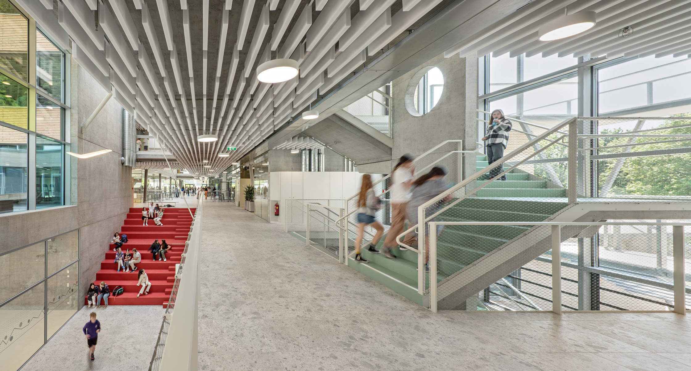 Im Inneren wirkt die Schule wie eine gut gegliederte Landschaft mit teilweise sehr hohen, von allen Seiten belichteten Bewegungsräumen mit Längs- und Querblick ins umgebende Grün, das freundlich zurückschaut. Das Farbkonzept der Künstler Gustav Deutsch und Hanna Schimek bereichert diesen Blick durch farbige Gläser, die mit dezenten grünen und braunen Farbtönen wie eine zweite Natur wirken. Konstruktiv sind diese über weite Strecken stützenfreien Räume eine Meisterleistung, für die die Ingenieure von Werkraum verantwortlich zeichnen.